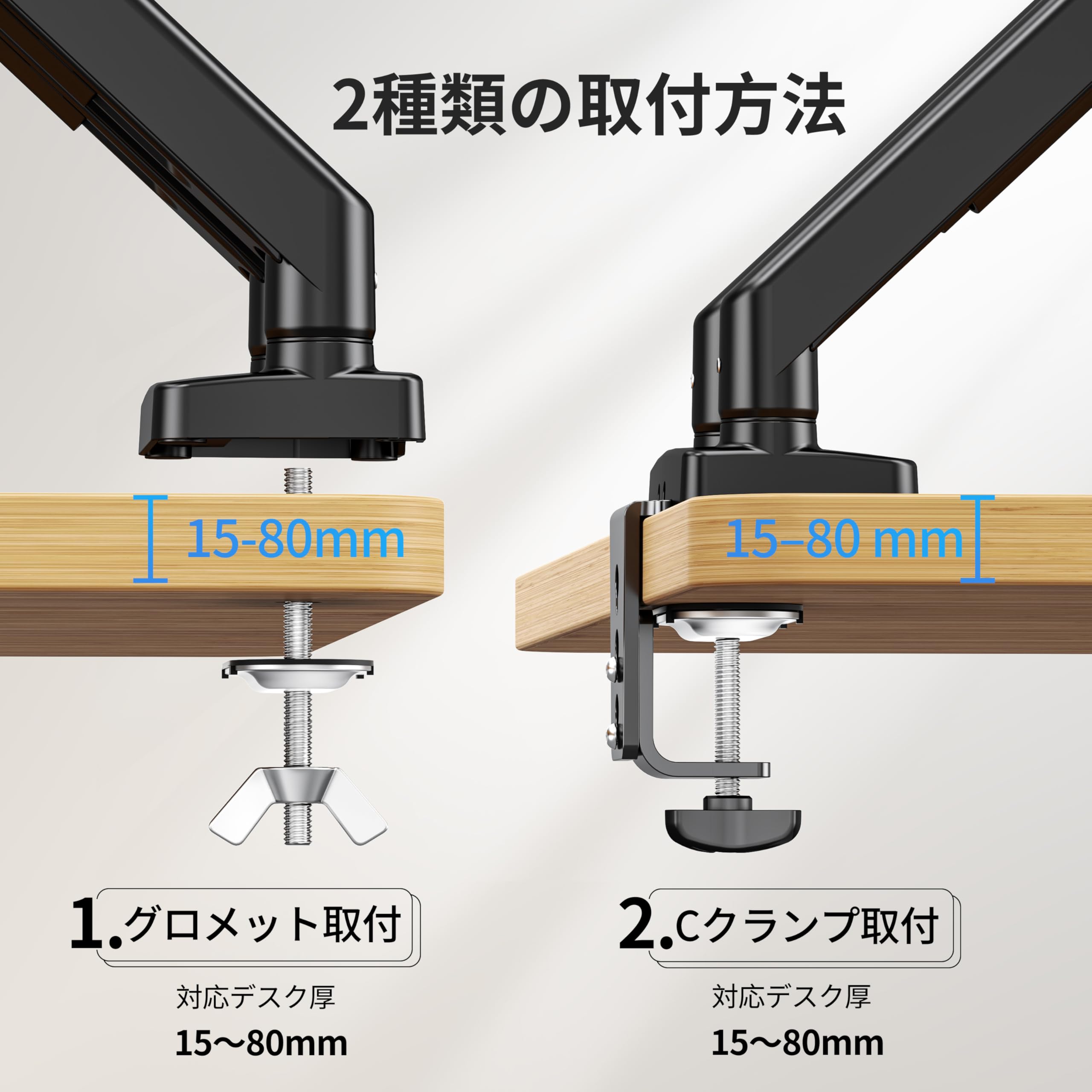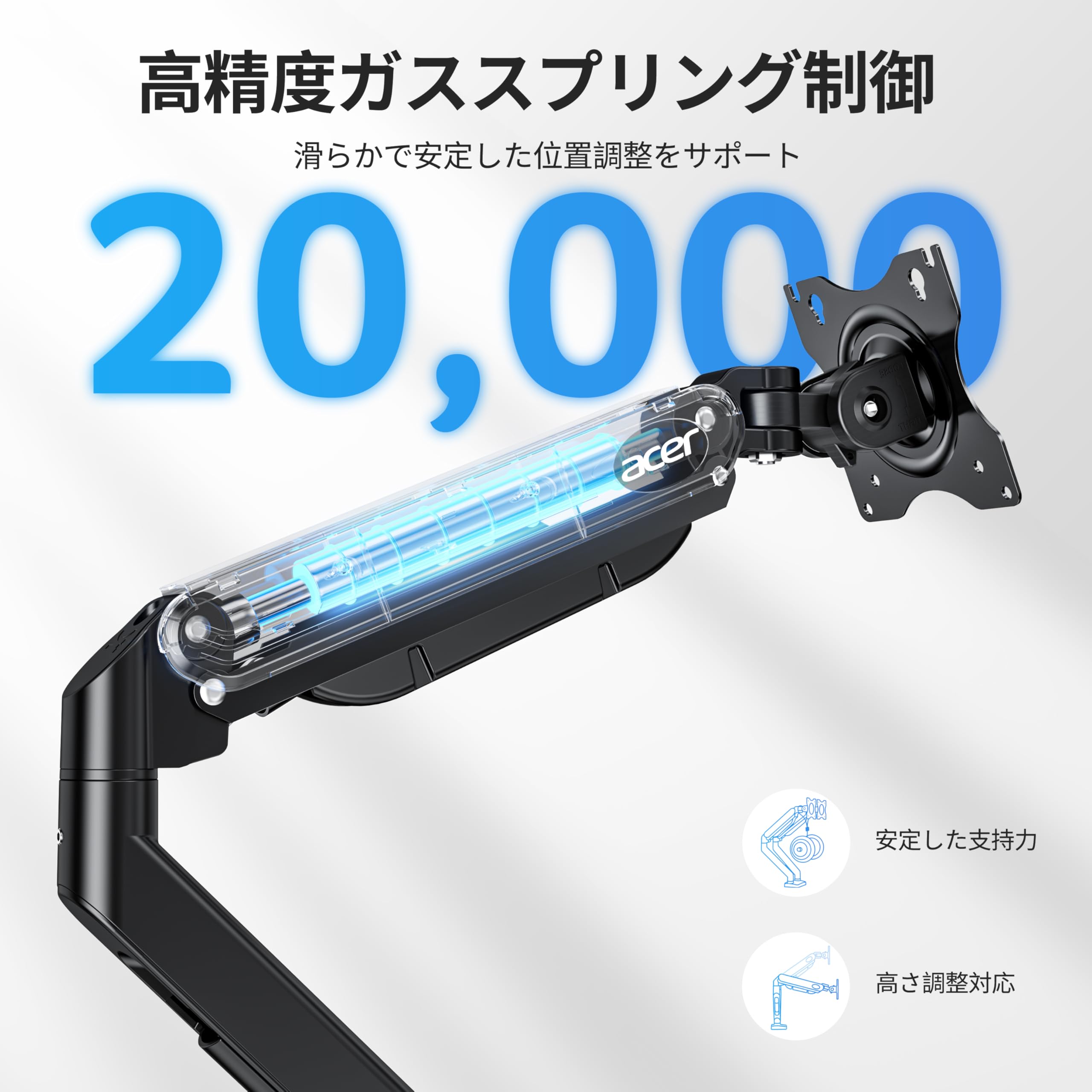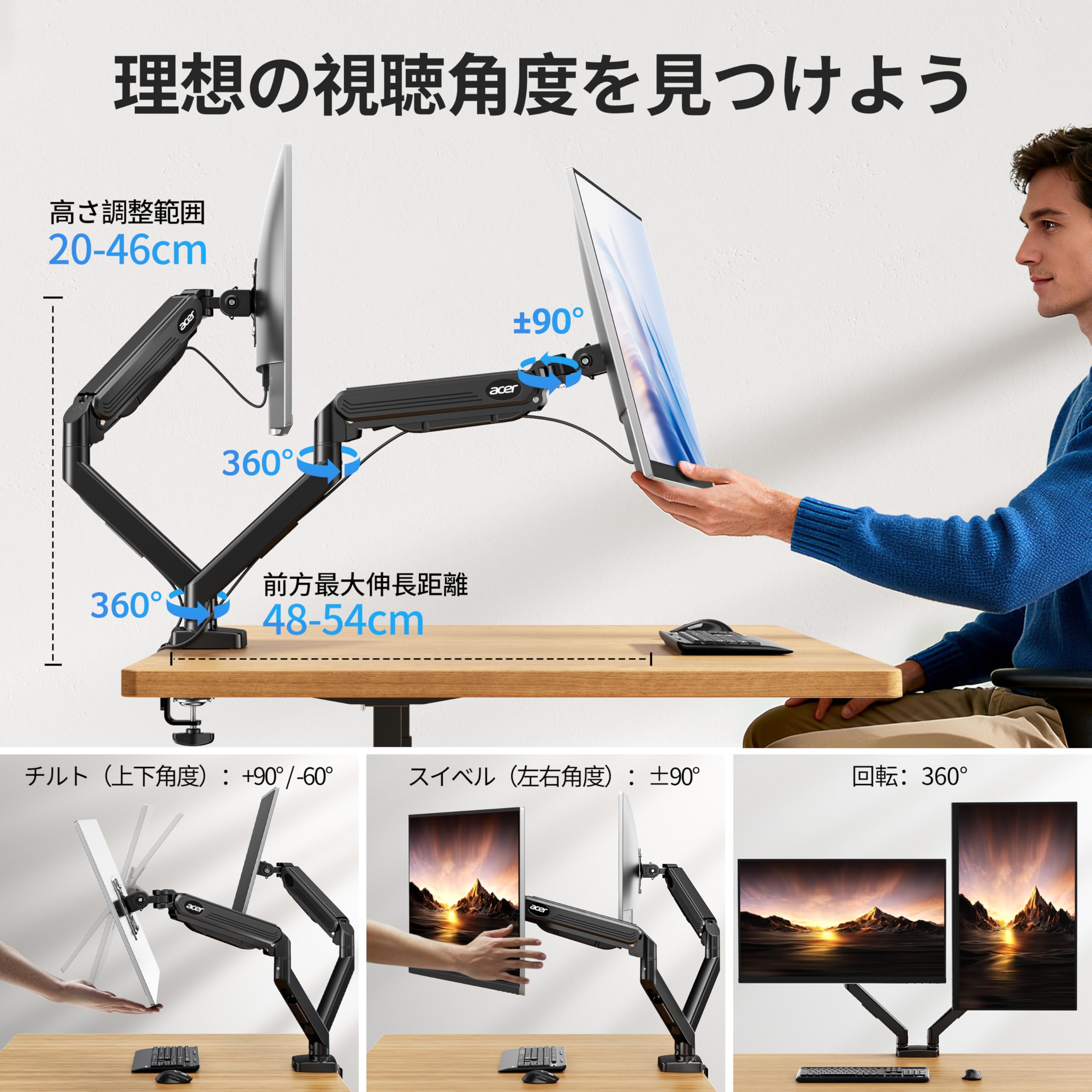 Acer モニターアーム デュアル 2画面【17~32インチ対応】デュアルモニターアーム PC 耐荷重各2.2~9kg ガス圧式 グロメット式&クランプ式 VESA 75 / 100mm 上下左右の角度・高さを多角度調節可能 ケープル収納 セットアップも簡単