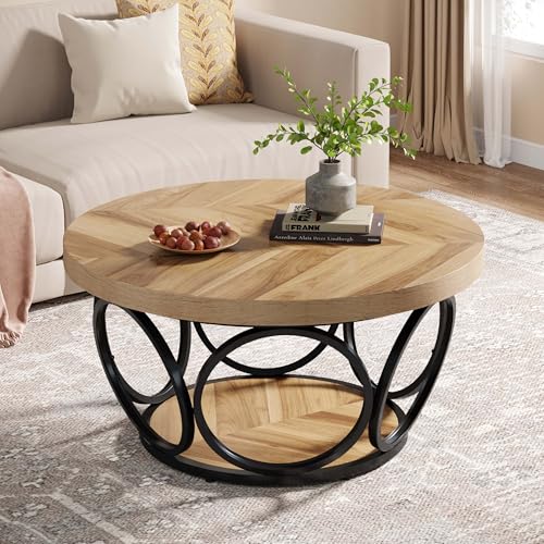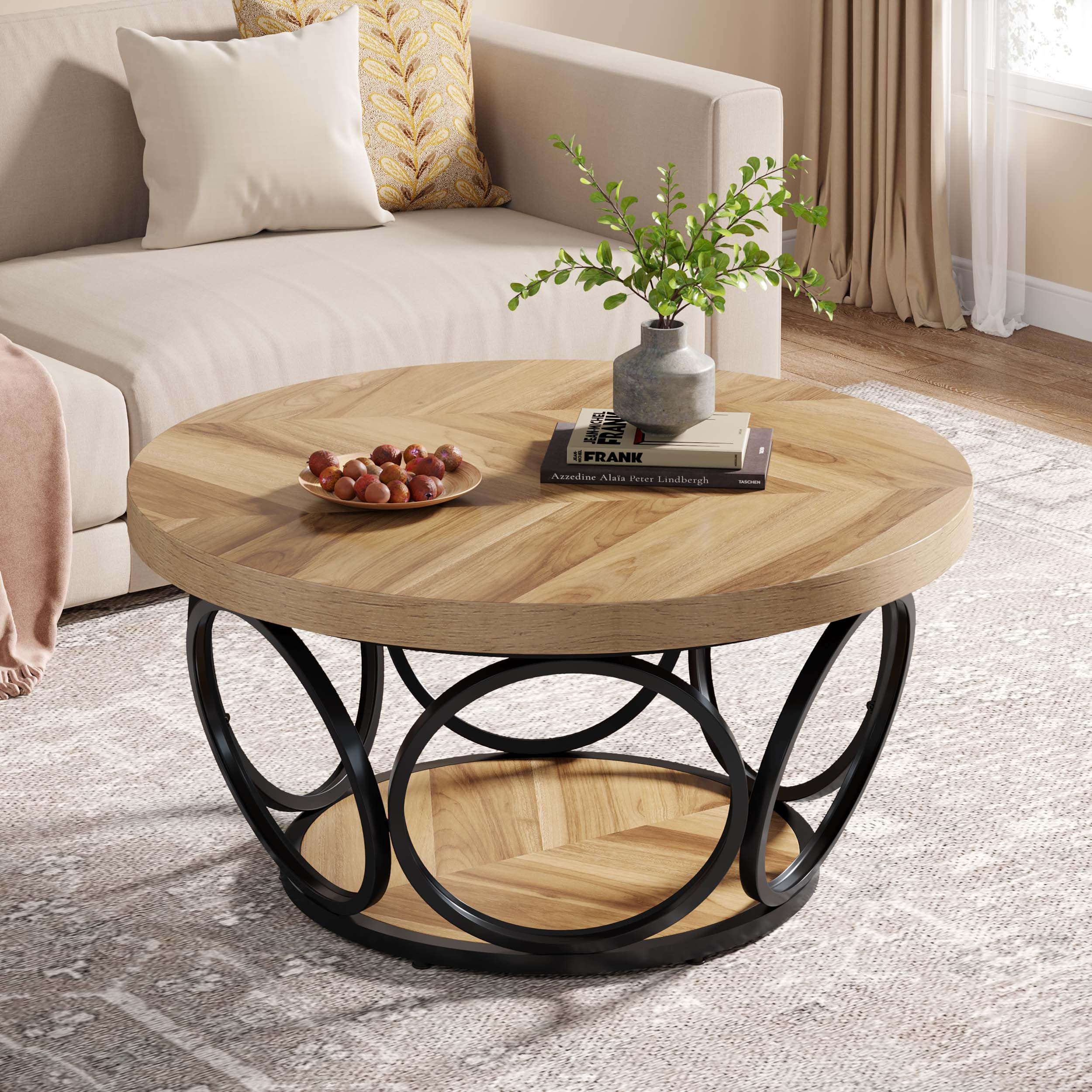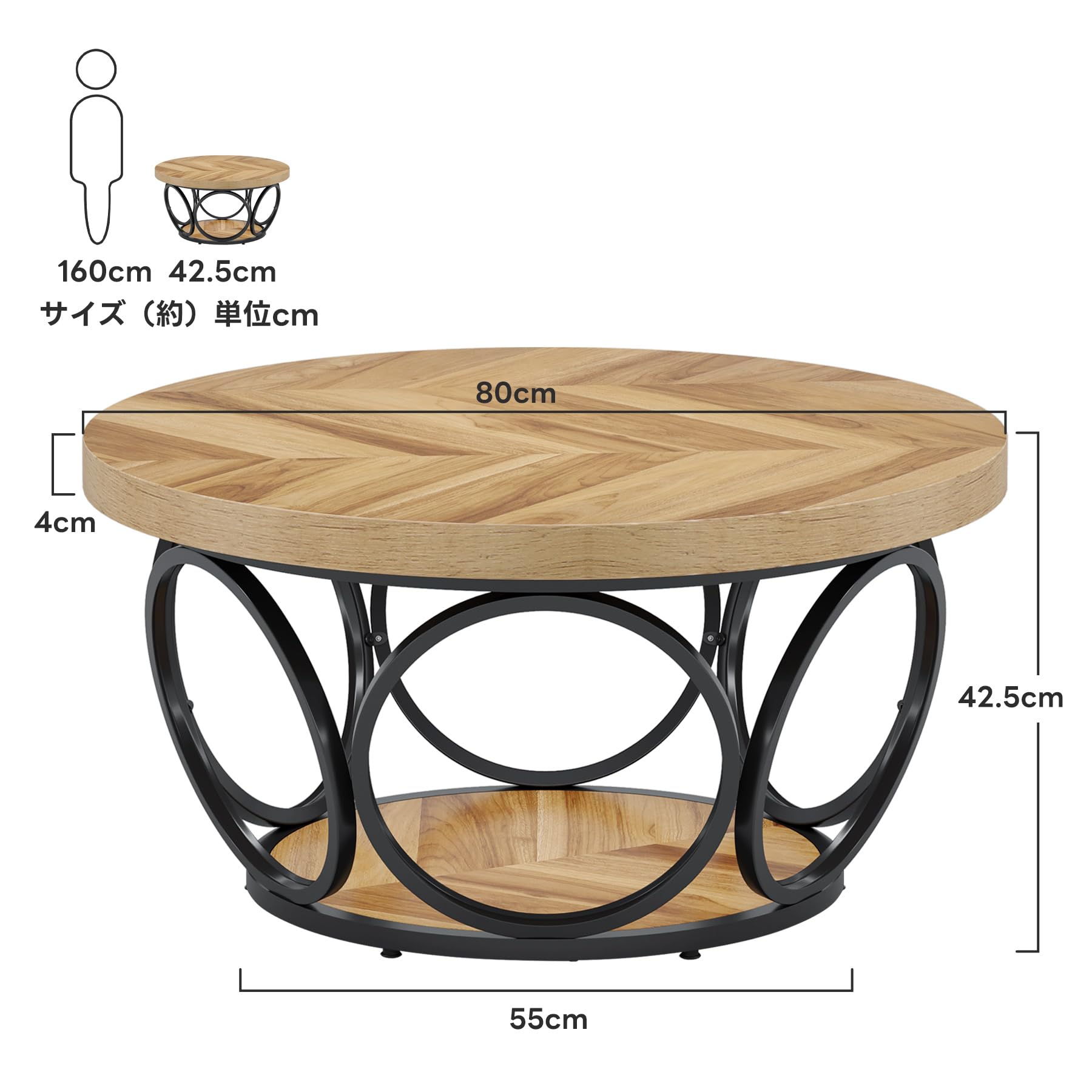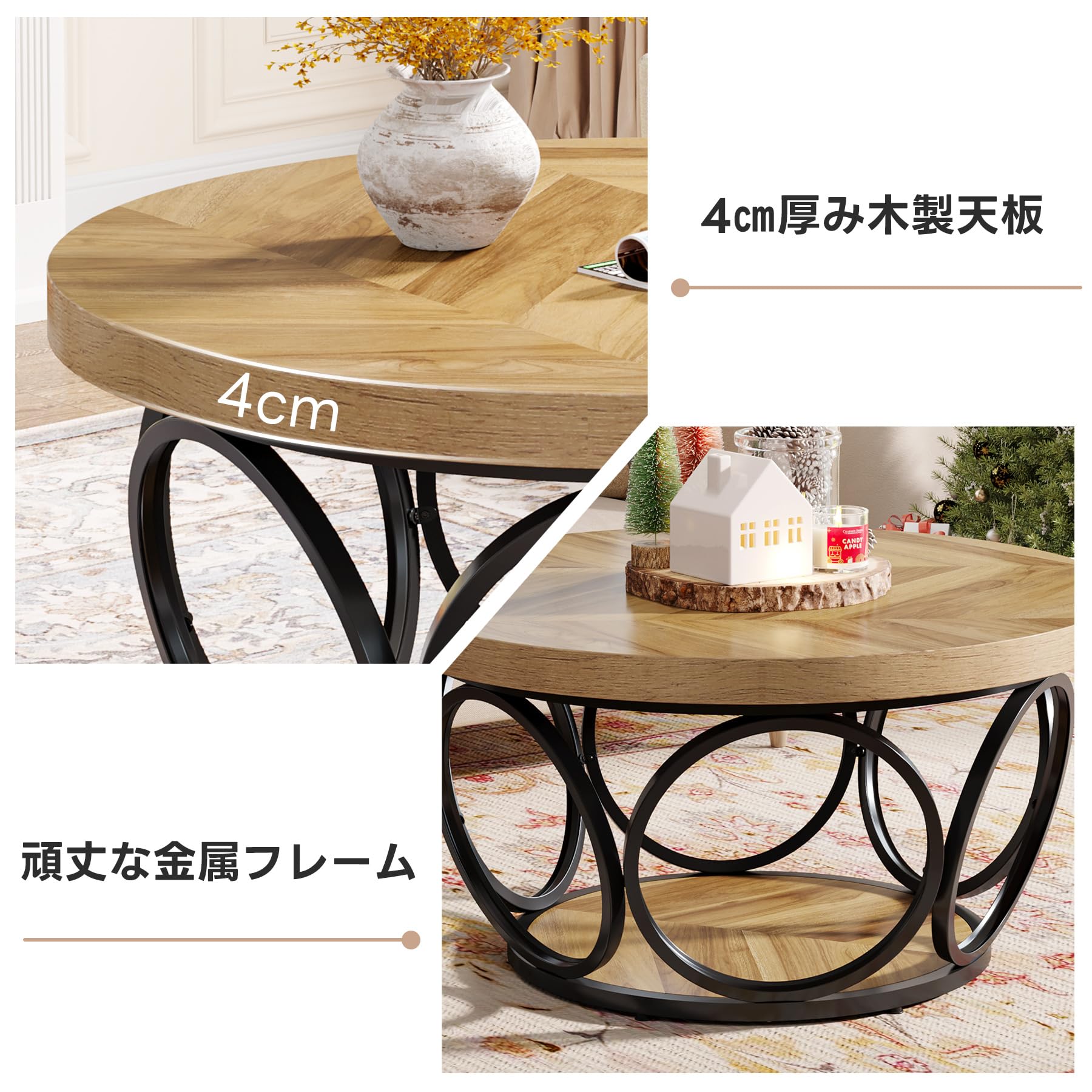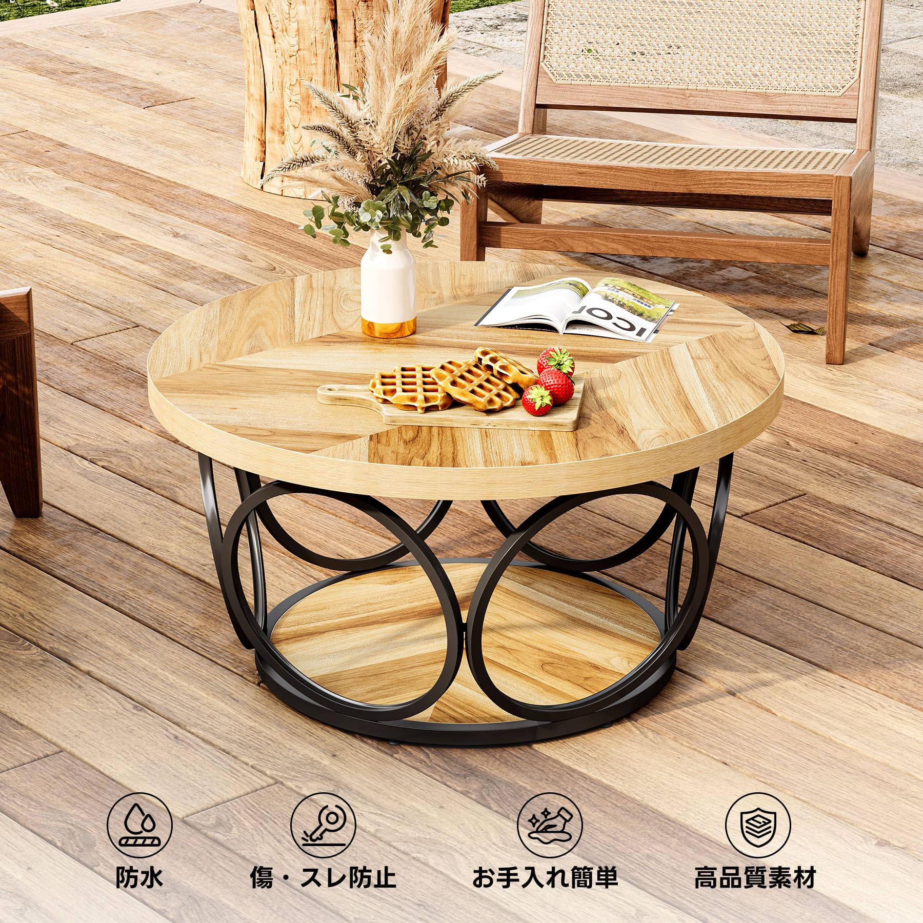 リビングルーム用コーヒーテーブル 31.5インチ ラウンドウッドセンターテーブル ファームハウス 大きな円形のコーヒーテーブル 2段収納付き モダンでシンプルなブラウンティーテーブル