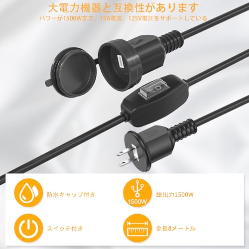 HITRENDS延長コード 8m 15V/1500W 屋外 電源コード 防水 スイッチ付き 作業用 延長ケーブル 防雨キャップ付 耐トラッキングカバー 電源タップ ト火災予防 絶縁キャップ付き 屋外 コンセント延長 作業用 2芯 1500Wまで 野外用 電動工具、草刈り機、照明用、掃除機など対応 【屋外OK】PSE認証