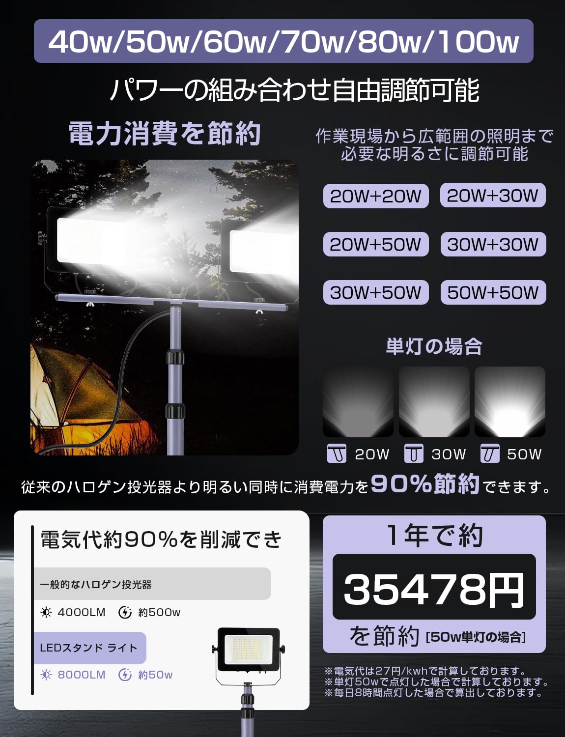 Akitoe LED投光器 2灯式は、高輝度で多機能なLEDワークライトです。3色切替(昼光色6500K/白色/電球色)と40w/50w/60w/70w/80w/100wパワーの組み合わせ自由調節可能!作業環境や用途に合わせて光の色と明るさを調整可能。2灯式設計で広範囲を均一に照らし、工事現場、駐車場、防犯灯、集魚灯など様々なシーンで活躍します。180度広角照射とIP65防水防塵仕様で、雨天や屋外での使用にも最適。付属の三脚スタンドで高さ調整が簡単にでき、5M長コード&アース付きプラグで安全性も確保。長寿命LED採用でメンテナンスフリー、省エネ設計でコスト削減にも貢献します。