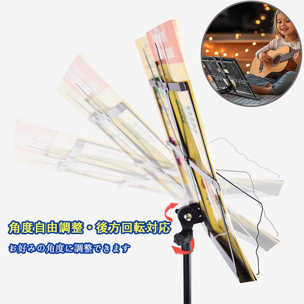 譜面台 折り畳み 楽譜立て 折畳み 軽量 黒 金属製 三脚 調整可能な譜面台 クランプ アー 楽譜クリップ付き 楽譜スタンド 折りたたみ 高さ50~150cm 調節可能 読書台 卓上 メニュースタンド 屋外 子供 大人用