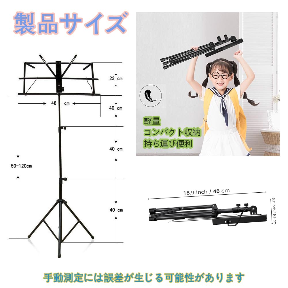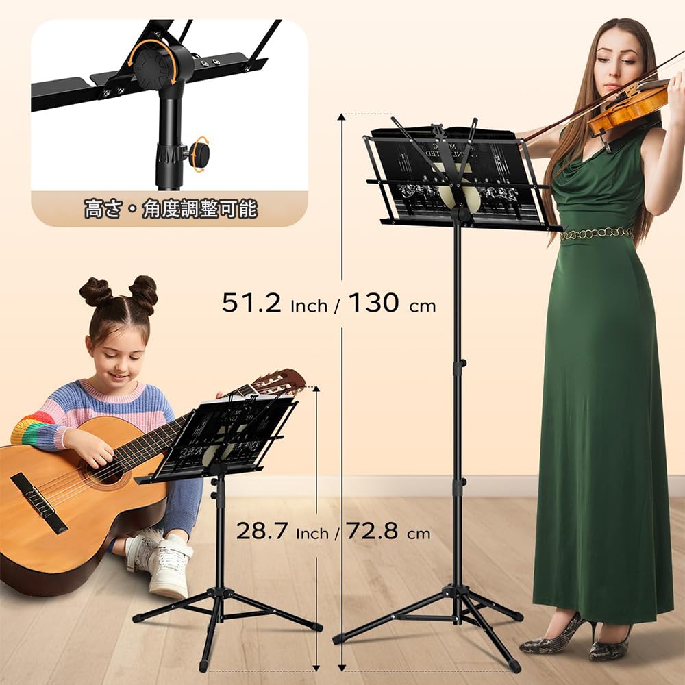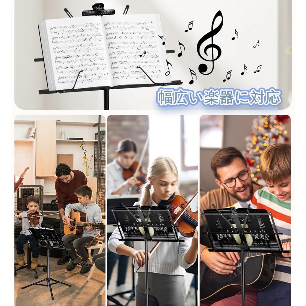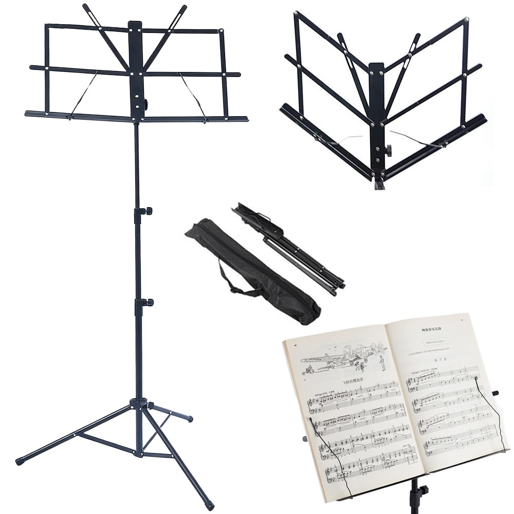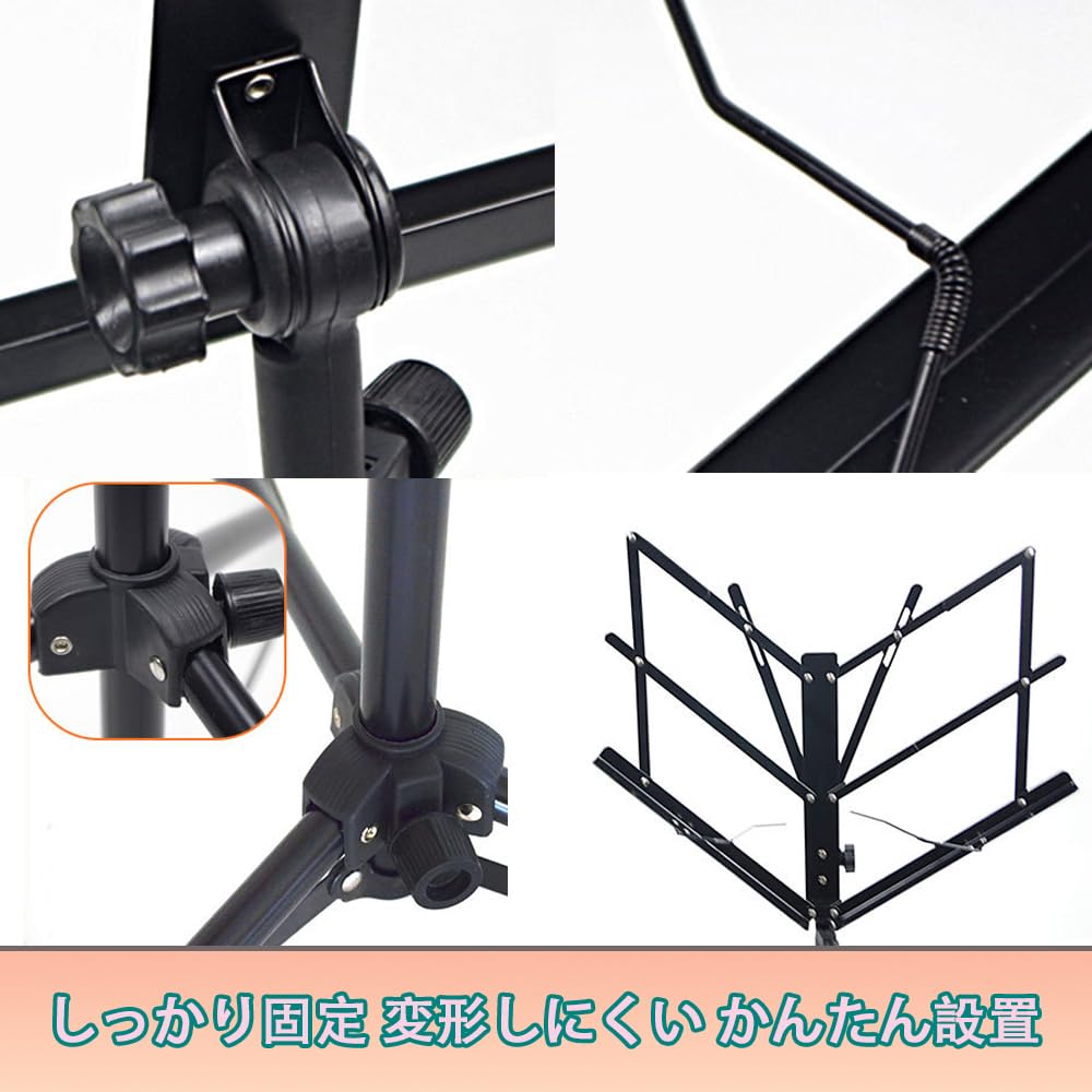 譜面台 折りたたみ式 楽譜たて 楽譜スタンド 73~145cm調節可能 楽譜クリップ付き 三脚 デスクトップスタンド ブックスタンド メニュースタンド 読書台 筆記台 縦置き 収納バッグ付き (ブラック二つ折り)