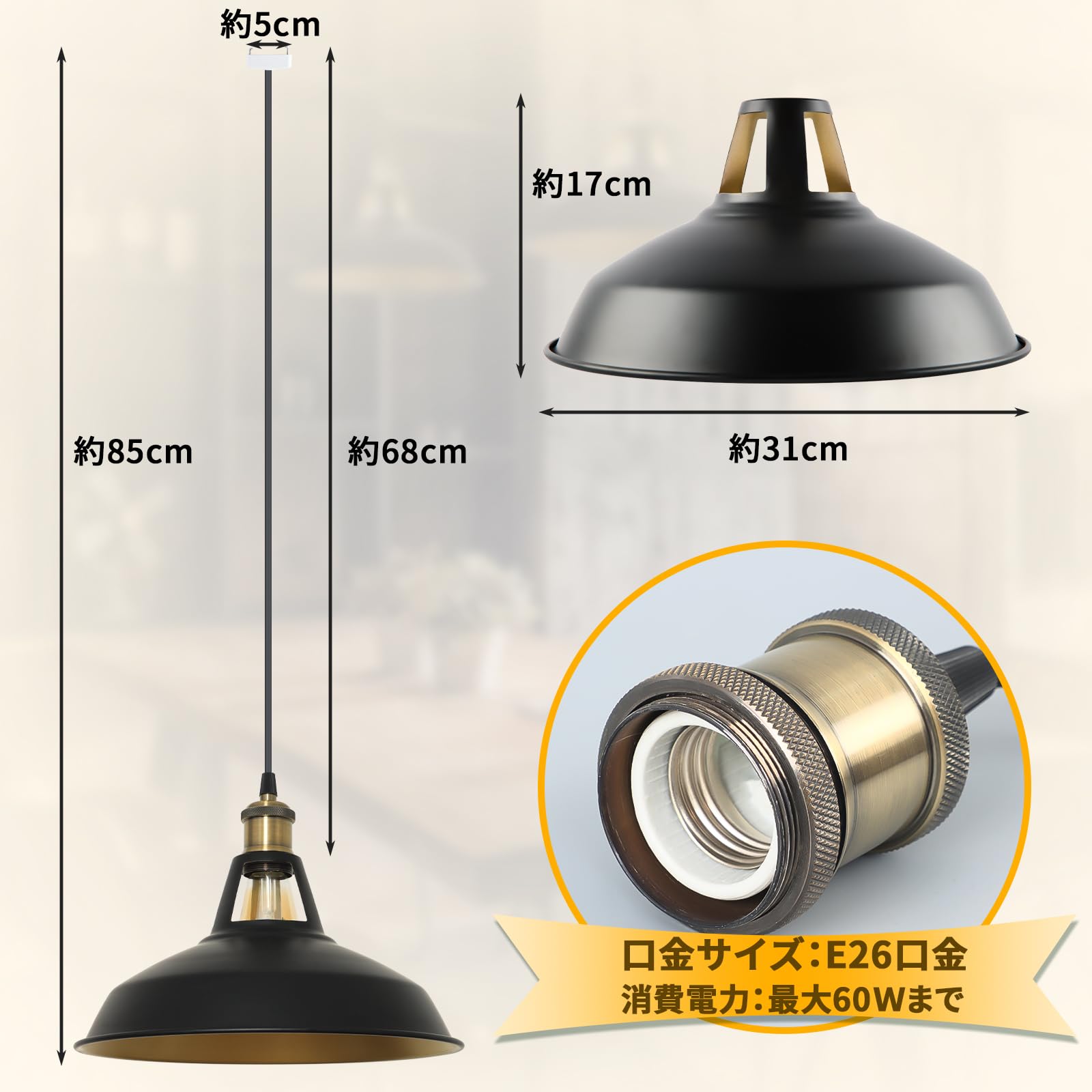 ペンダントライト レトロ 照明器具 E26 引掛けシーリング 1灯 黒