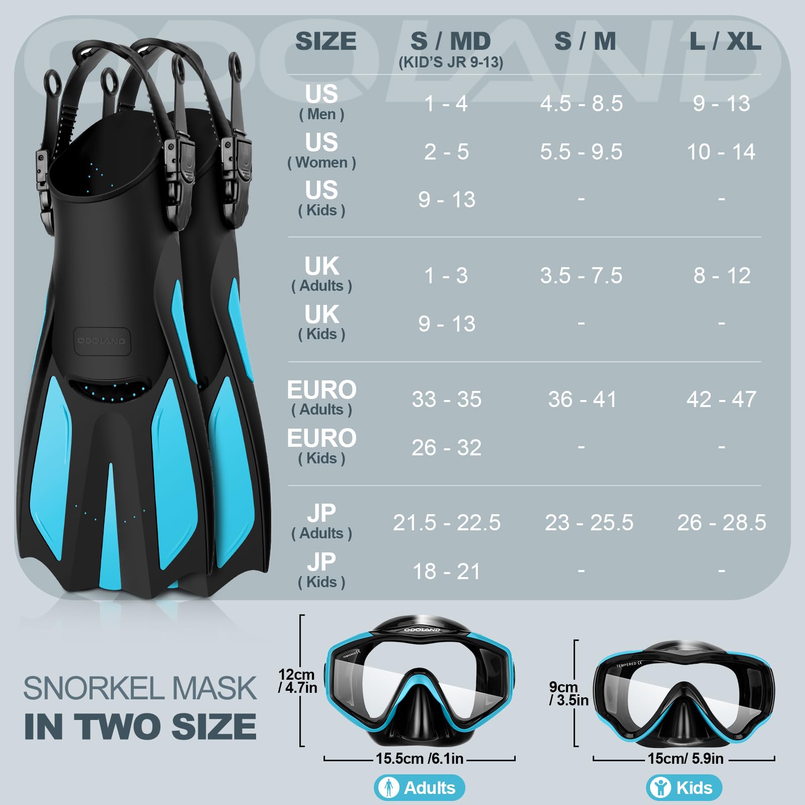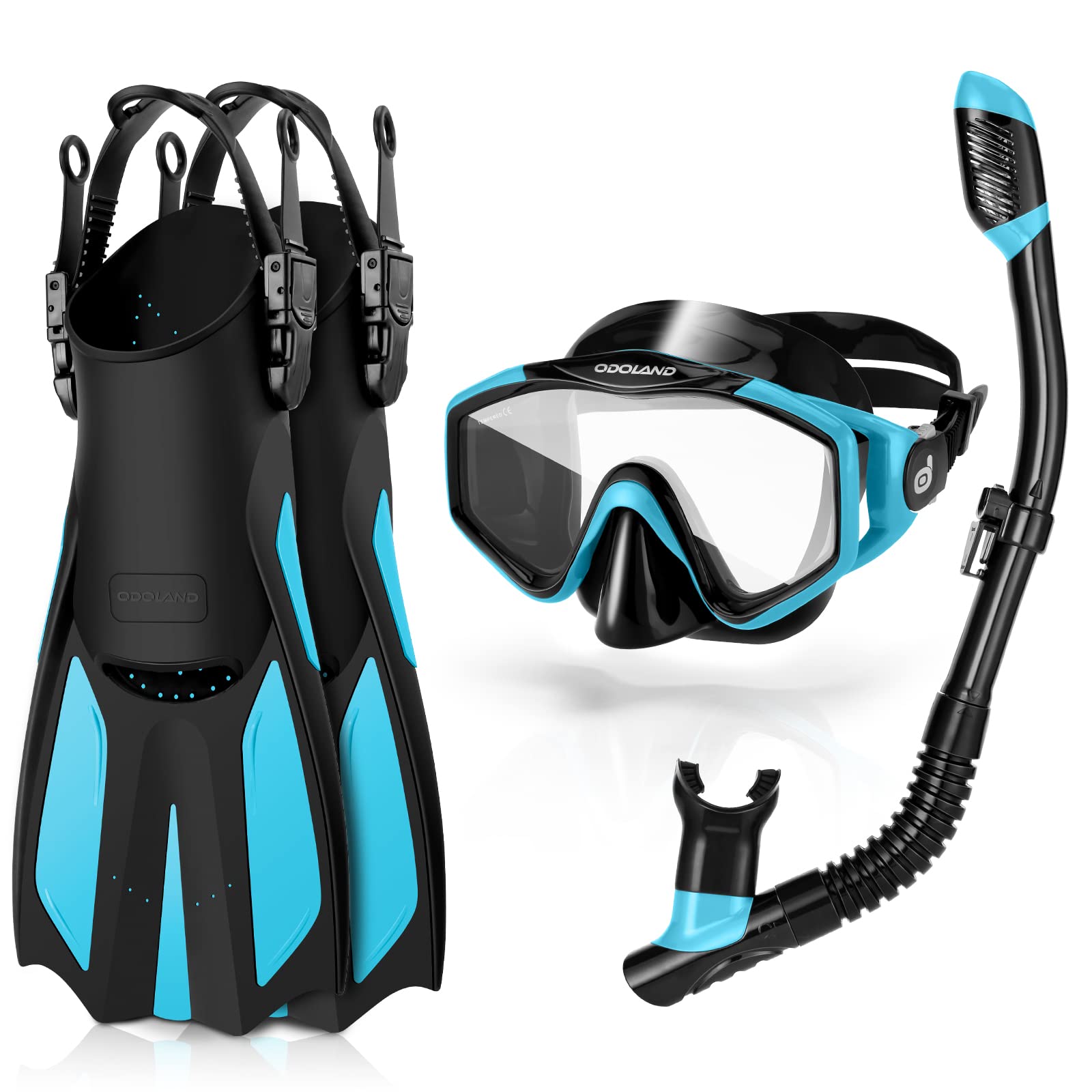 Odoland 3点シュノーケルセット 曇り止め ダイビングマスク+ドライスノーケル+調整可能フィン+収納バッグ付き シュノーケリングセット 水中眼鏡 耐衝撃 潜水メガネ 呼吸用パイプ スキューバ足ひれ スノーケルセット 大人用 男女兼用 初心者向け