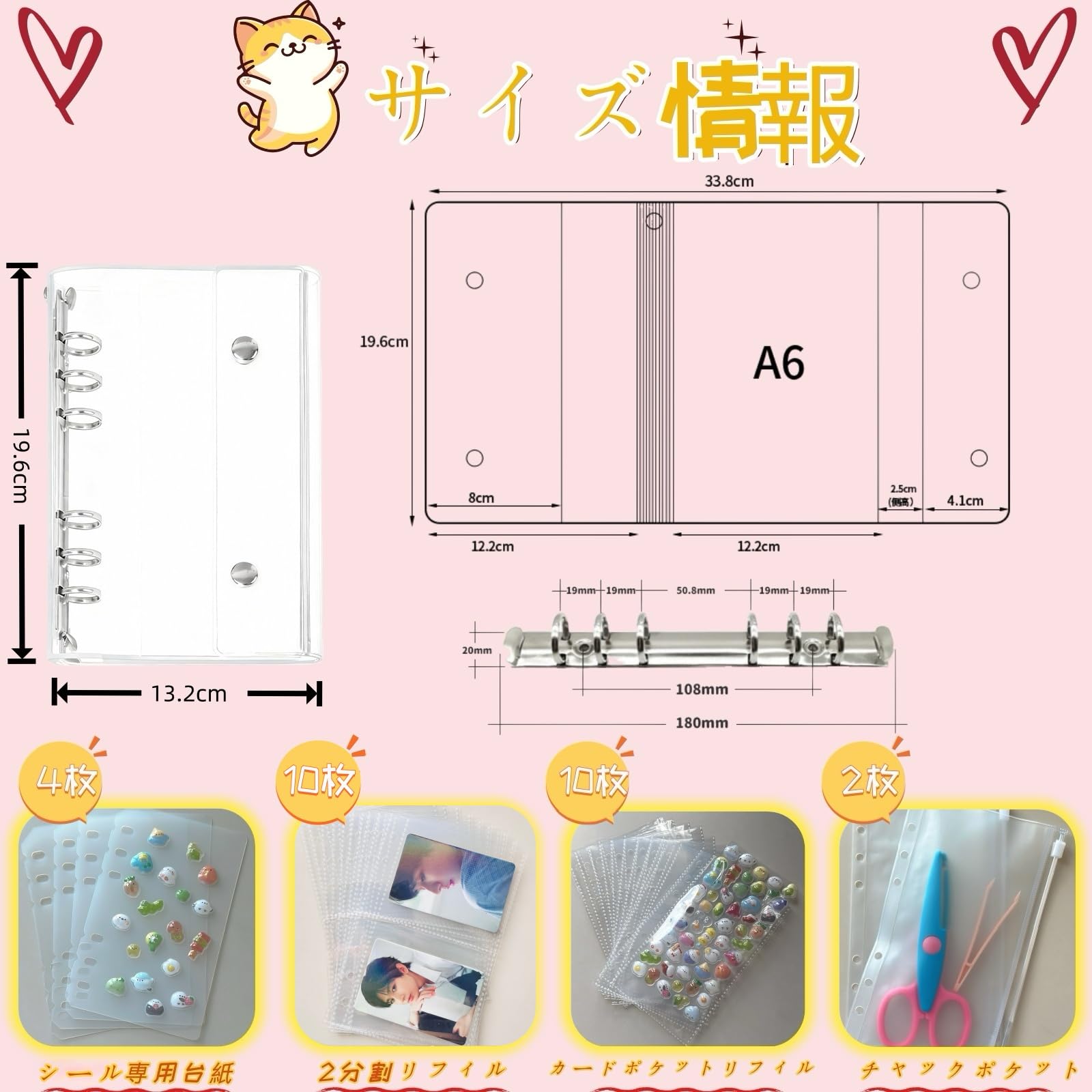 シール帳 プラバン 透明 6穴バインダー A6サイズ大容量,【リフィル×20枚 チャック付きポケット×2枚 シール台紙×4枚】推し活収納 PPシート カードブック 下敷き 剥がせる 剥離紙 カードスリーブ コラージュノート クリア手帳 プリ帳 システム手帳 (ザラ付きシール台紙10枚)