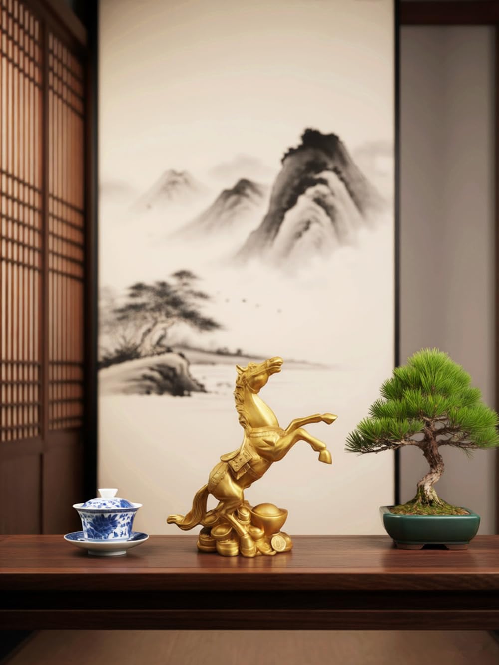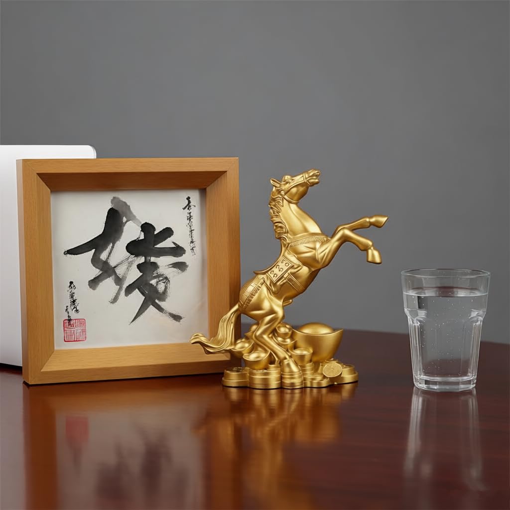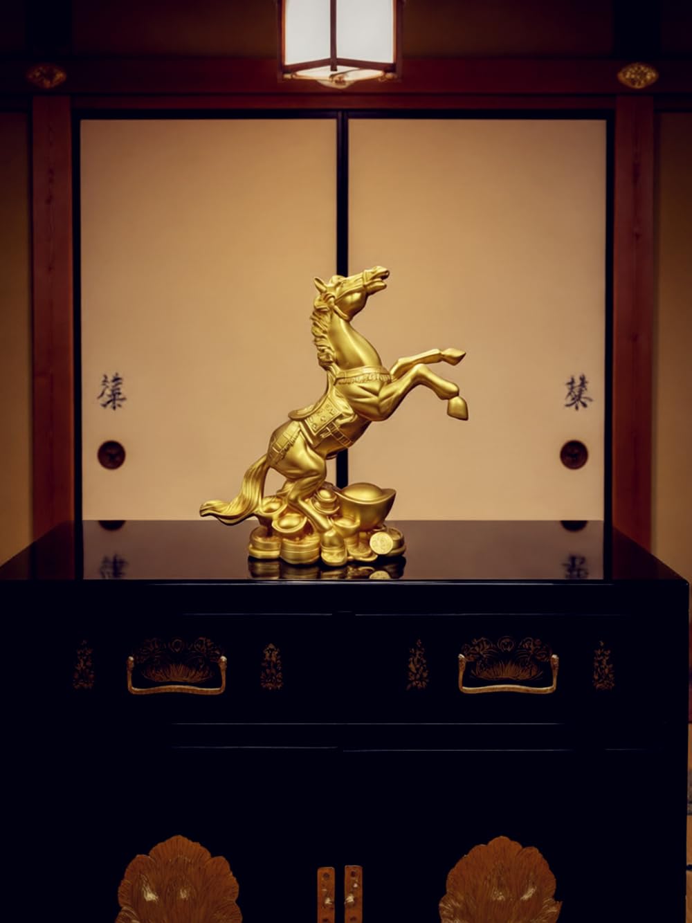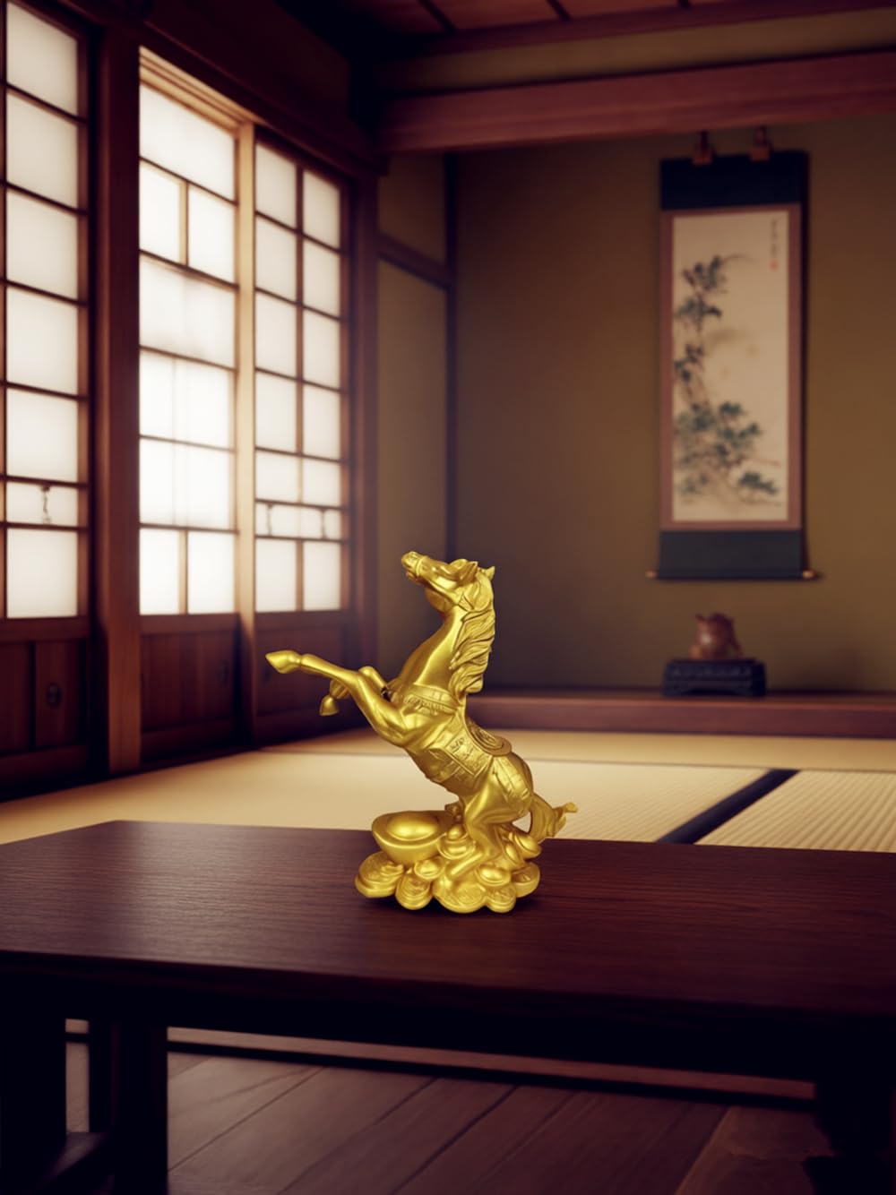 開運UPに期待!「午」は十二支の7番目で、動物の馬に当てはめられています。 古代では「馬」が生活の要であり、健康や豊作、発展の象徴でもありました。古来、馬は「神の乗り物」として神聖視され、神社に馬を奉納する信仰があった。事業が発展・商売繁盛・五穀豊穣・家内安全などのご利益があるとして、贈り物として渡すことで、日頃の感謝を込めることができるのです。動物の馬といえば、筋肉質の体に細長い足、草原を颯爽と駆け抜ける姿が思い浮かびます。干支においても、馬は前向きなエネルギーと成功、繁栄の象徴として、日本で長く親しまれてきました。馬に関連する縁起物の中でも、強力な開運モチーフとされるのが、中国由来の二つの四字熟語です。 一つが「馬到成功」(馬が到着すれば、即座に成功をもたらす)で、事業の成功を願う意味合いがあります。もう一つが「千軍万馬」で、文字通り「千の軍勢、万の馬」を意味し、比喩的に「経験豊富で非常に頼りになる人物」を称えるため、社内表彰や上司・ビジネスパートナーへの贈り物にぴったりです。相 でいうと、虎、犬、羊、龍の相の人が馬の置物を使うのに適している。金馬材質:樹脂 小さいサイズ:15cm*5.8cm*15cm 重量:483g大きいサイズ:20cm*7cm*23cm 重量:1058g風水 開運グッズ 馬の置物 開運効果(仕事運・金運アップ)があるとされる。置き場所は:〇すべての気の入り口である玄関〇皆が集まるリビングなど〇事業をされてる方は社長室〇金庫やレジのそば〇神棚贈答用:開店祝い 新築祝い プレゼント ギフト原産国:中国