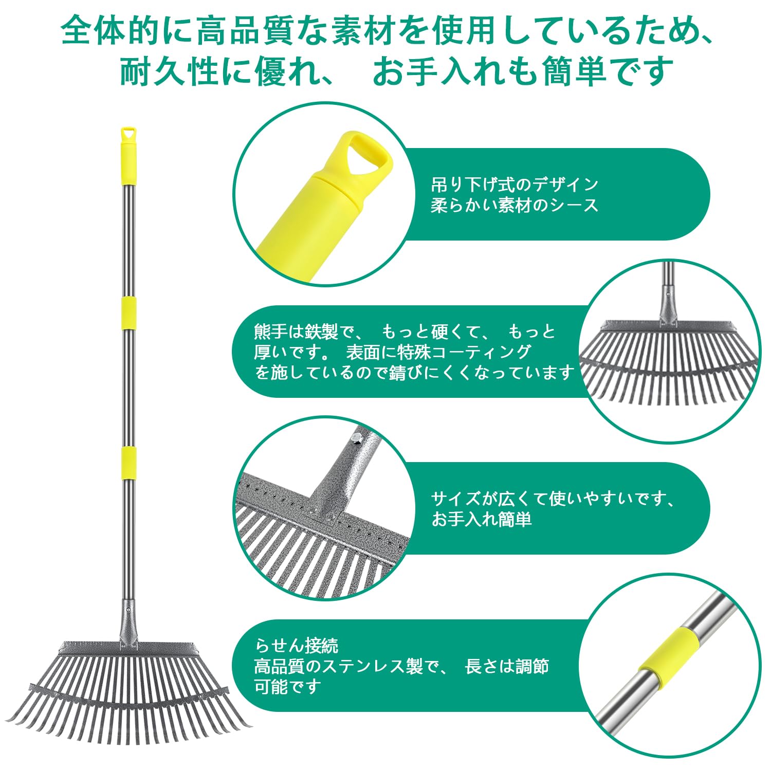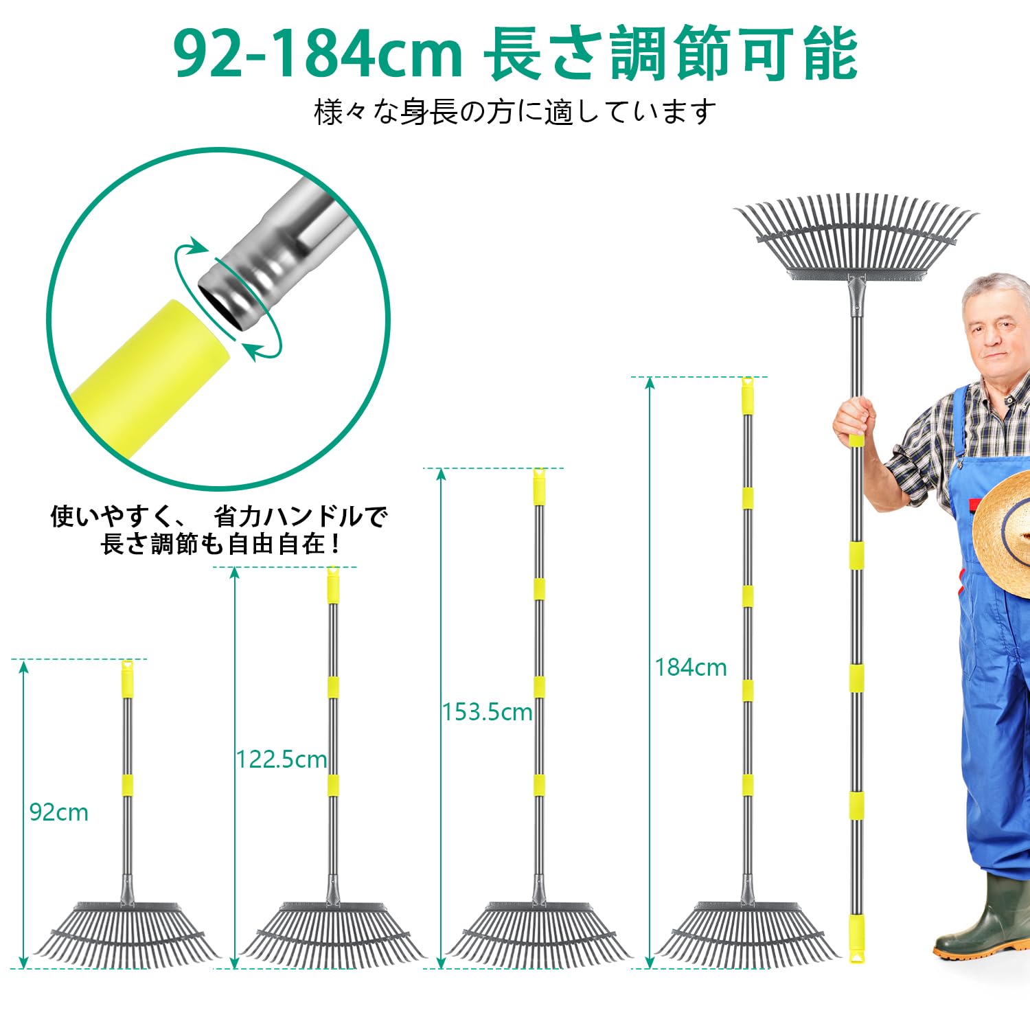 Vevesoas 熊手 レーキ ガーデンレーキ 25爪 ステンレス鋼 4段階の長さ調節が可能 92cm-184cm 吊り下げ式 使用する雑草/落ち葉/園芸/芝生/草用具/庭掃除/農業 掃除 道具 日本語の説明書付き