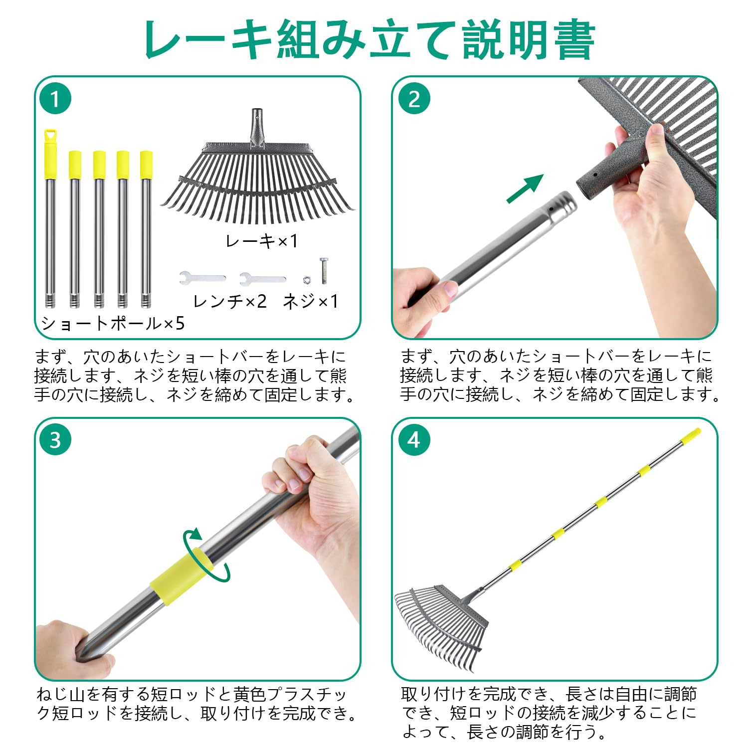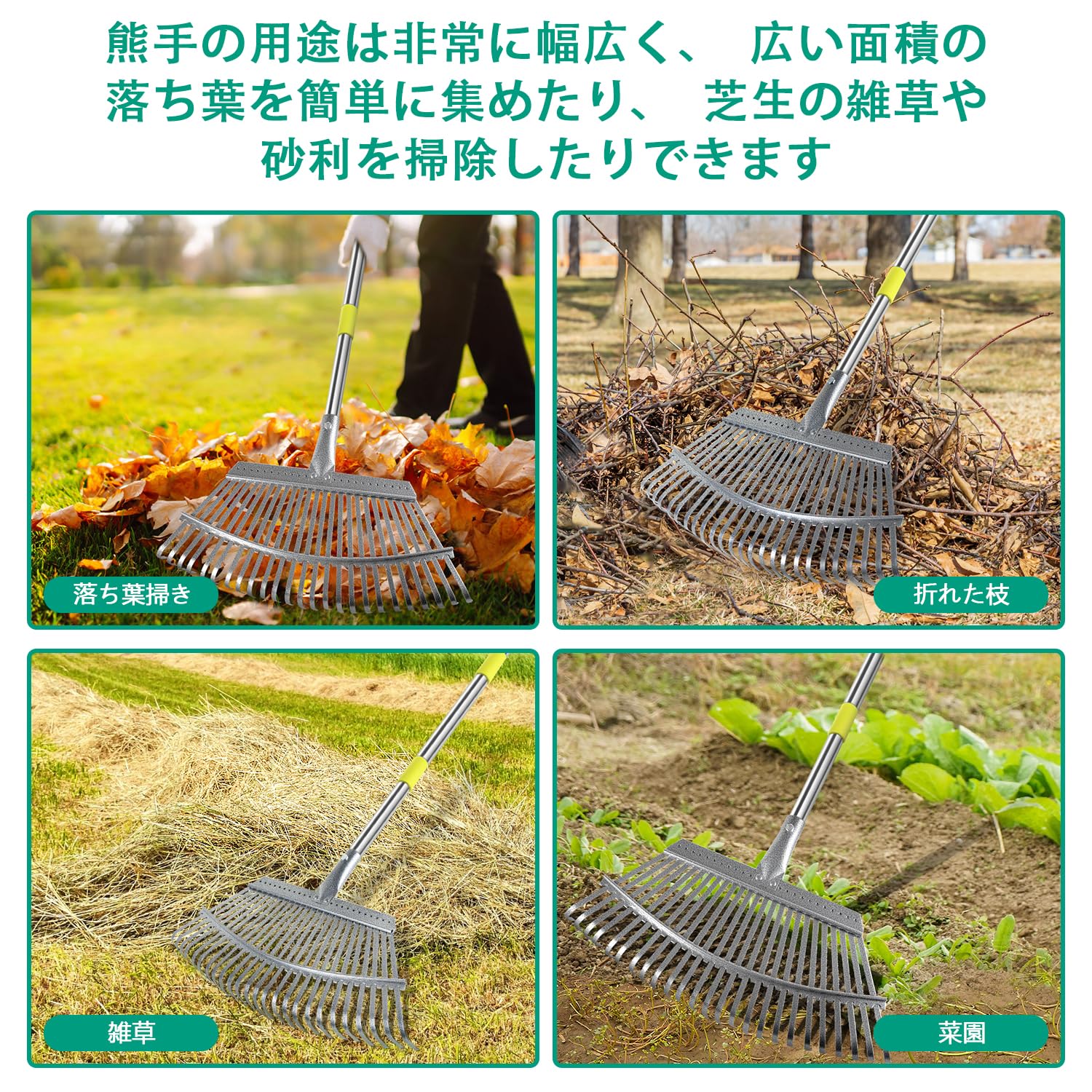 FQIPEI 熊手 伸縮レーキ 1.3m ステンレス柄付 21本爪 メタルヘッド 頑丈なレーキ 芝生のサッチ取りレーキ 草刈り 落葉集め 整地作業 土壌緩和 園芸用農具