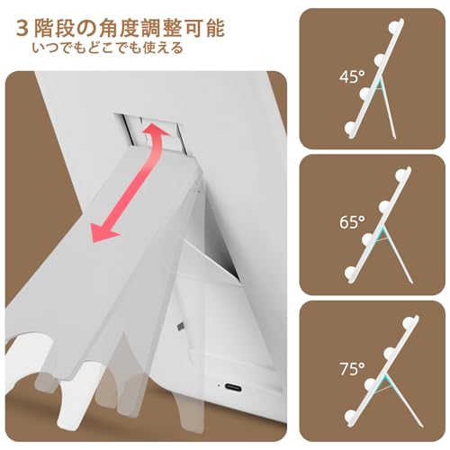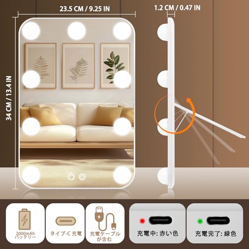 Uarnicey 3光色 鏡 折立鏡 卓上 ライト付き 無段階調光 女優ミラー 化粧鏡 折立ミラー 180°角度は自由に調整 USB充電式 収納便利 消し忘れ防止機能 LEDライト 日本語説明書付き