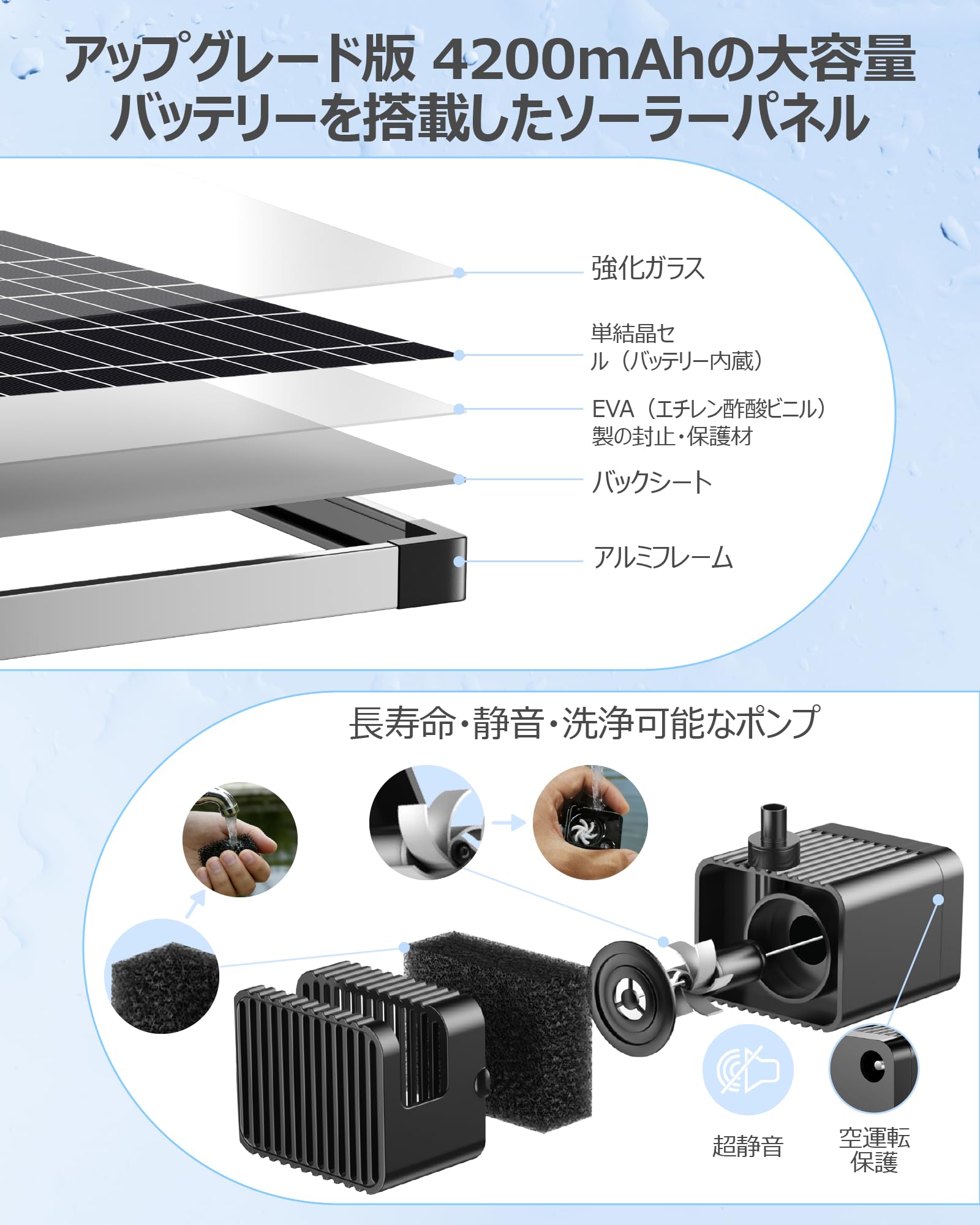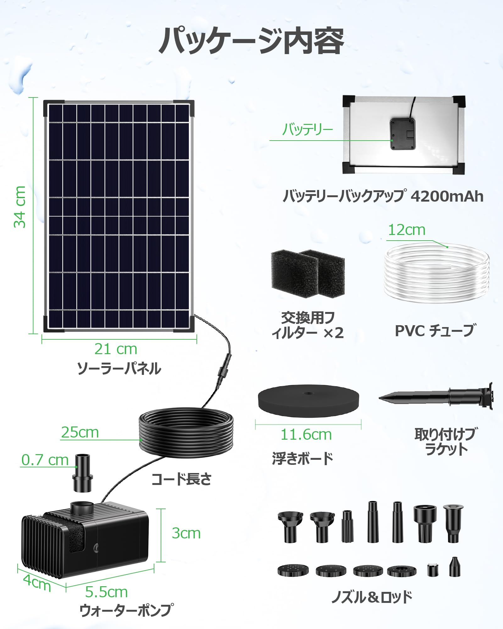 Biling太陽光発電式 ソーラー噴水ポンプ|2.5W ノズル付き 屋外用水景ポンプ 電池不要 空運転防止機能