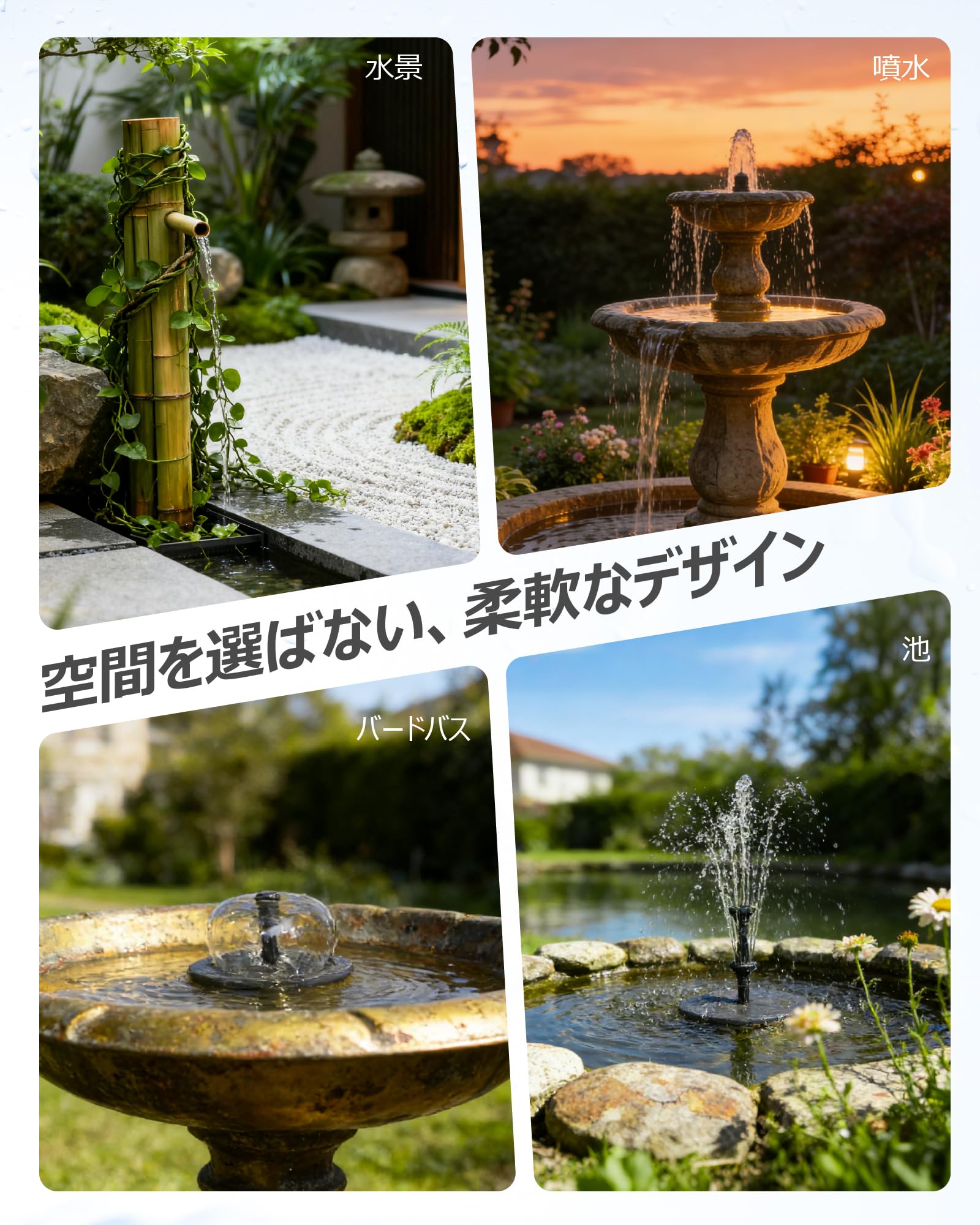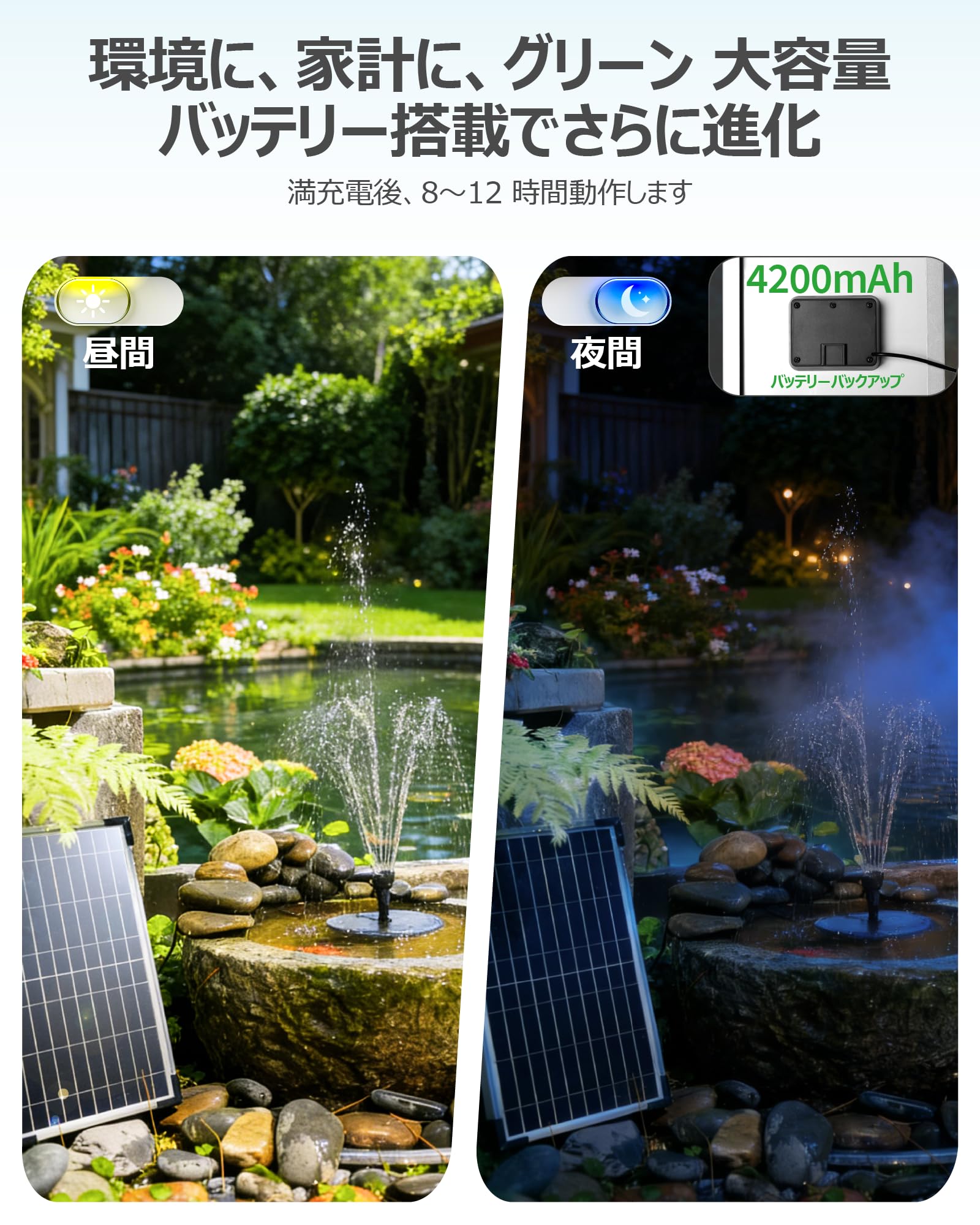 POPOSOAP12W ソーラー噴水ポンプ キット 4200mAh大容量バッテリー内蔵 充電式 8種類水演出 空運転保護 屋外 庭園 池 バードバス DIY水景 循環ポンプ ソーラーパネル付き