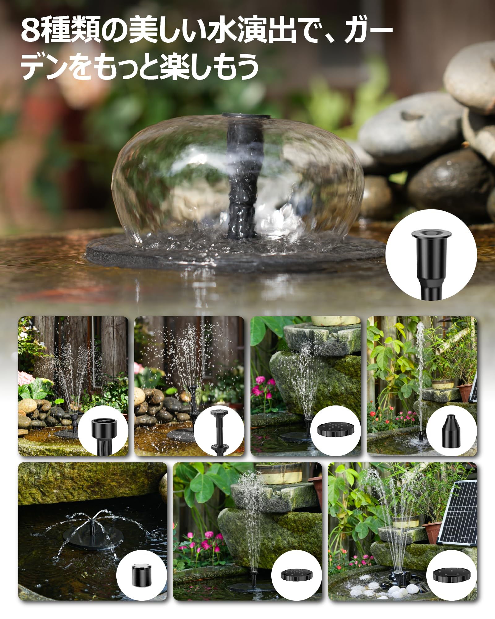 NFESOLAR ソーラーポンプ 5.5W 大容量3000mAh蓄電式 浮き型ソーラー噴水ポンプ 8種ノズル付 自動水位保護機能 ビオトープ/池/バードバス/庭園用 太陽光発電 水循環 酸素供給