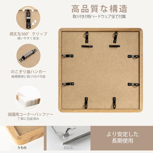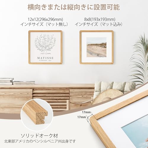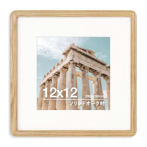 12x12 ソリッドオーク木製スクエアフォトフレーム|8x8用マット付き|強化ガラス・吊り下げ金具付属|ナチュラルオーク (1個入り)