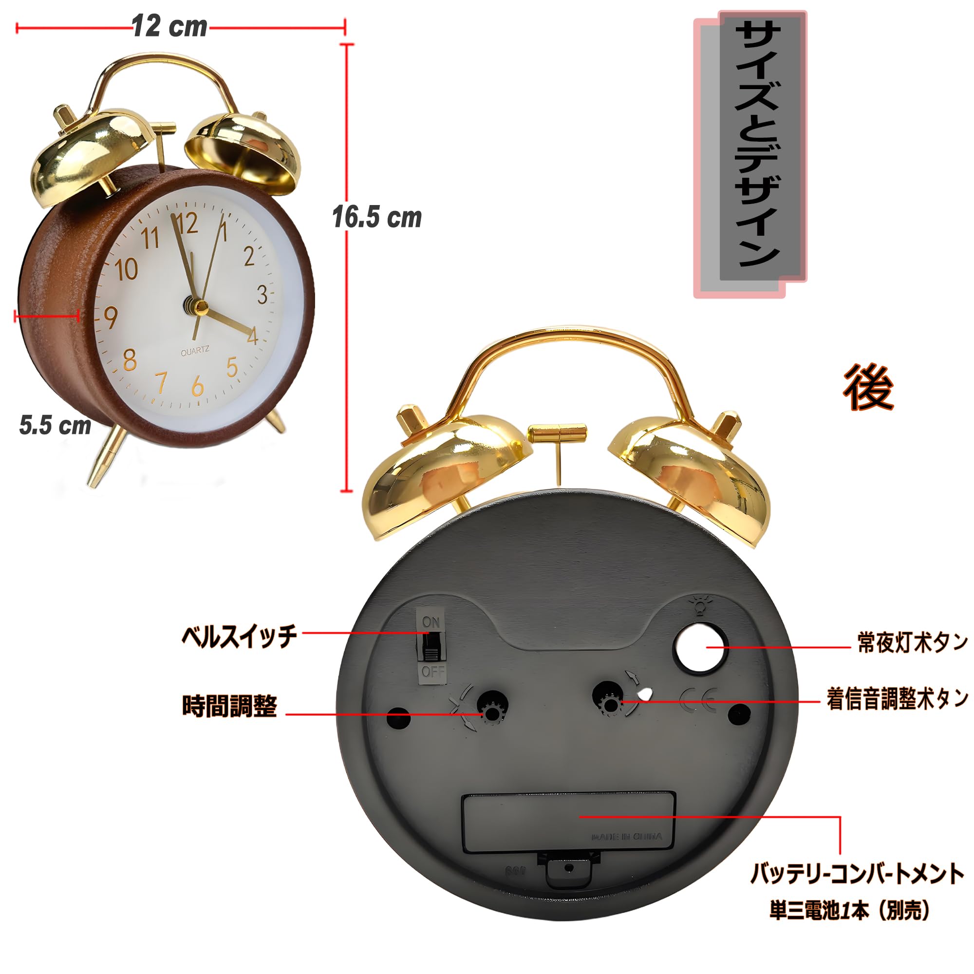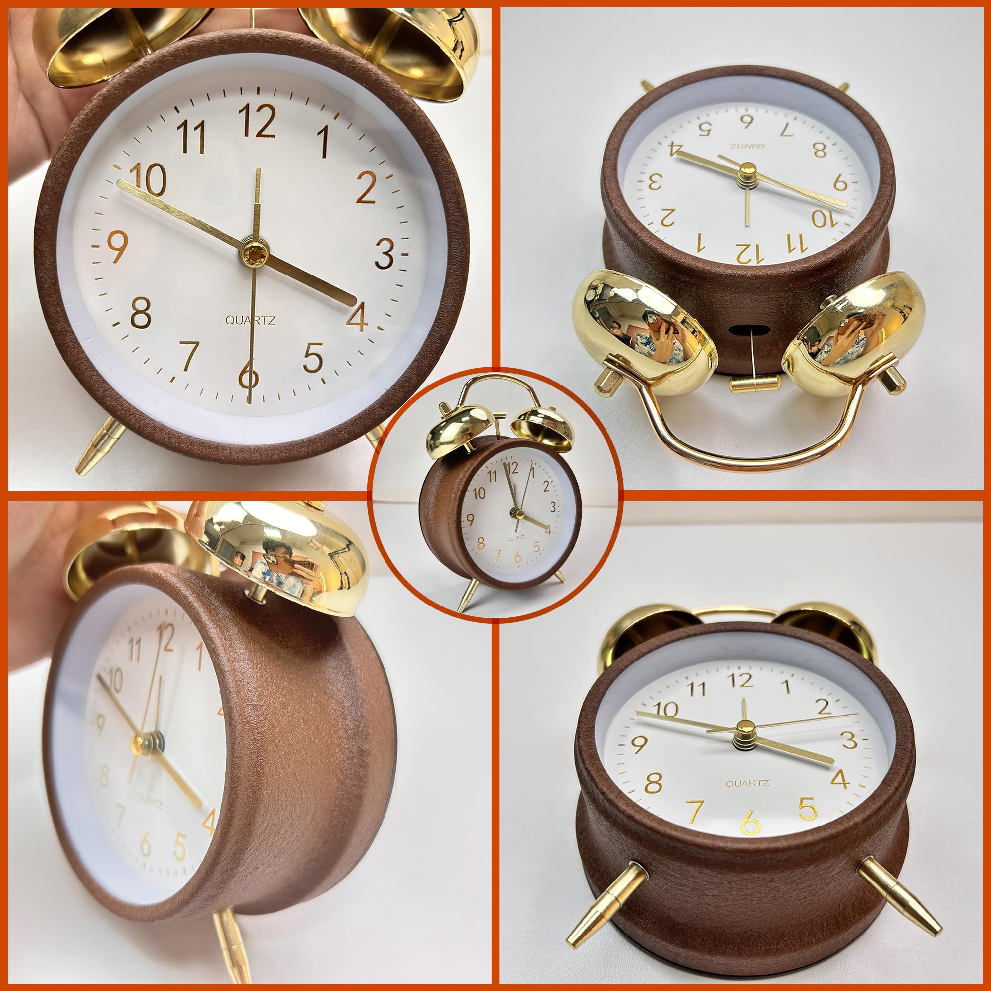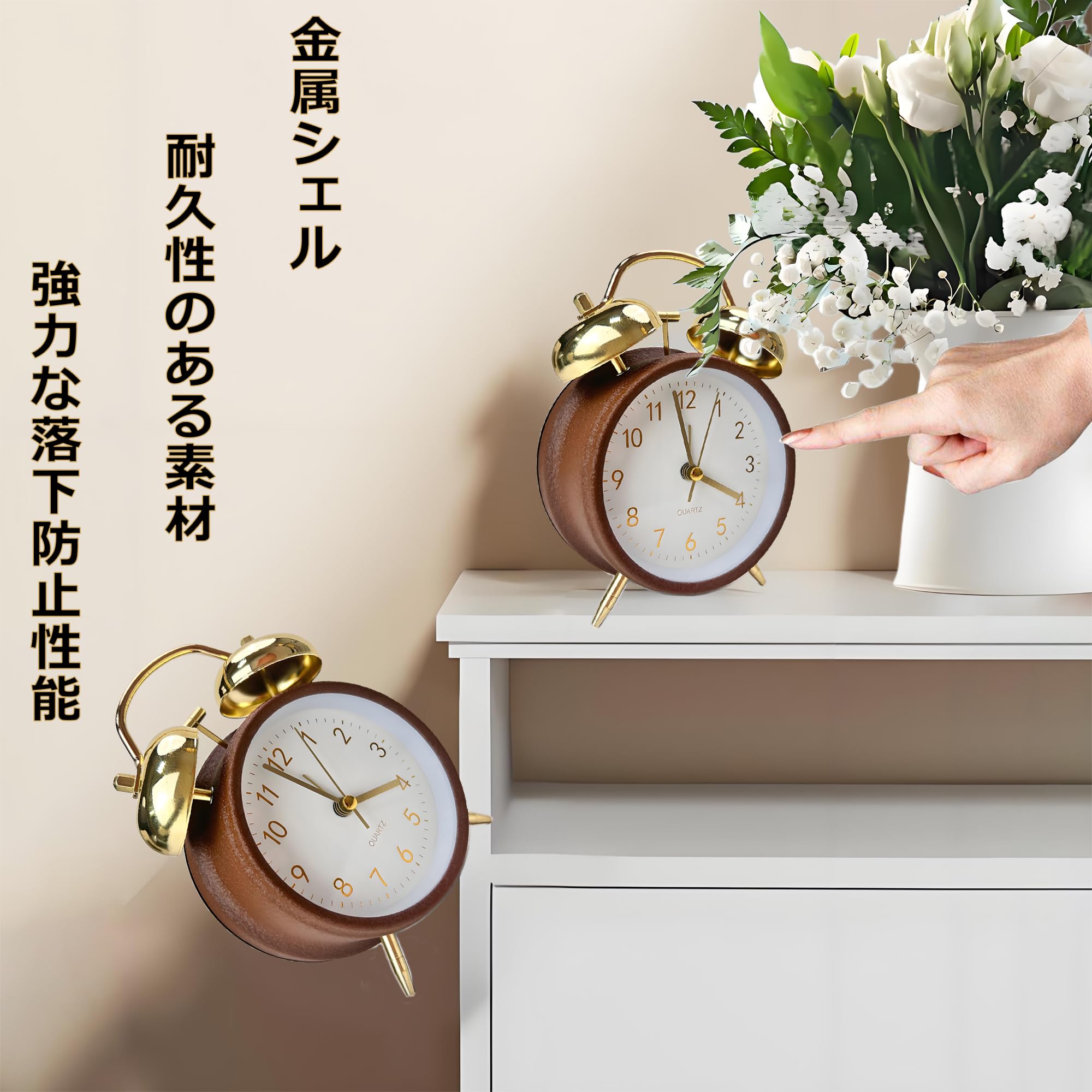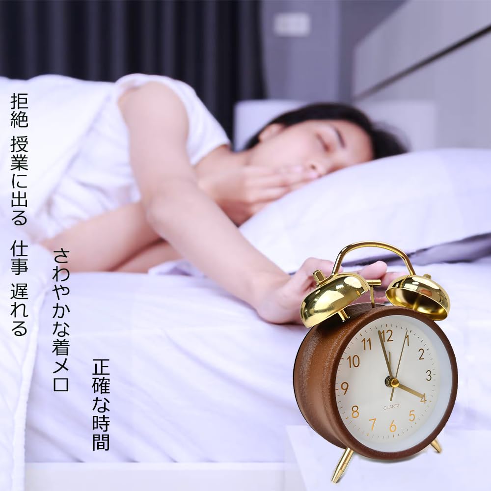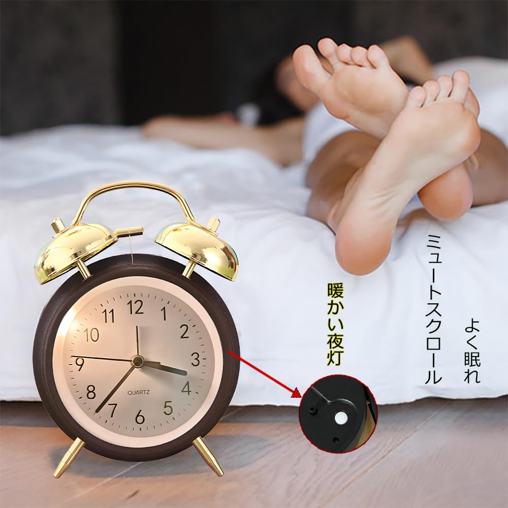 目覚まし時計 ベル 大音量 電池式置き時計|スキャン秒針で完全静音|寝室・リビング・オフィス対応 シンプルアナログ時計 (金耳色-茶色の枠)