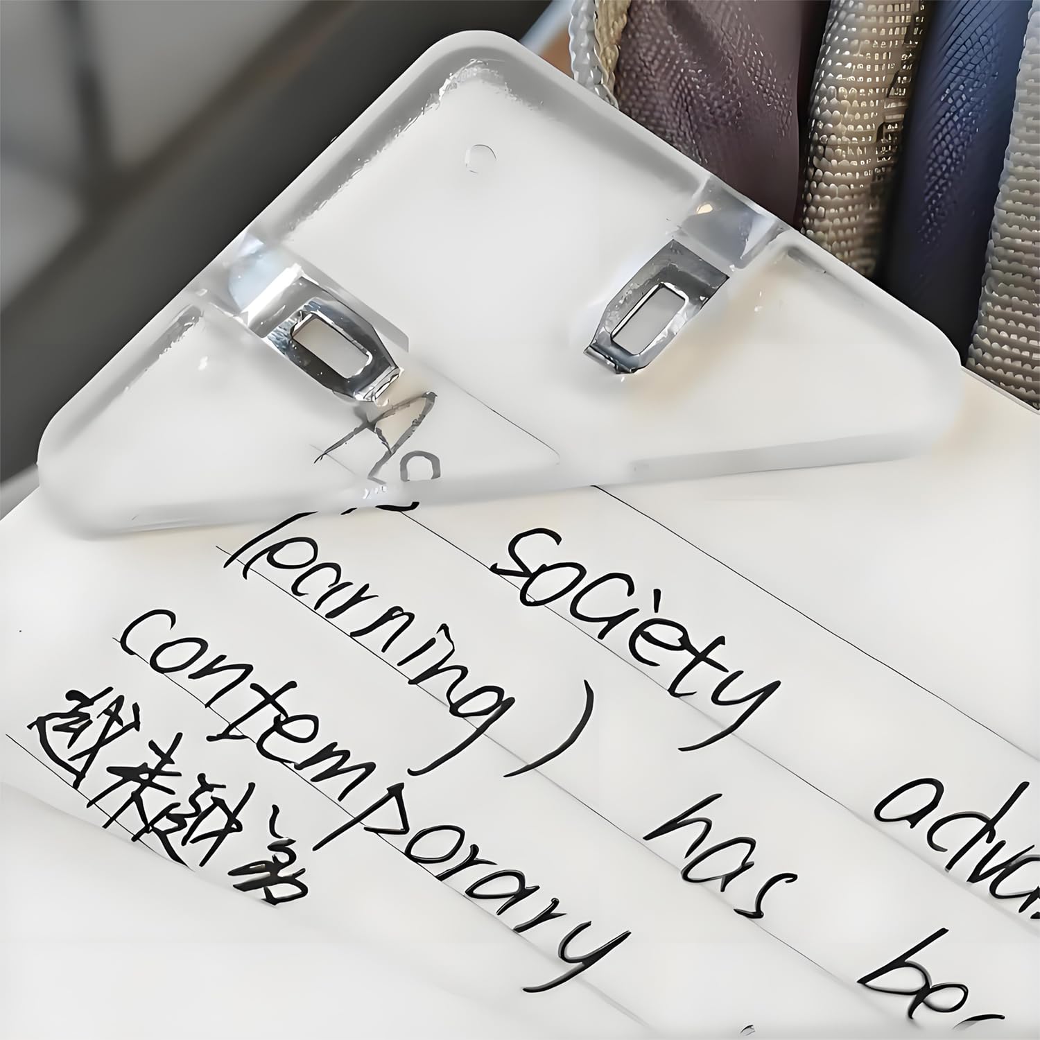 勉強やオフィスでの書類整理を、よりスマートに快適にするマルチクリップです。 クリアな透明デザインで、押しピンで留めたように見えず、資料の美観を損ないません。 強力な挟み力で、最大約40~50枚のA4用紙をしっかりと固定。テスト用紙やノートの角が捲れるのを効果的に防ぎます。 オフィスでは、契約書や請求書などの重要書類をまとめるのに。ご自宅では、お子様の勉強ドリルやプリント、ご自身のレシピ帳やメモ帳の整理に。また、ハンドメイドやクラフトの作業において、型紙やパーツを固定するのにも大活躍します。 4つのクールなカラー(氷透明、氷透赤、氷透黒、氷透水色)は、カラーコードで書類を分類できるだけでなく、デスク周りを彩るおしゃれな小物としてもご利用いただけます。