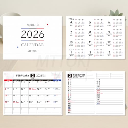 MTTOKI 2026年 卓上カレンダー 日曜始まり 4月始まり 【特典シール付き】 2月始まり 六曜表記 年表付き カレンダー 書きやすい 紙製 スケジュール管理 家庭用 オフィス用 コンパクト シンプル 新年ギフト プレゼント B6変形 4部