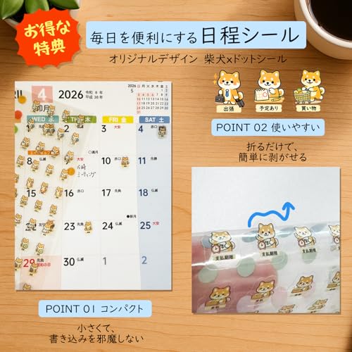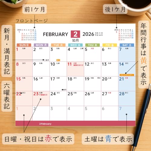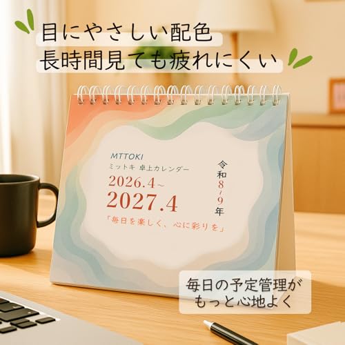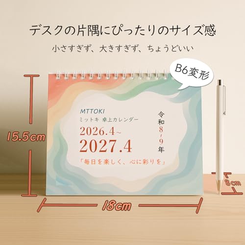 MTTOKI 2026年 卓上カレンダー 日曜始まり 4月始まり シール付き 六曜表記 カラーインデックス 年表付き カレンダー 上質紙仕様 家庭用 オフィス用 コンパクト シンプル 目に優しい 色分け 新年ギフト プレゼント B6変形 1部