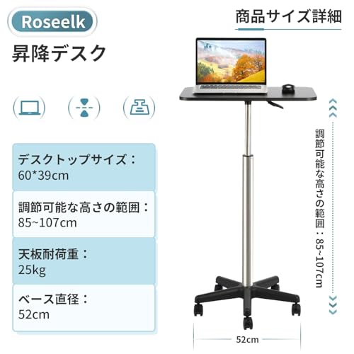 Roseelk スタンディングデスク 昇降デスク ワークデスク 無段階昇降(85~107cm) 耐荷重50kg 昇降テーブル ハイテーブル サイドテーブル プロジェクター台 自由に高さ調節可能 おしゃれ 簡単組立 収納便利 オフィス 会議室 ベッドルーム用 (ブラック, 85cm-107cm昇降)