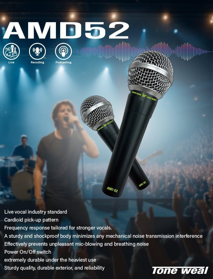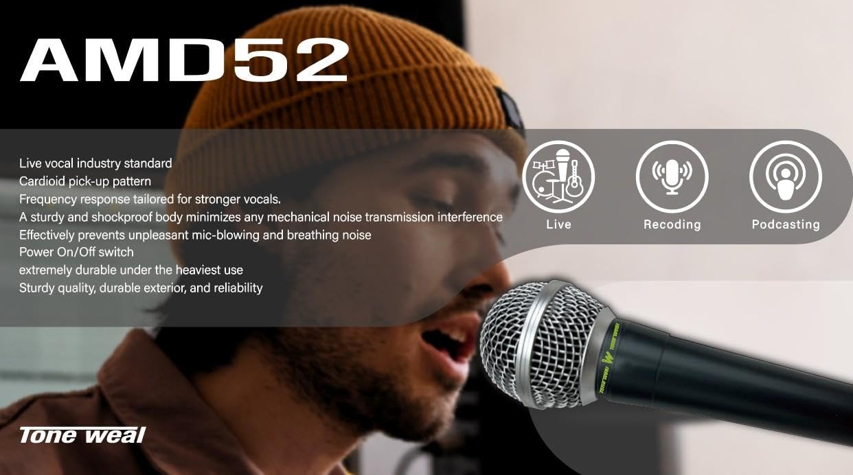 Tone weal AMD52 プロフェッショナルダイナミックカーディオイドマイク ライブボーカル&録音用 – 耐久性のあるメタルボディ、低破裂&息切れノイズ