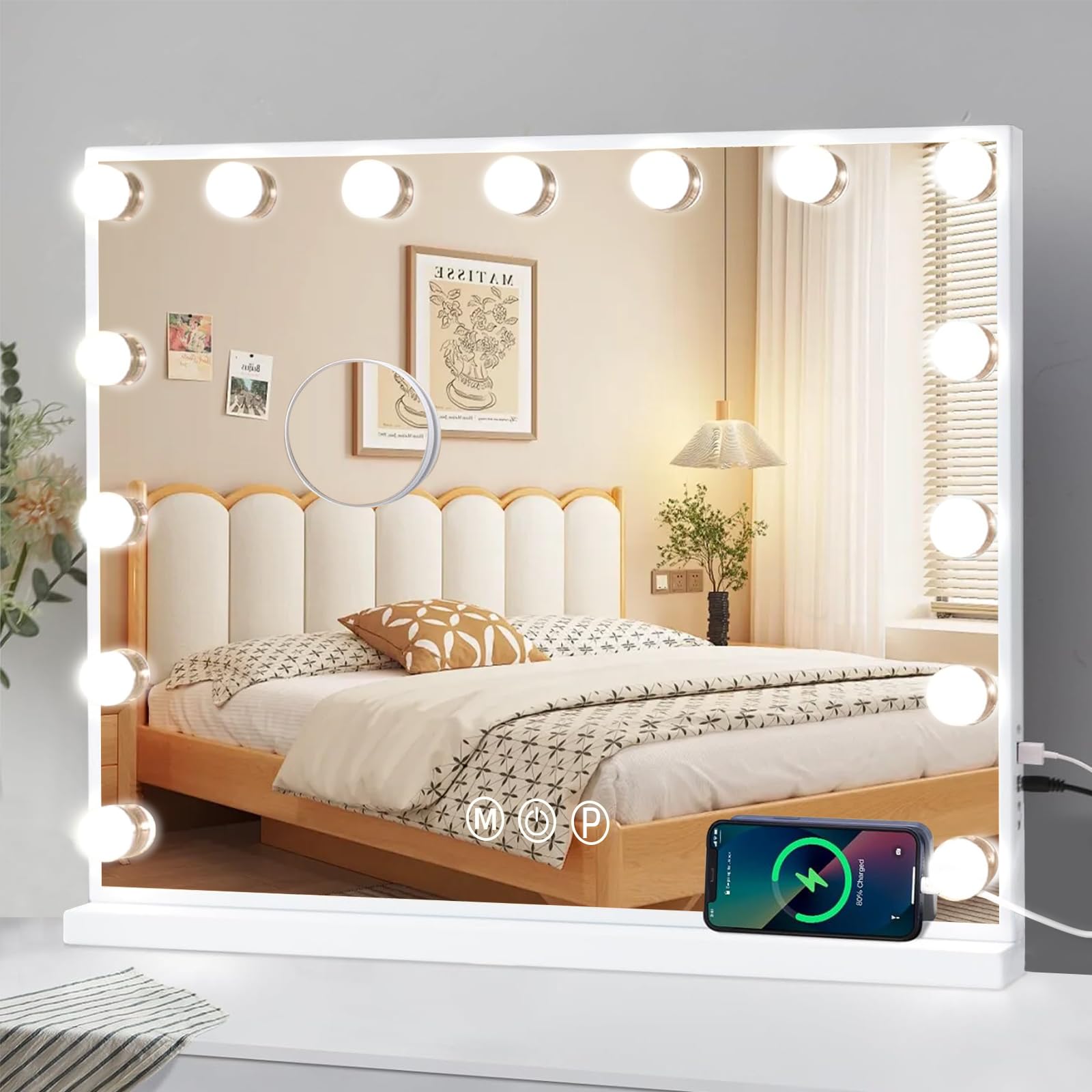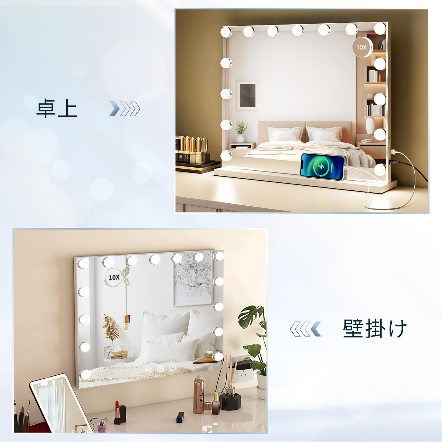 Lasola 女優ミラー ハリウッドミラー 化粧鏡 女優鏡 ライト付き化粧かがみ 鏡 大きめ 卓上/壁掛け両用可能 三色照明モード タッチ式 明るさ無段階調光 ledメイク 鏡 15個LED電球付き 10倍拡大鏡付き 58x43cm 白