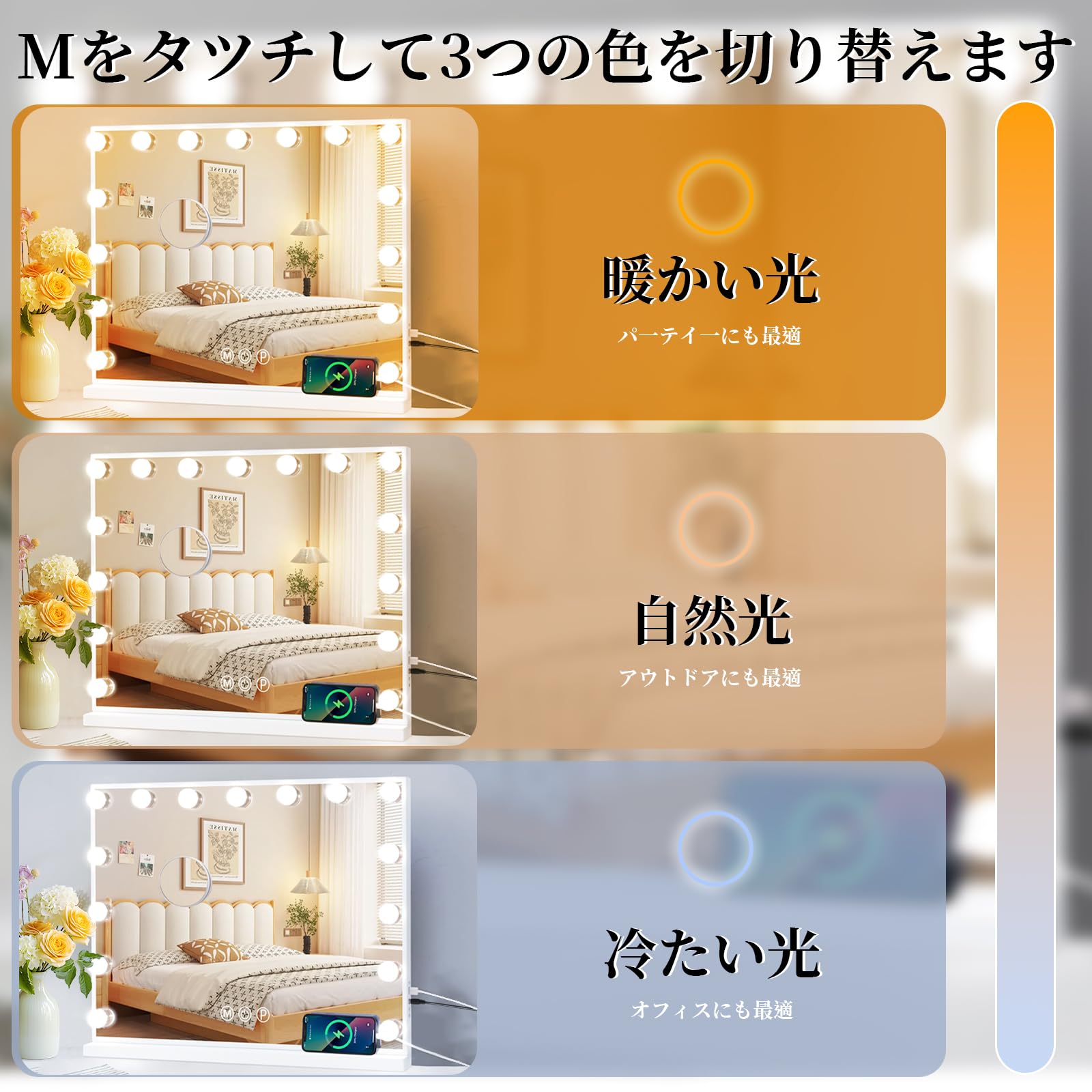 バー型 LEDライト 化粧ライト 模擬昼光色 3段階調光 タッチ式スイッチ USB充電式 メイク・ライト テープ 吸盤付き 浴室/洗面/化粧鏡用