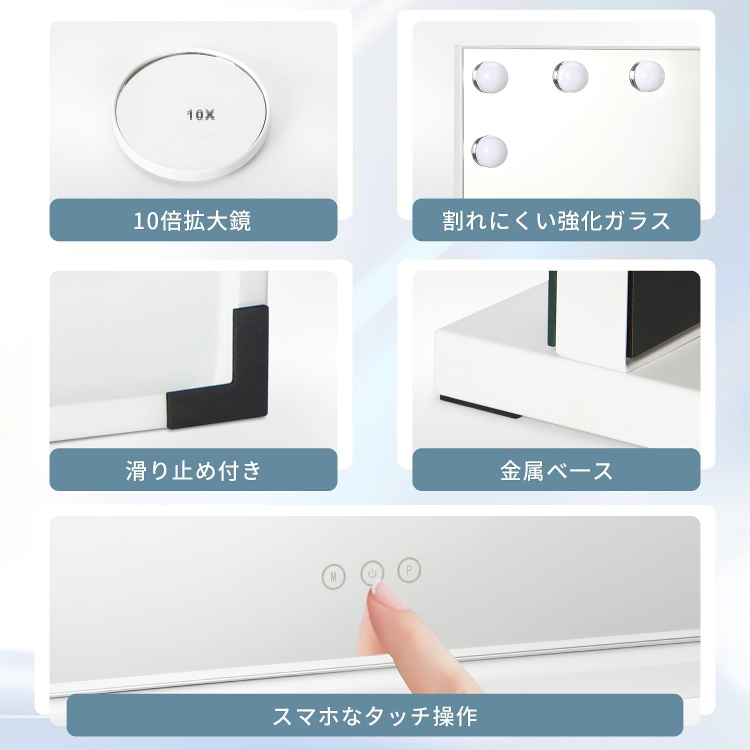 Hasipu 化粧鏡 ライト付き LED メイクアップミラー 調光機能付き 3段階調光 タッチスクリーン操作 化粧鏡 ホワイト (70 × 50 cm - 白)