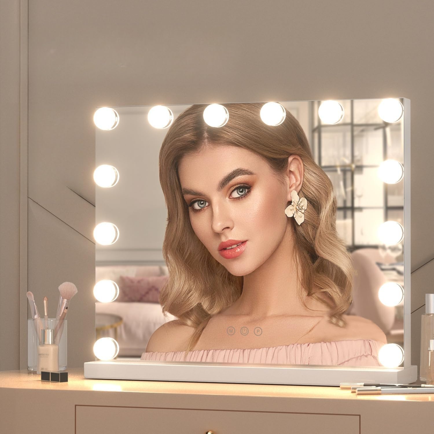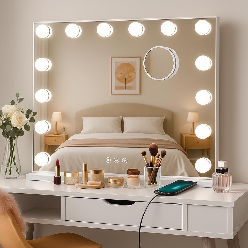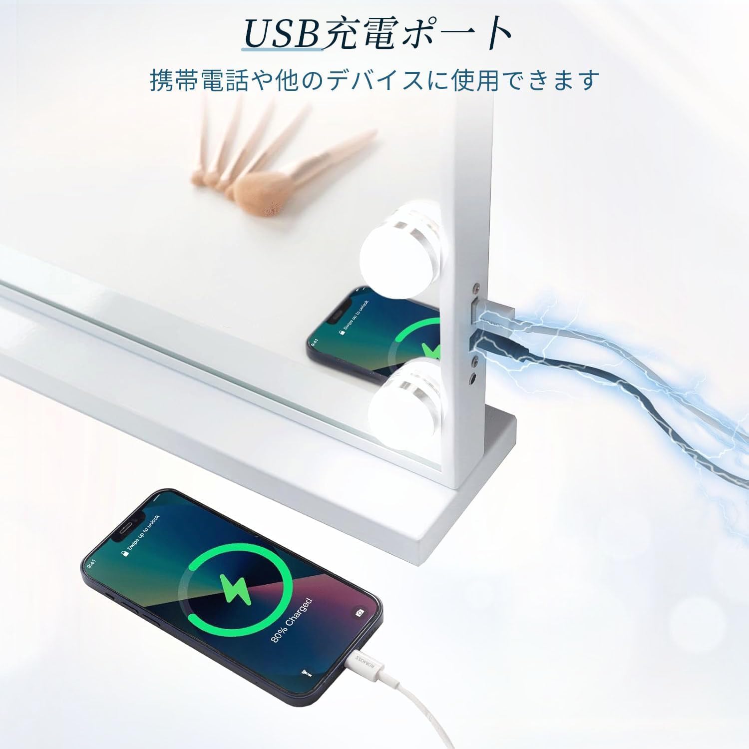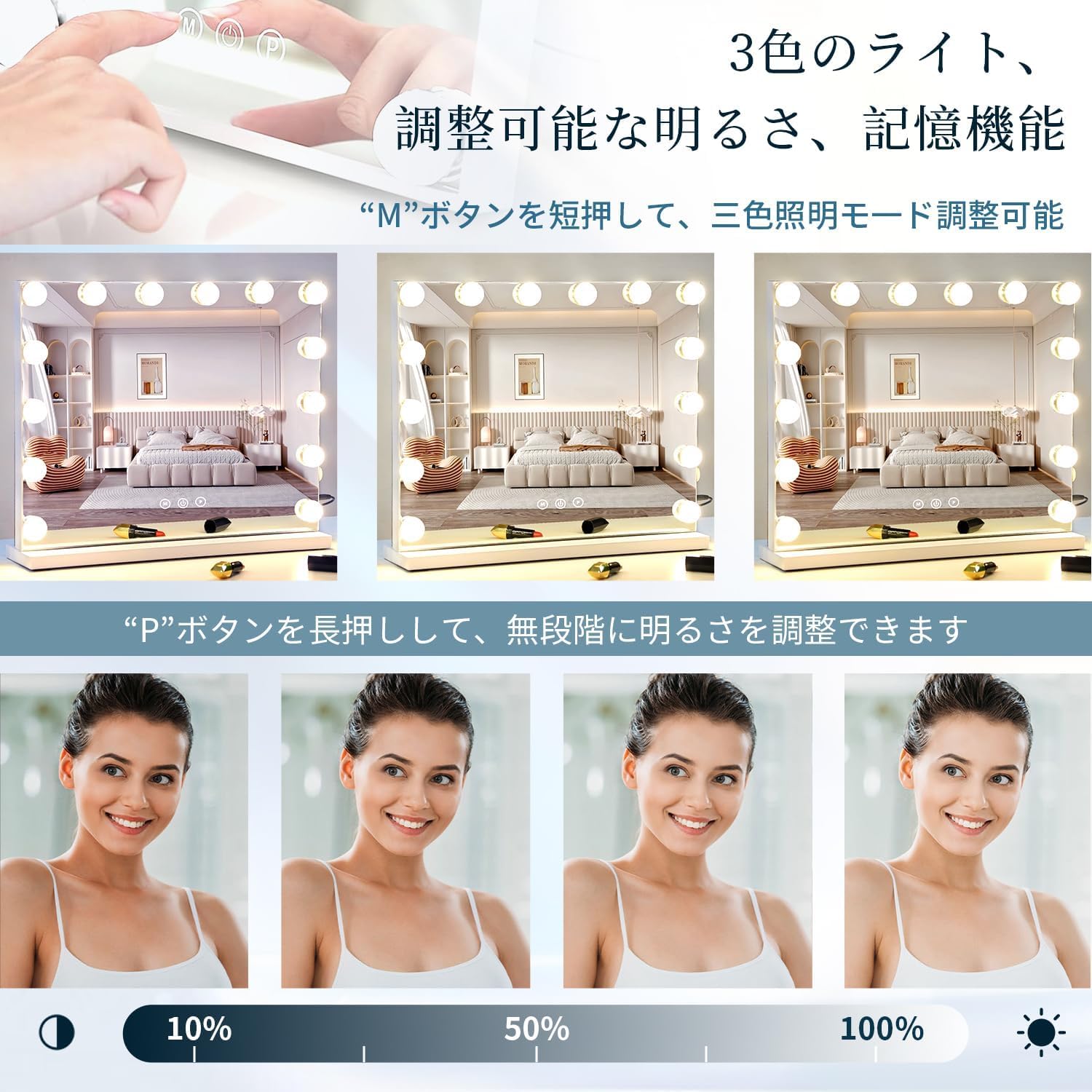 [Keranixy] 女優ミラー ライト付き ハリウッドミラー 化粧ライト鏡 化粧鏡 女優鏡 鏡 大きめ 卓上/壁掛け両用可能 3色ライトモード 明るさ調節でき 14個LED電球付き 10倍拡大鏡&USBポート付き (50×40cm)