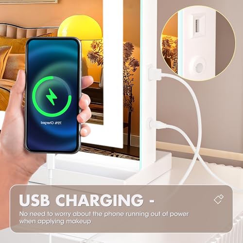 Hasipu バニティミラー ライト付き 100 x 75cm LED メイクアップミラー、調光可能な3つのモードを備えた照明付きメイクアップミラー、タッチスクリーンコントロールバニティミラー スクエアホワイト