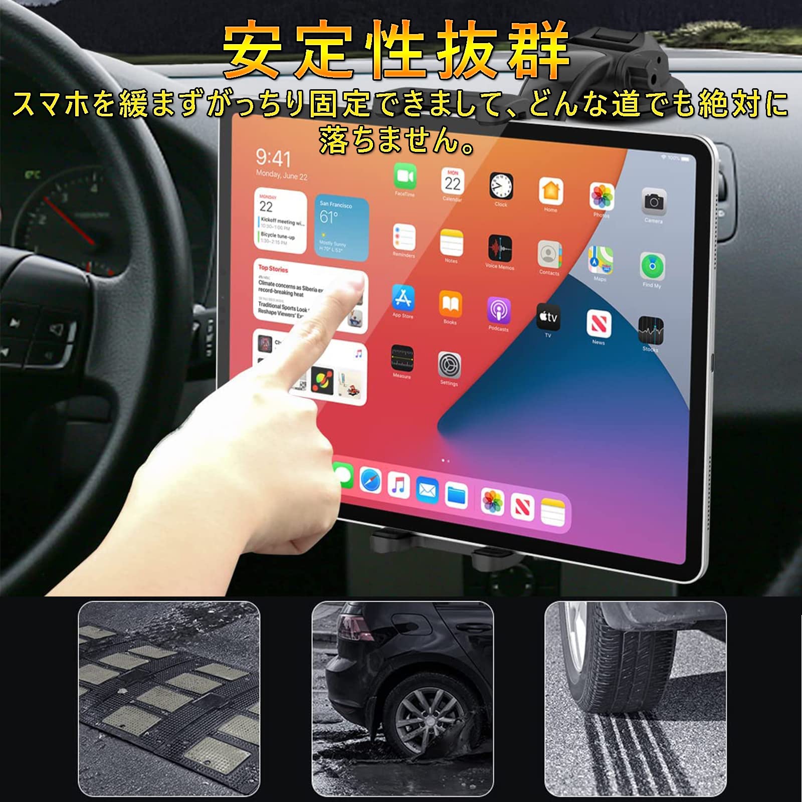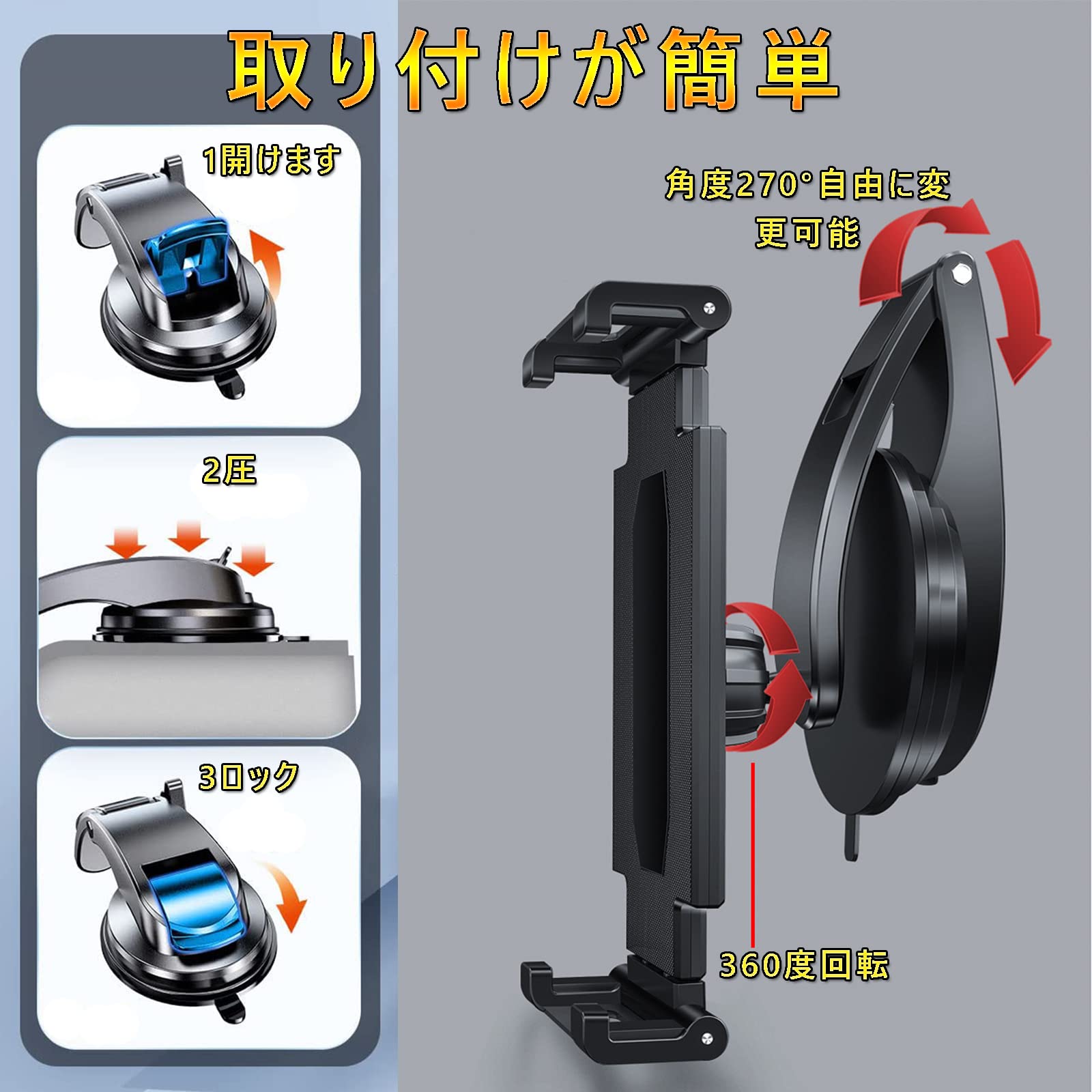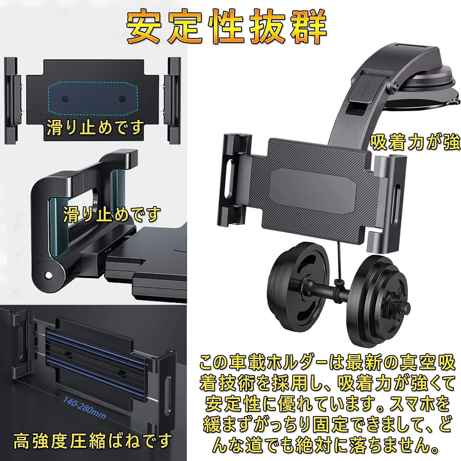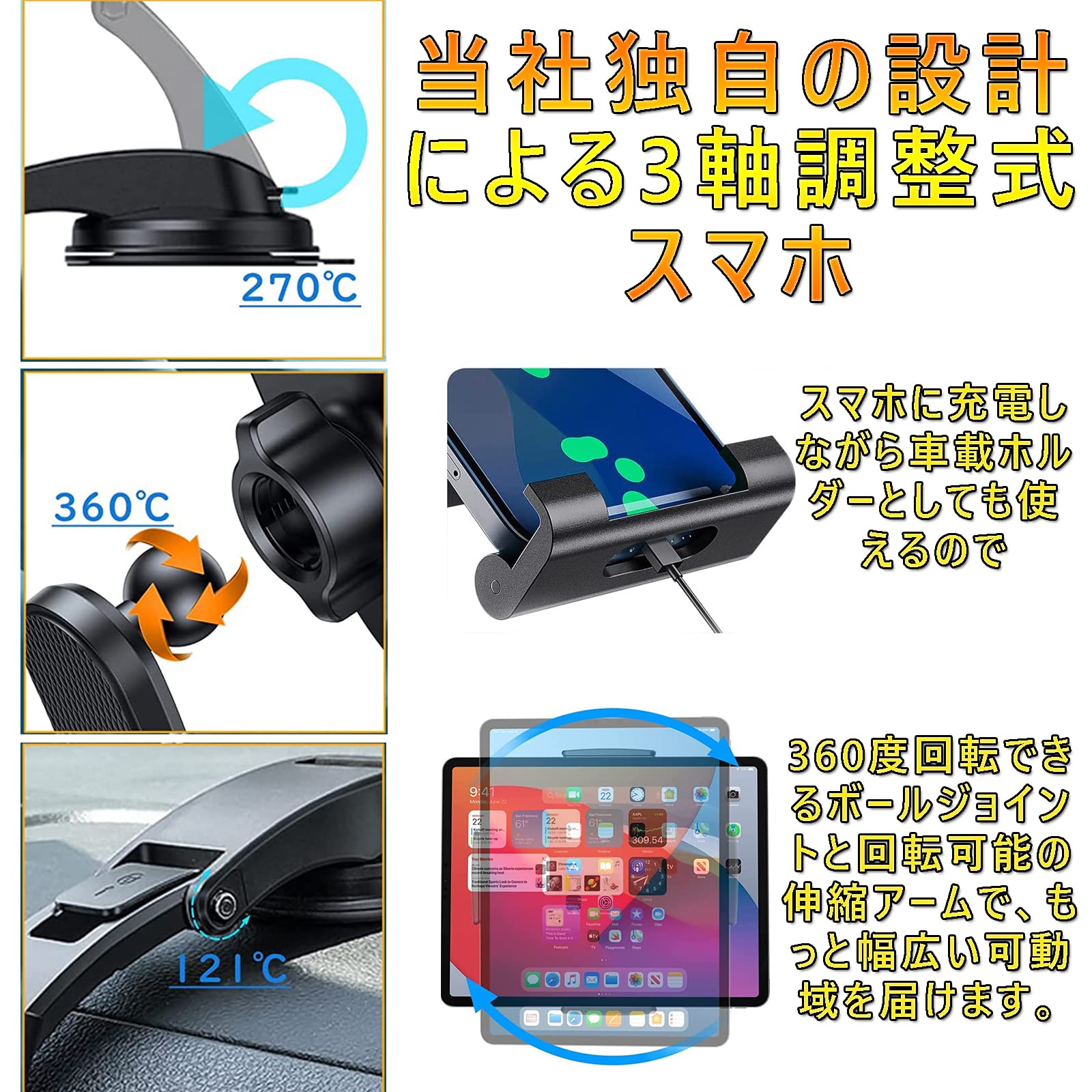 Elnicec 車載 吸盤式タブレットホルダー 【2026最新改良型】ipad スマホホルダー 車 ダッシュボード用 超強力粘着ゲル+真空吸盤 360度回転 自由調節 伸縮アーム 取り付け簡単 5.5~11インチ全機種対応 日本語説明書付き
