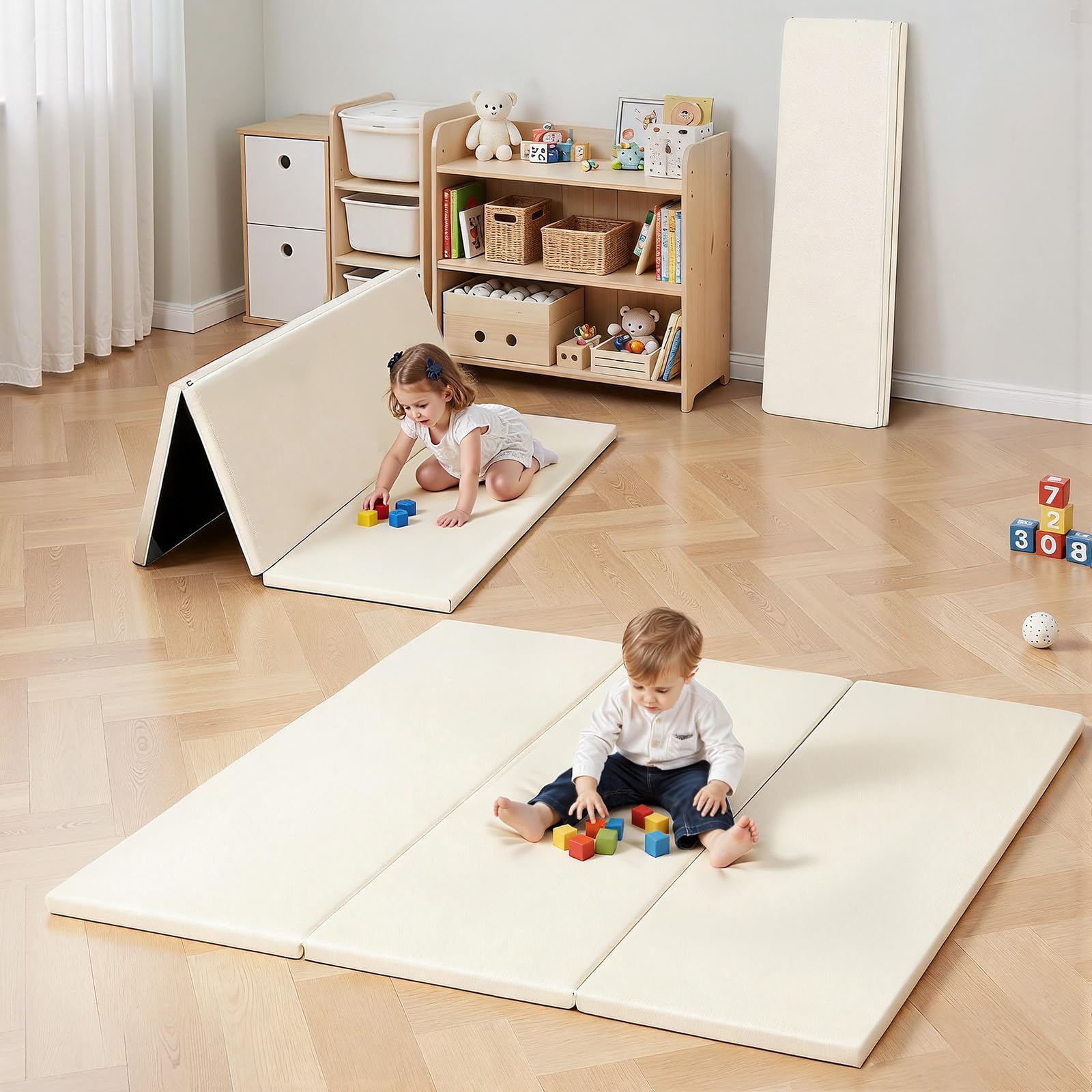 ベビーマット 121×121×3cm プレイマット 折りたたみ 厚手クッション PUレザー 防水仕様 防音対策 すべり止め加工 フロアマット 赤ちゃん用 お昼寝マット 室内 屋外 ベージュ