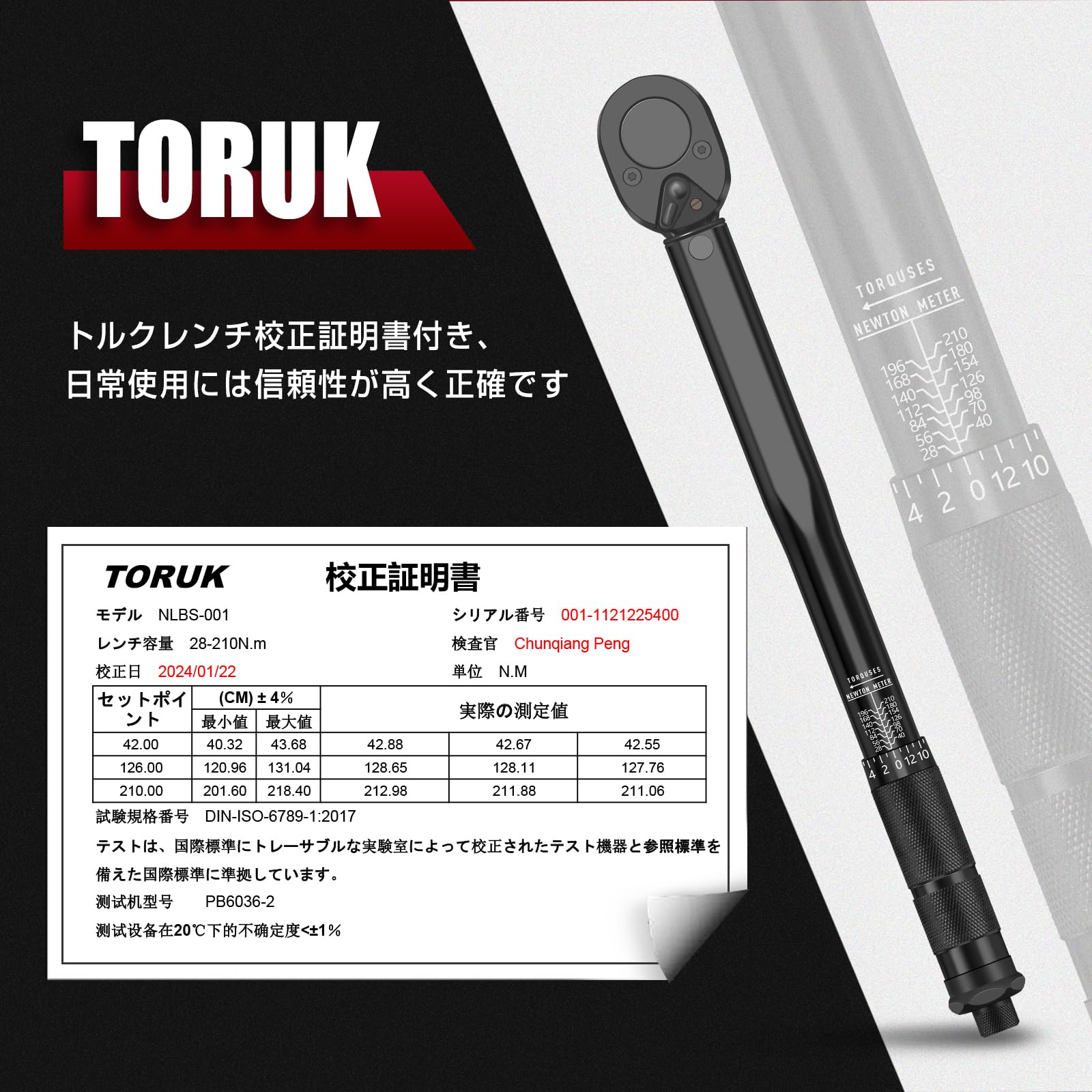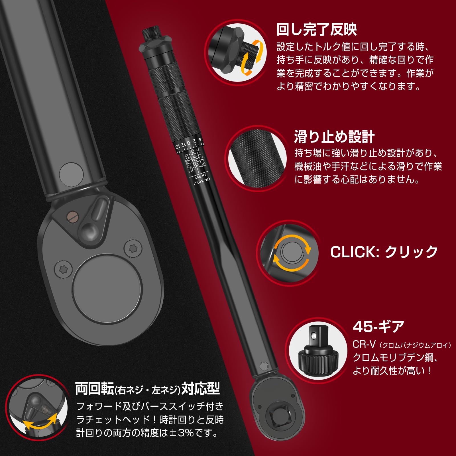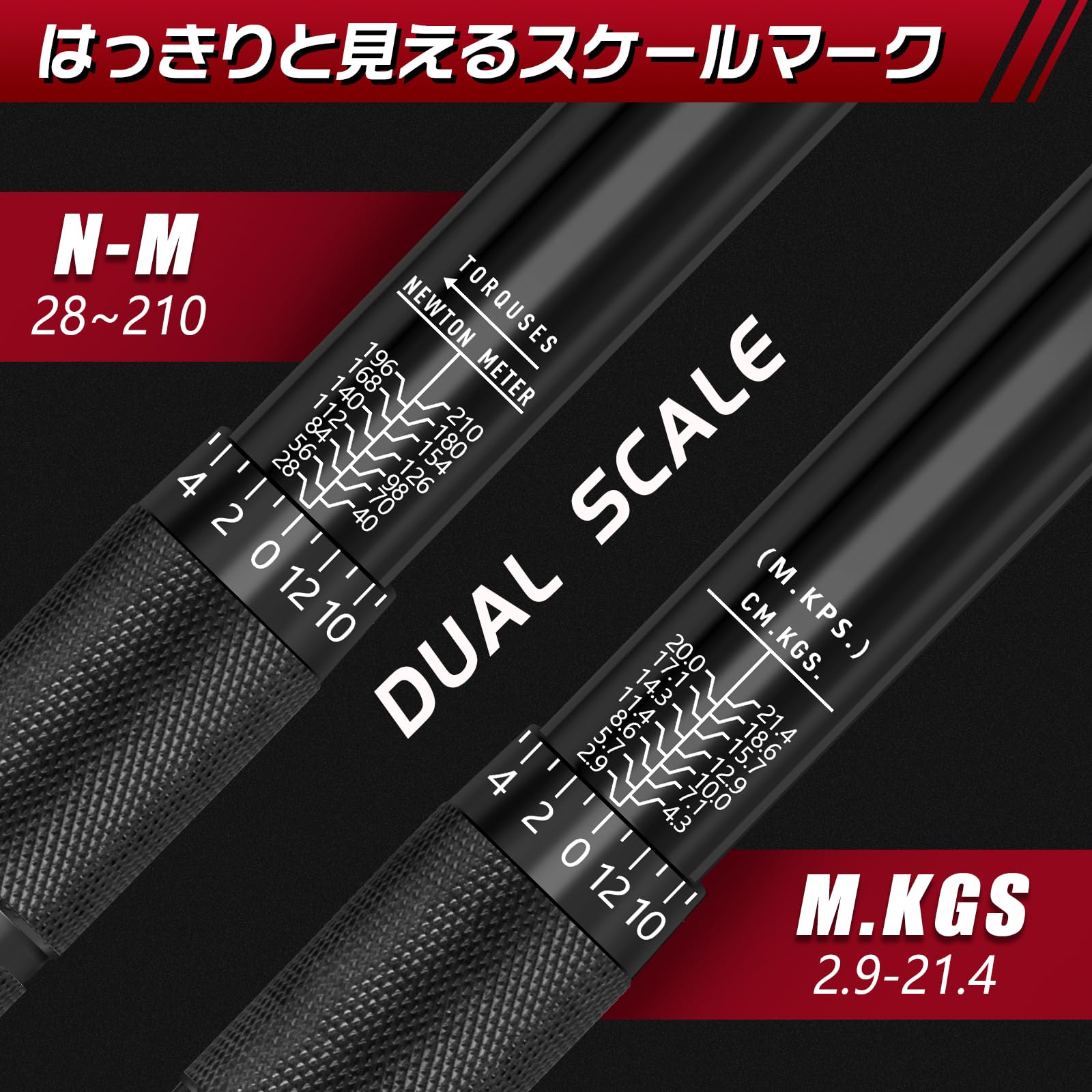 DIY、タイヤ交換などで使うには最適なトルクレンチ! 測定範囲の広いプレセット型なので、これ一本でほとんどの締付けを行える。 防錆および滑り止めのためのナーリングハンドル、握り心地がよくて、使いやすいです。 レーザー加工した目盛りとつや消し加工なため、トルクレンチの目盛 がとても読みやすくて、トルク変更は目盛によって容易に行え、耐食も優れて腐食という悩みがない。