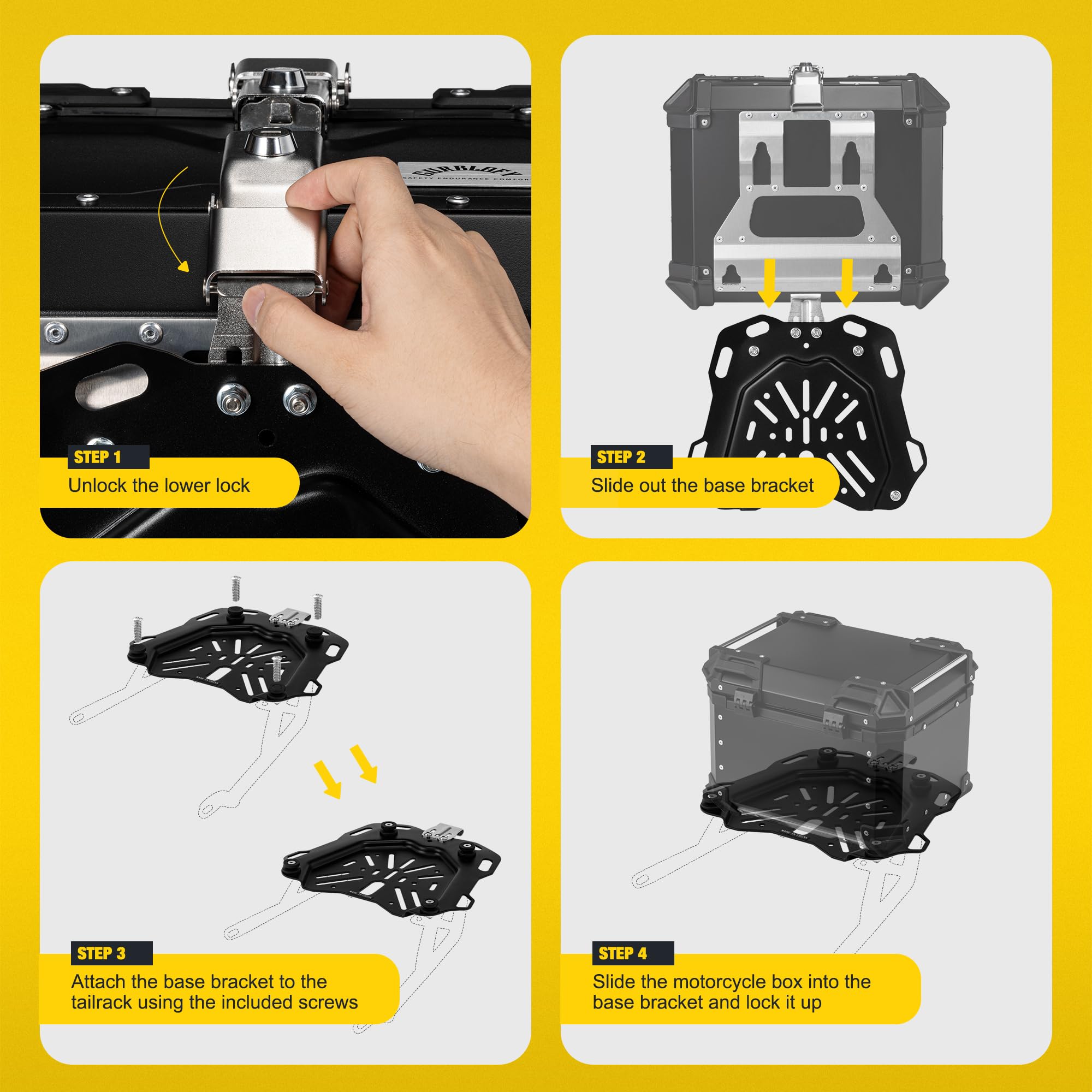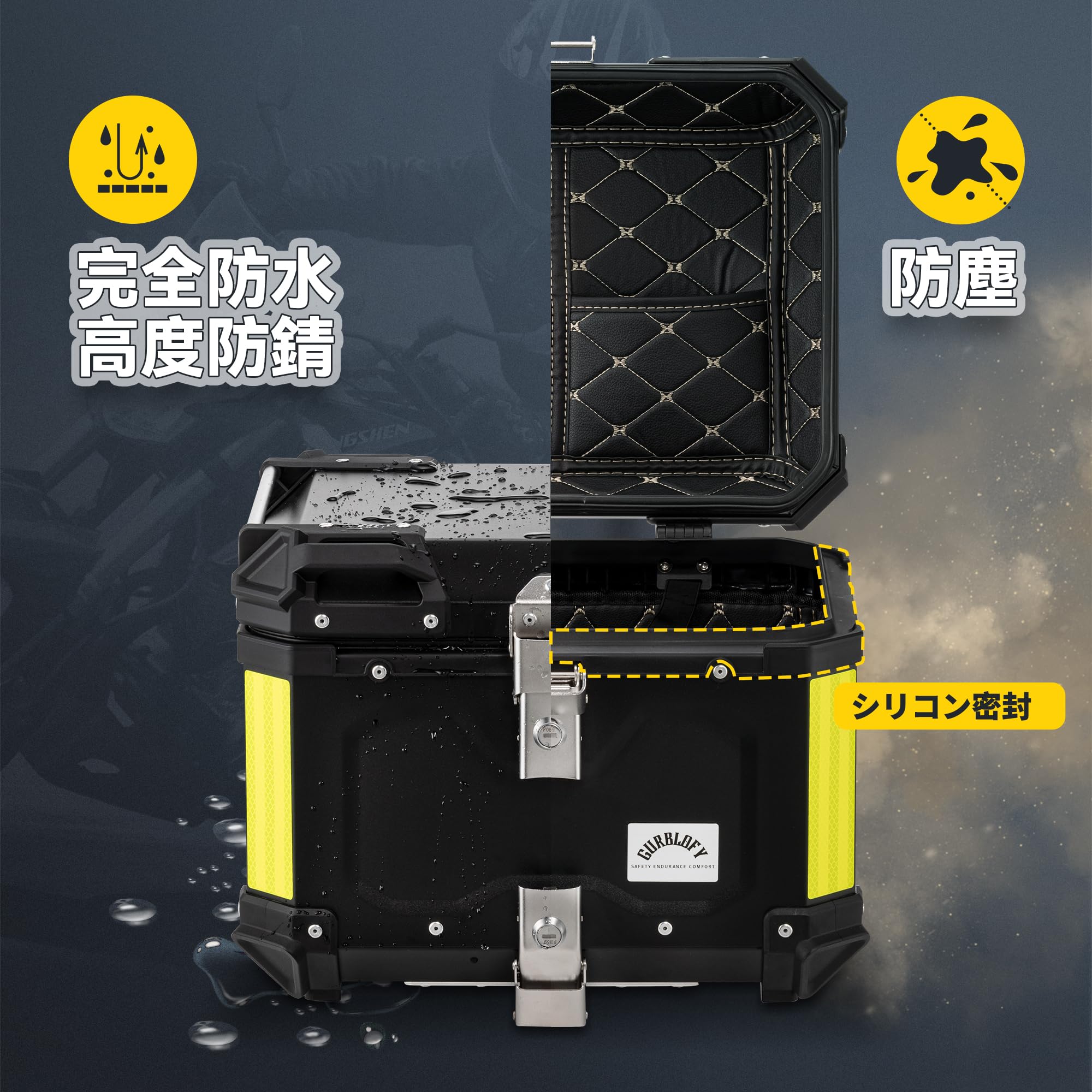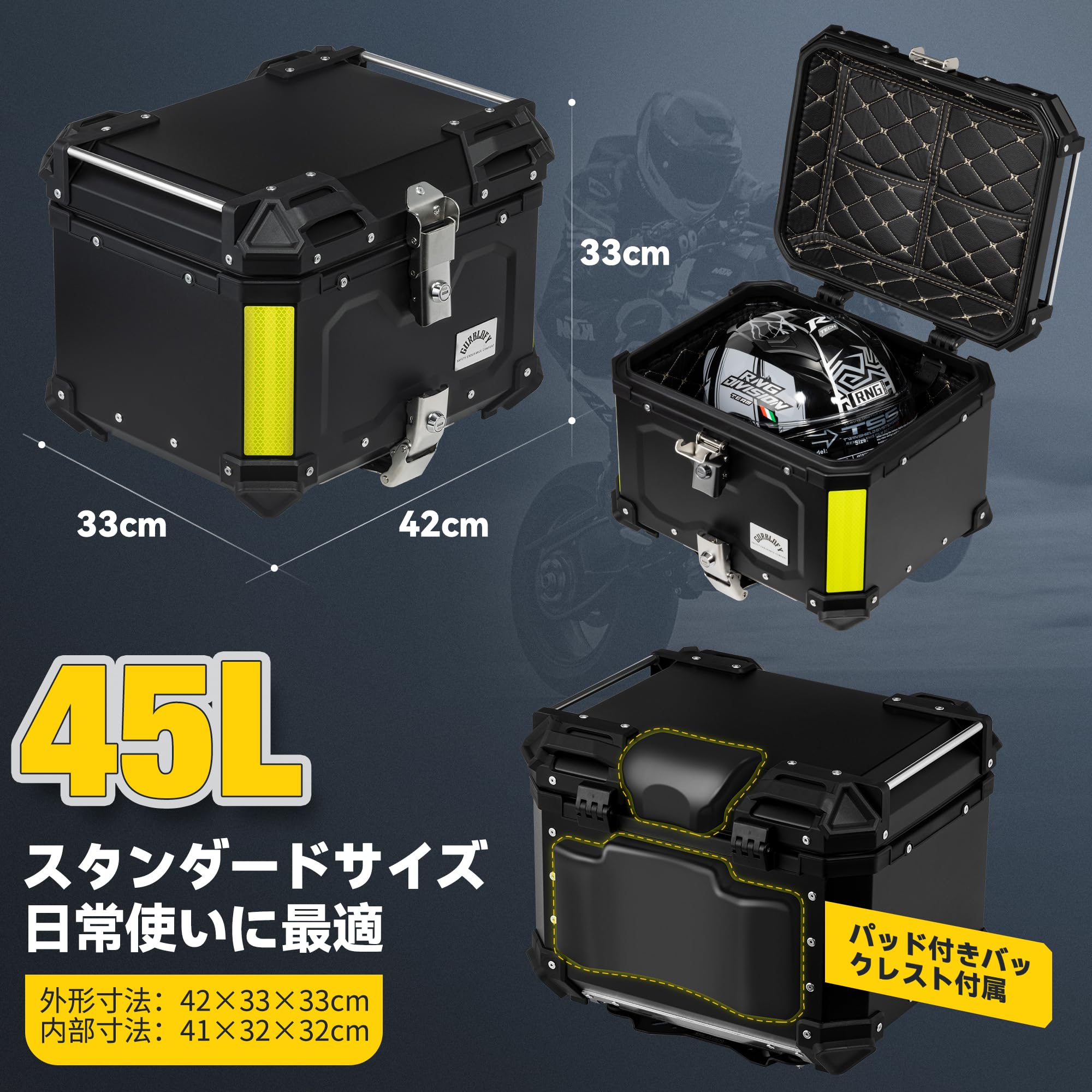 【45L】GURBLOFY バイクボックス トップケース アルミ製 防盜ロック 防水 防塵 ブラック 取り付けベース付属 バッククッション付き 簡単取り付け 大容量 GBTC-45BL-JP