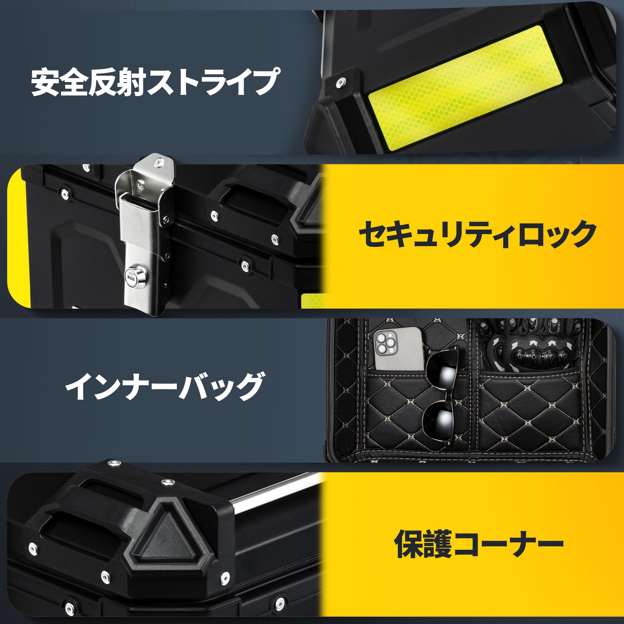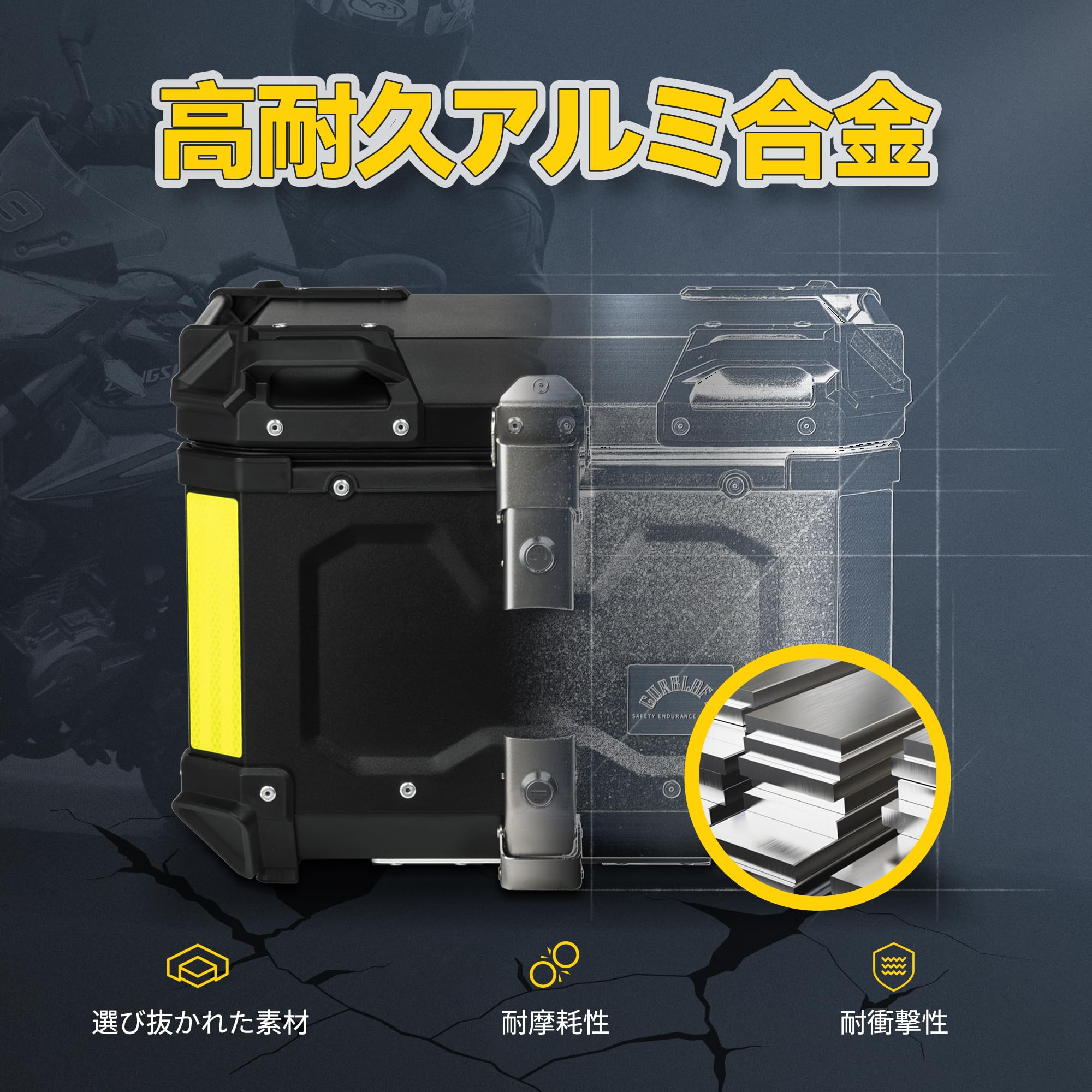 バイク用リアボックス リアボックス 45L 大容量 トップケース バイクボックス オートバイボックス パニアケース バイク用 バイクケース ハンターカブ用 汎用 防水防塵 簡単脱着 取り付けベース付き キーロック可能 防犯対策 鍵2本付 反射テープ付き アルミ製