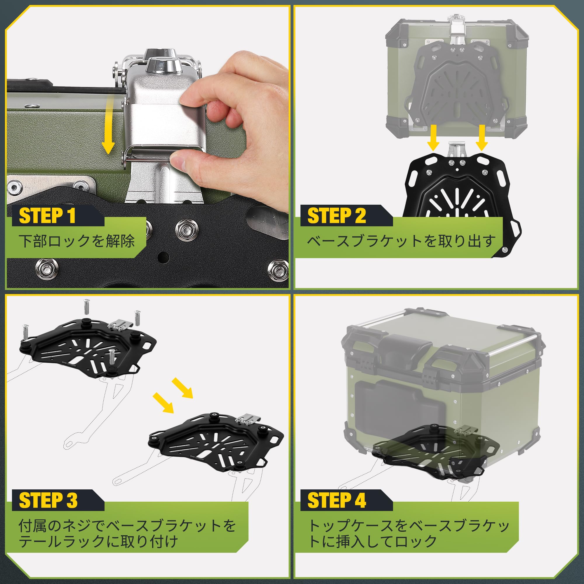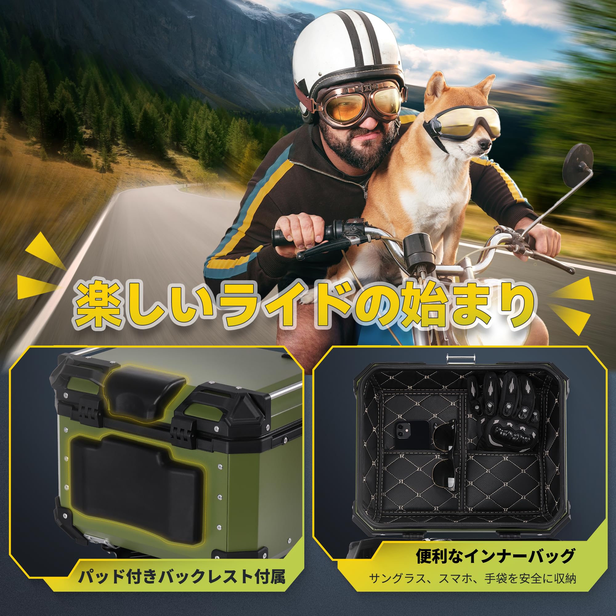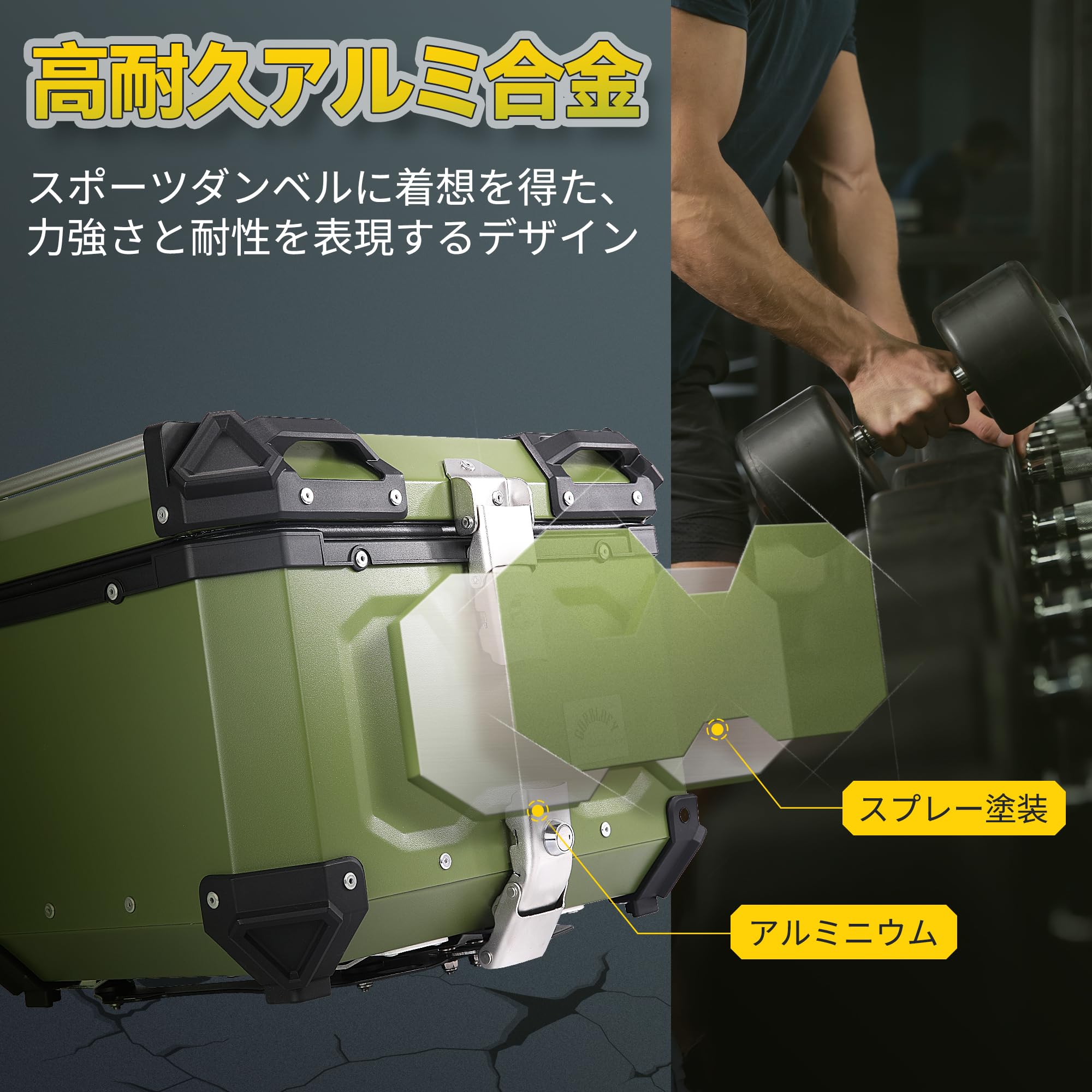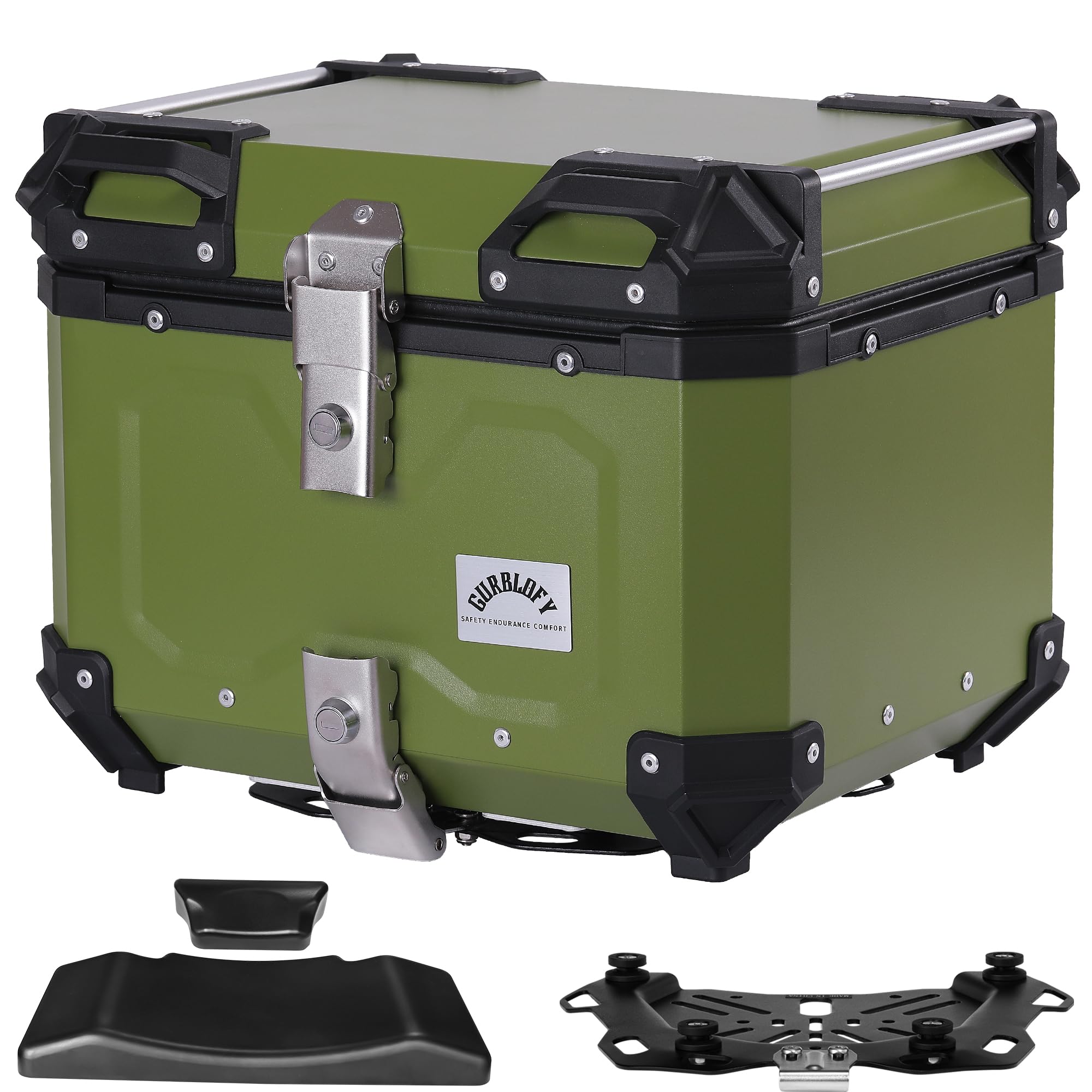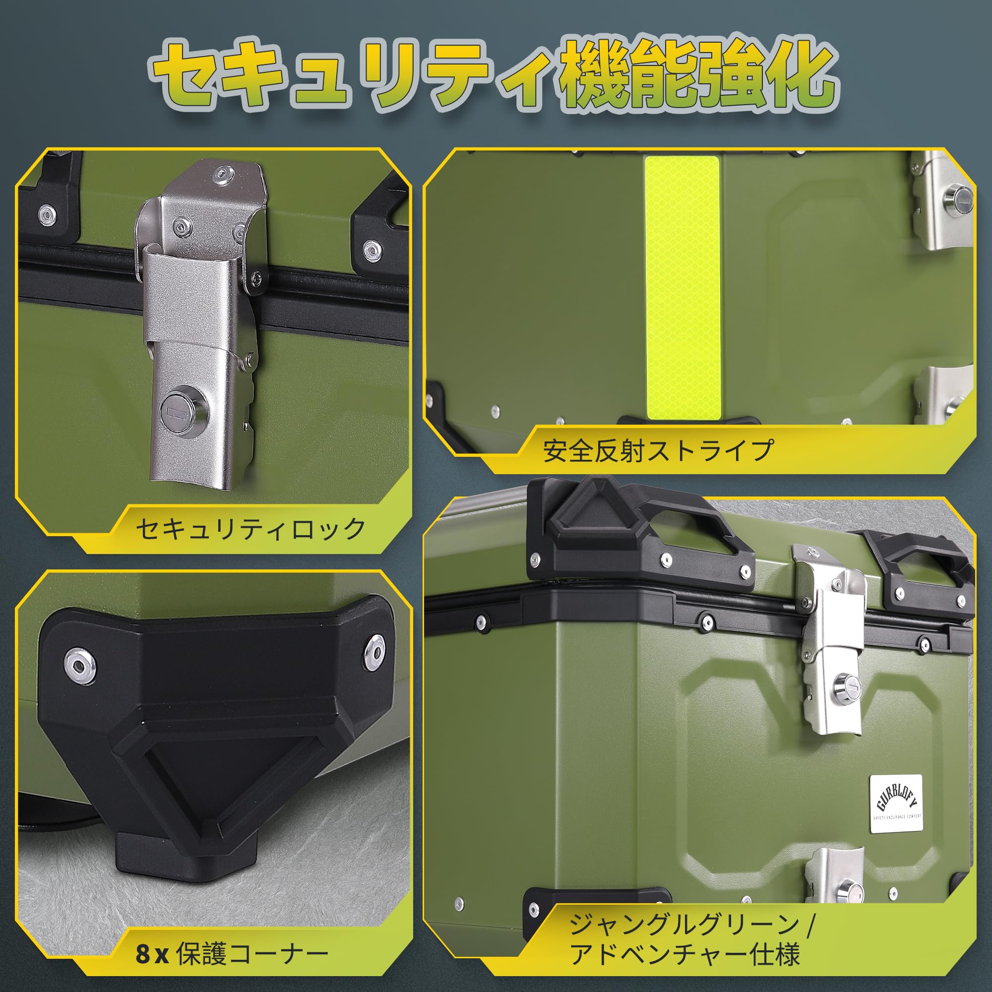 【 45L 】 GURBLOFY バイクボックス トップケース アルミ製 防盜ロック 防水 防塵 ジュングルグリーン 取り付けベース付属 バッククッション付き 簡単取り付け 大容量 GBTC-45G-JP