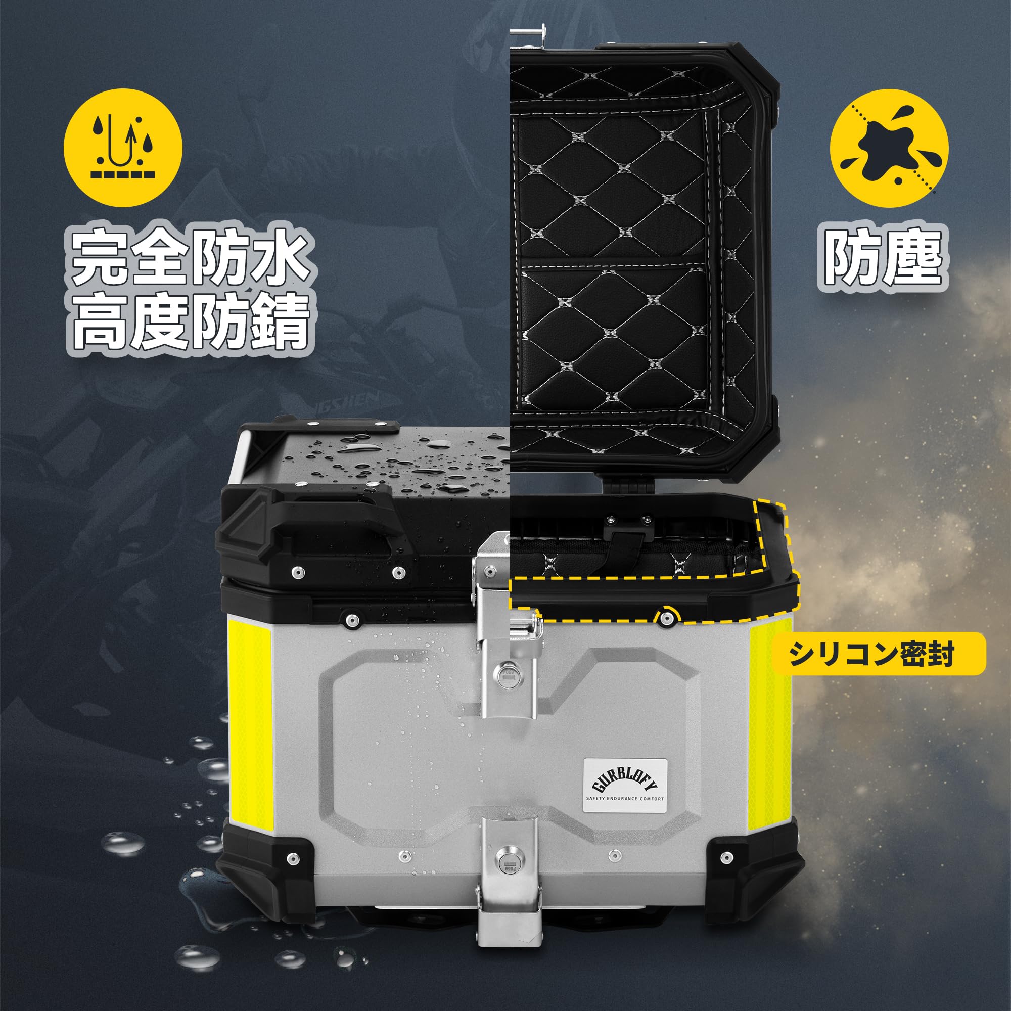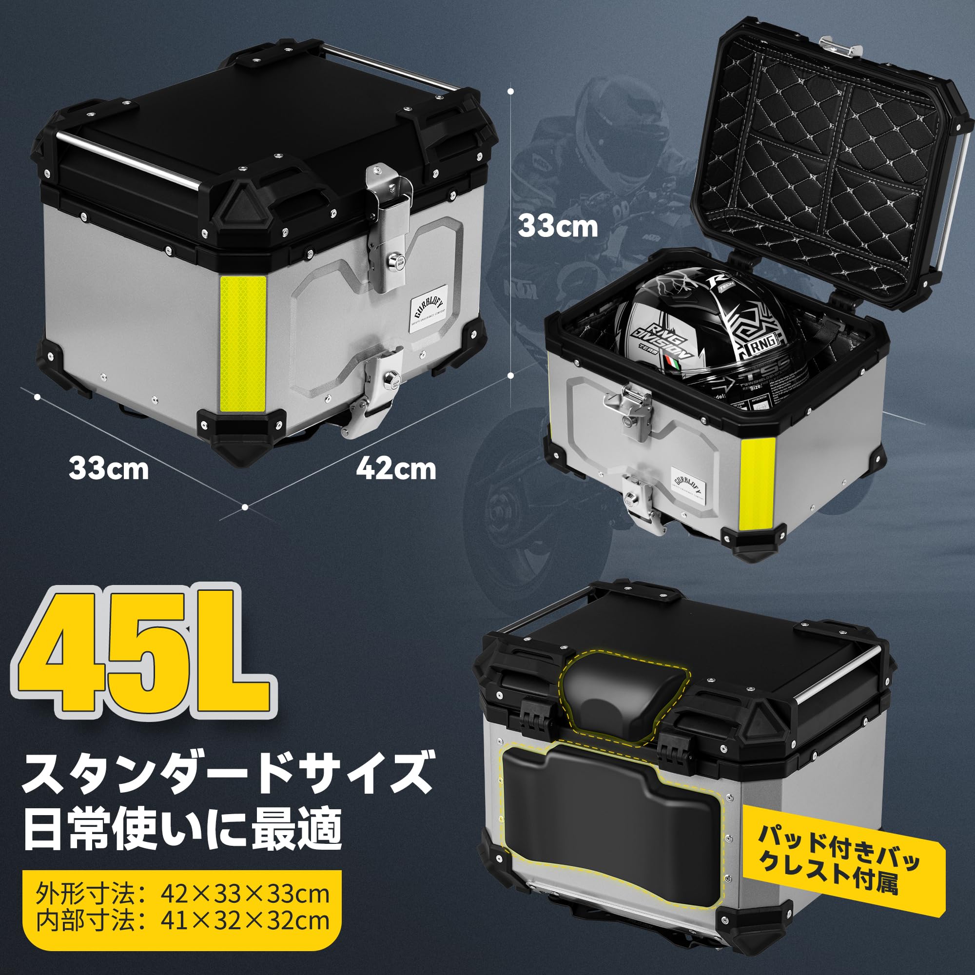 【45L】GURBLOFY バイクボックス トップケース アルミ製 防盜ロック 防水 防塵 シルバー 取り付けベース付属 バッククッション付き 簡単取り付け 大容量 GBTC-45S-JP