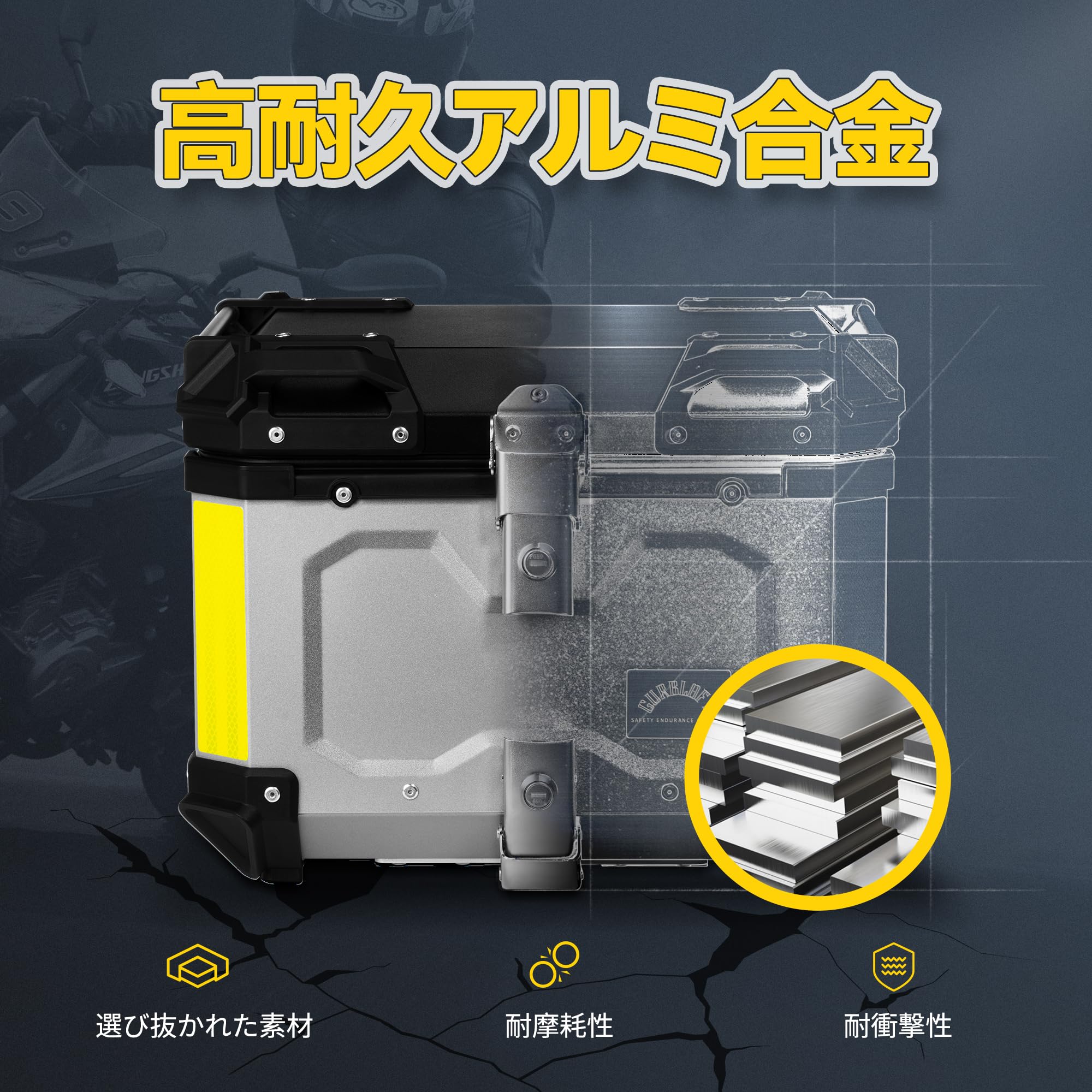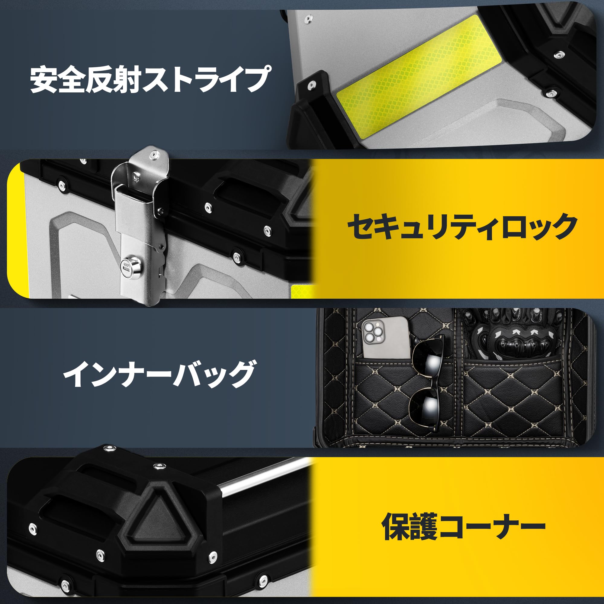 バイク用リアボックス リアボックス 45L 大容量 トップケース バイクボックス オートバイボックス パニアケース バイク用 バイクケース ハンターカブ用 汎用 防水防塵 簡単脱着 取り付けベース付き キーロック可能 防犯対策 鍵2本付 反射テープ付き アルミ製