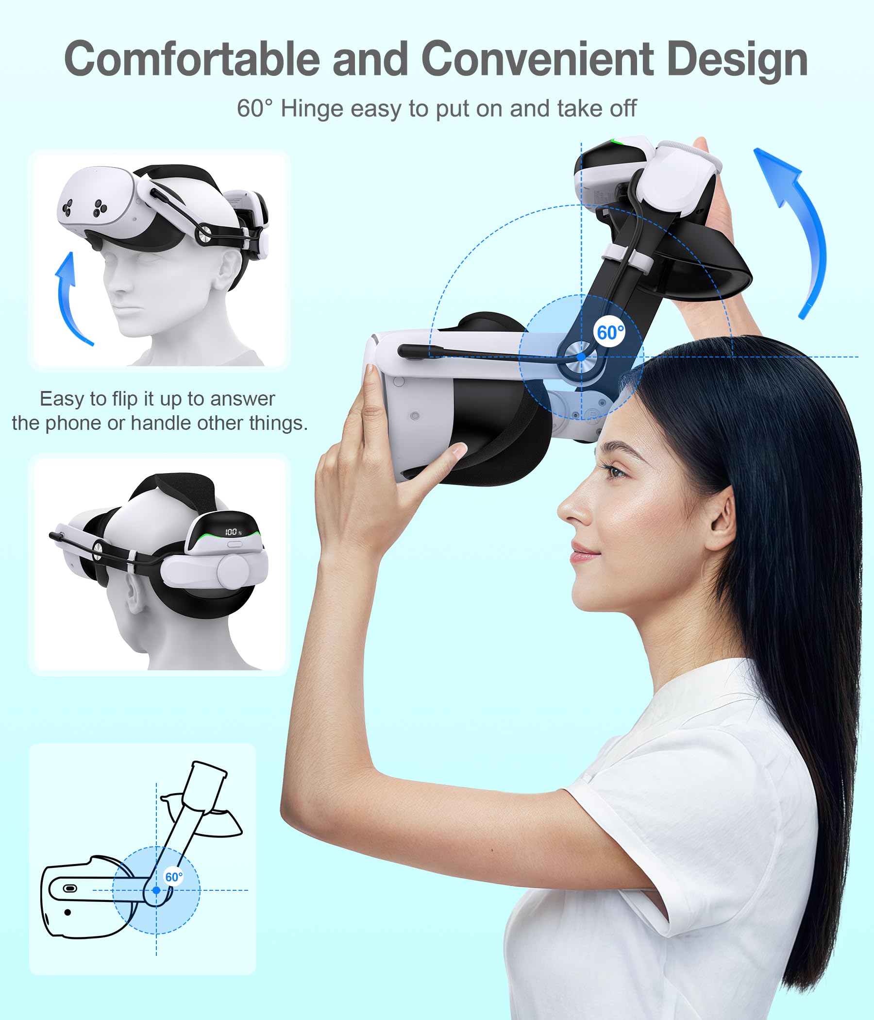 Elekasumi Quest 3S/Quest 3/Quest 2用ヘッドストラップ 6700mAh磁気バッテリー ダブルノブで簡単に調整可能 VRヘッドセット 45°フリップヒンジ 高速充電 圧迫感を軽減し 軽量&通気性 VRヘッドバンド プレミアムクッション付き