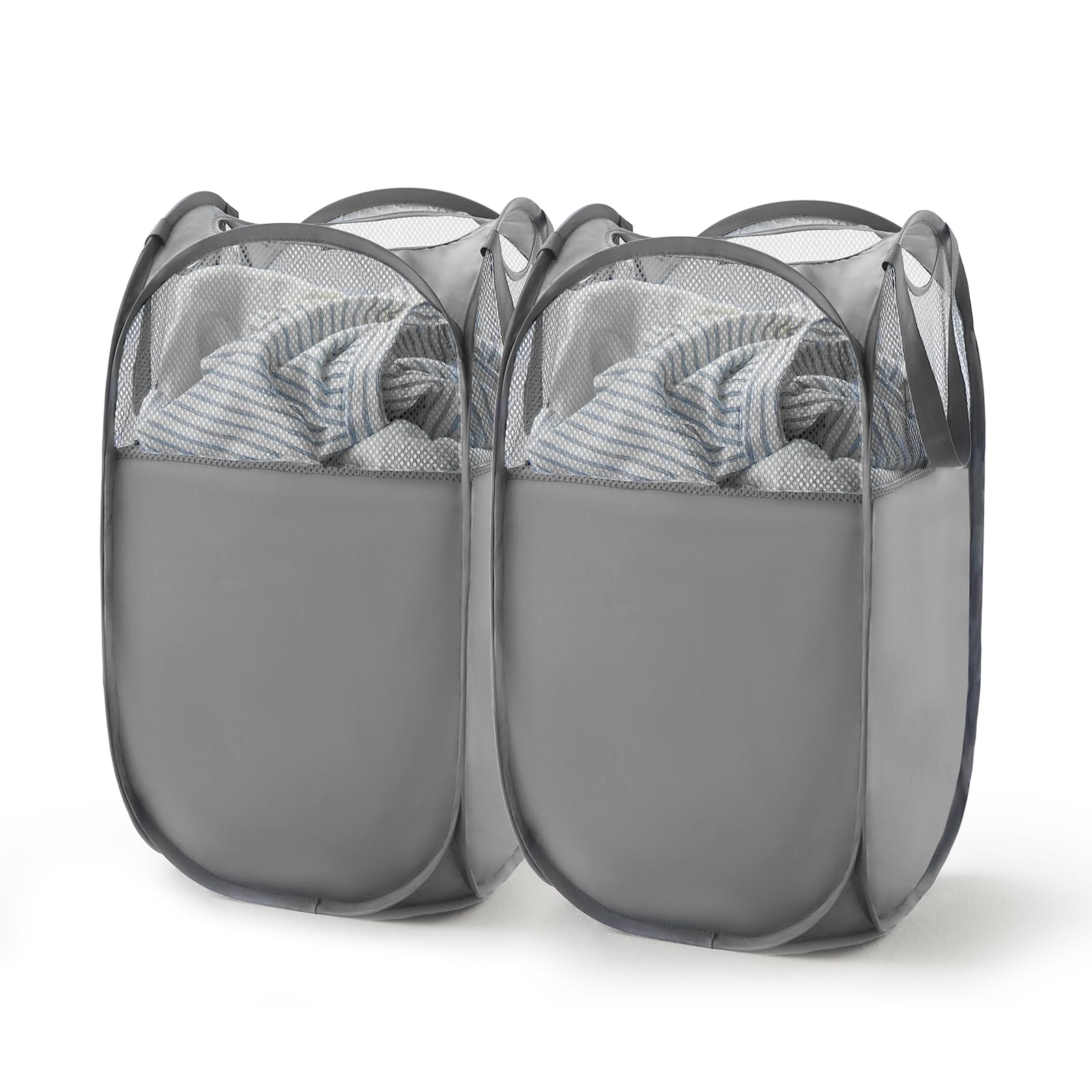 TECHMILLY ランドリーバスケット 折りたたみ 洗濯かご 洗濯カゴ 大容量 71L メッシュ ポリエステル 省スペース 取っ手付き 洗濯籠 ランドリー収納 ランドリー バスケットランドリーバッグ 自立 縦型 脱衣カゴ 収納 洗濯物 袋 かご 持ち運び可能 おしゃれ 軽量 旅行 ゴミ箱 (グレー・ポリエステル、2PCS)