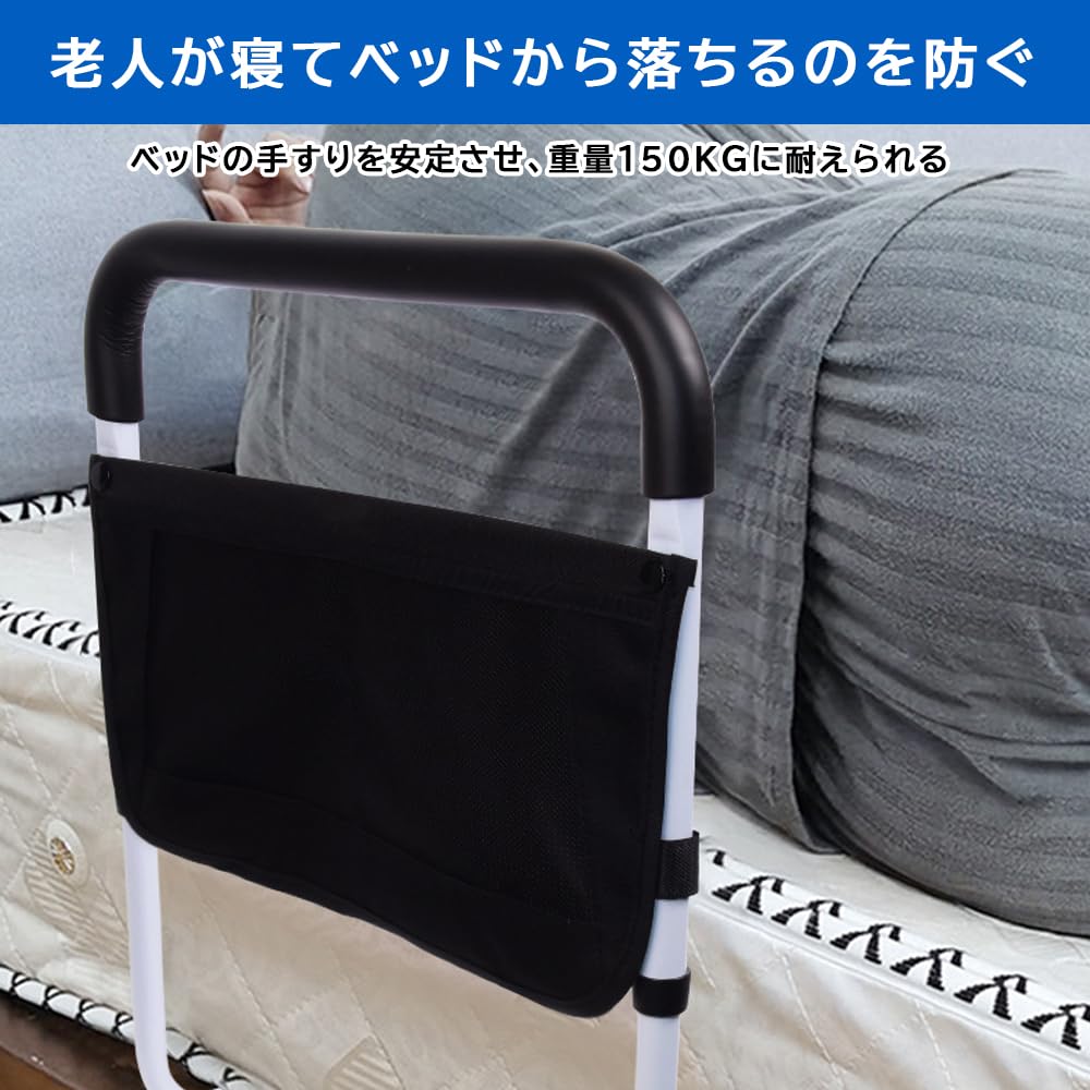 Frezon ベッドガード 介護用品 ベッド用手すり 起き上がり手すり耐荷重 158kg、収納ポケット付き 滑り止めラップマット、転落 防止 起き上がり補助 折りたたみタイプ 、組み立て簡単 軽量 高齢者 および移動が困難な方々に適しています 安定性