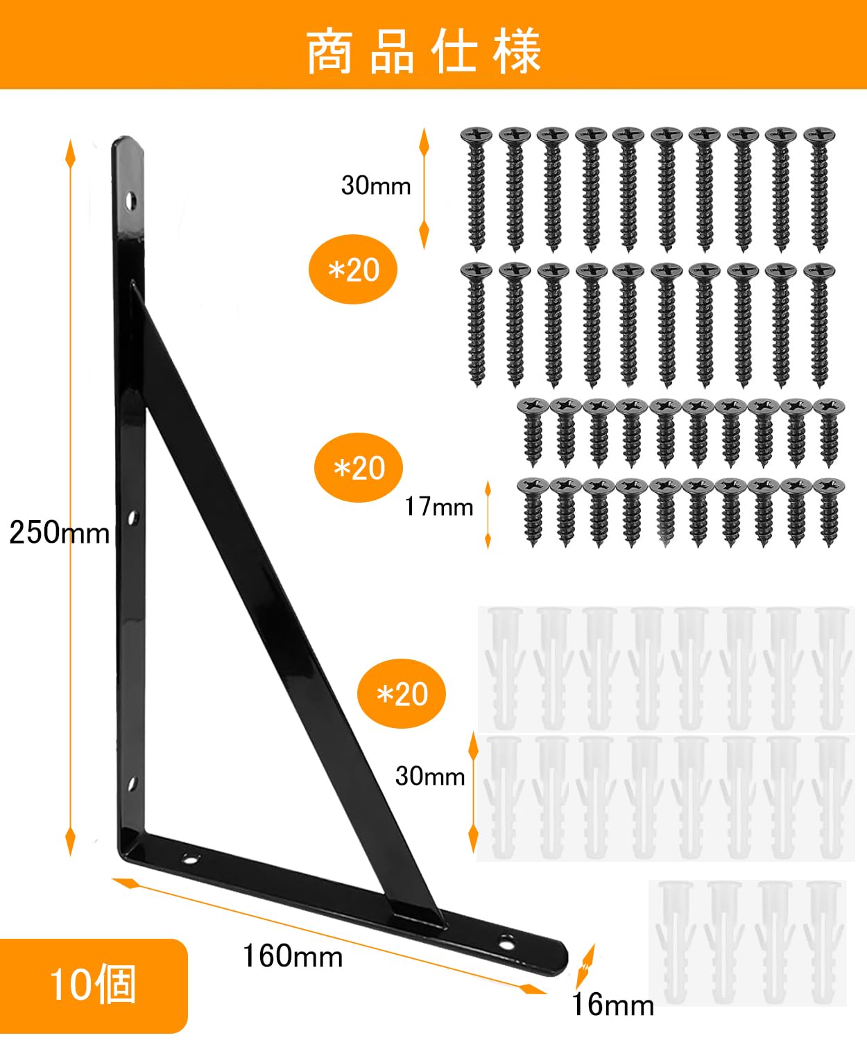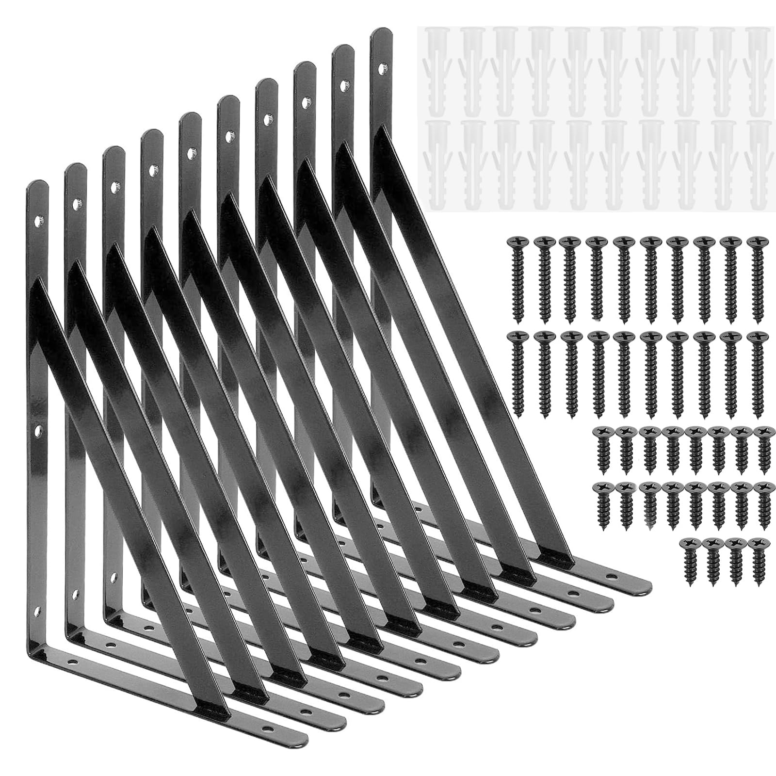 TerraShine 棚受け 10本セット 棚受け金具 棚支え アイアンブラケット L字型 耐荷重50kg 耐久性 省スペース 壁収納 ビス付き DIY 収納(ブラック-250*160mm)