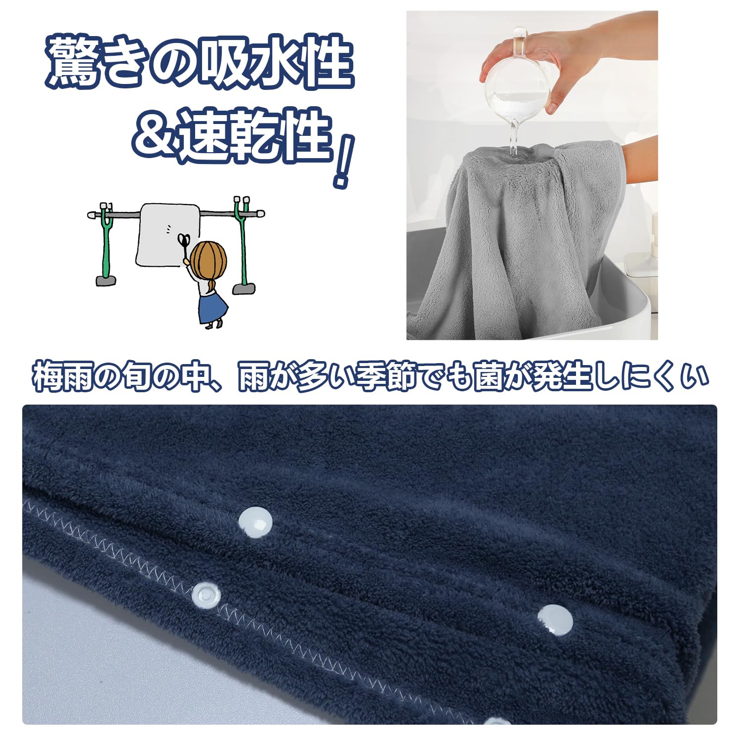 バスタオル マイクロファイバー タオル 大判 70X140cm ふわふわ 柔らかい 瞬間吸水 速乾 耐久性 抗菌 防臭 3枚セット (70X140㎝, ブルー+グレー+ブラウン)