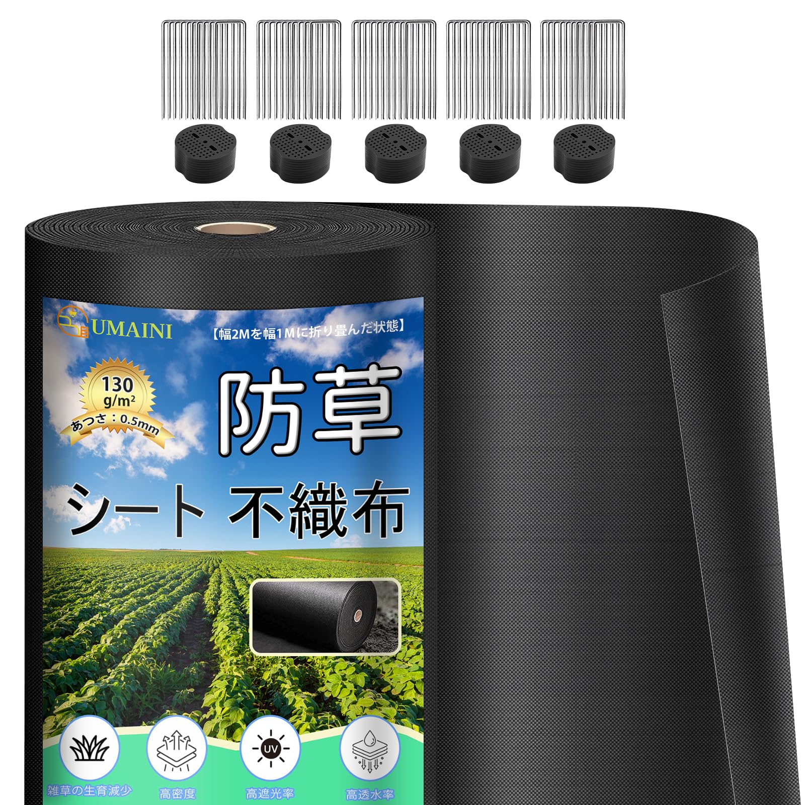 防草シート 除草シート 1m×50m 不織布 雑草防止シート 高透水 高耐久 高密度 ぼうそうしーと 防そうシート 厚手 10年耐久 工事用 園芸用 人工芝下 固定ピン50本と黒丸50枚付き