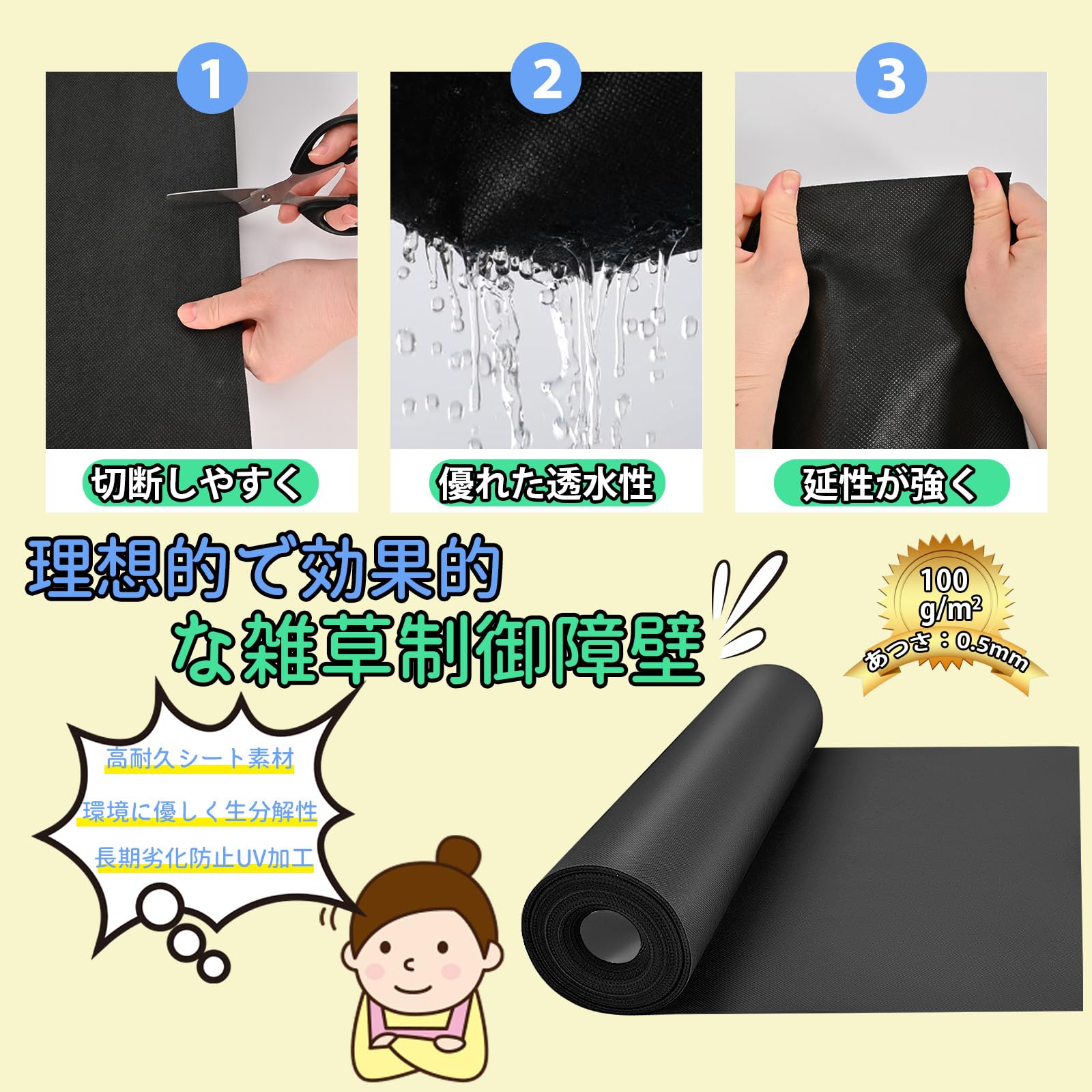 防草シート 厚手 高耐久 1×10M シート防草 不織布 除草シート補修テープ 雑草防止シート固定ピン10本と黒丸10枚付き 家庭菜園 農業 工事用 園芸用 人工芝下 (ブラック)