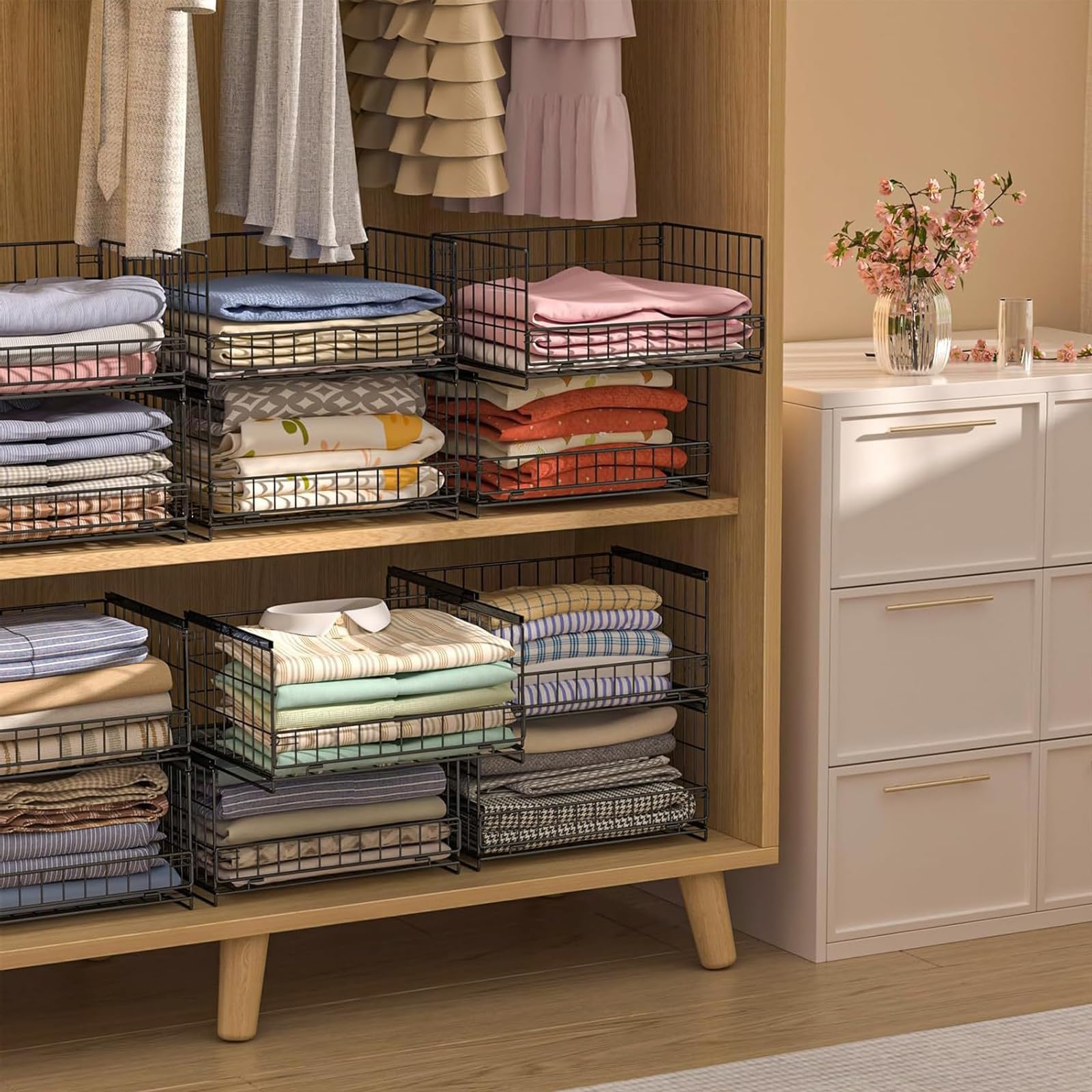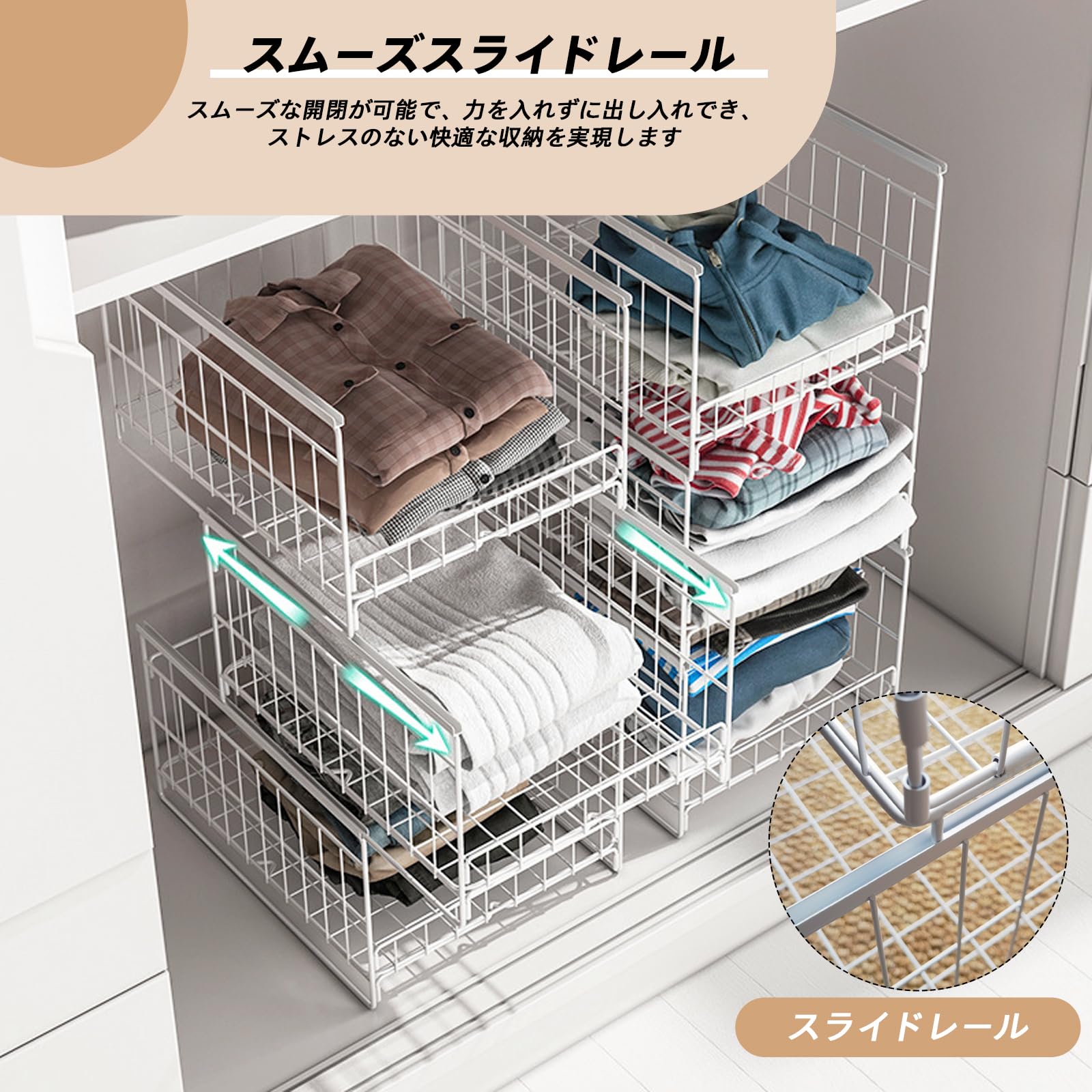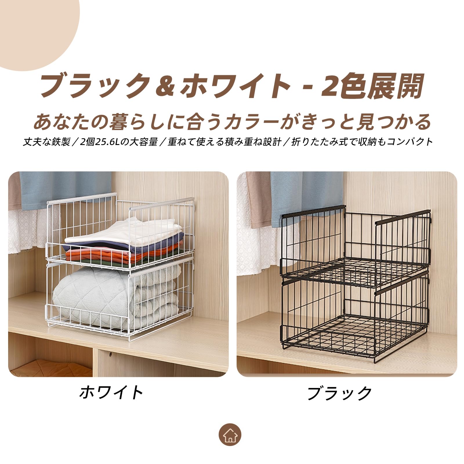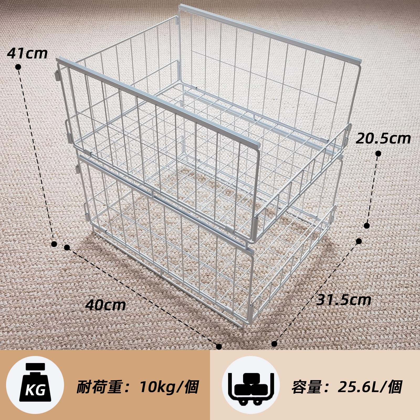 NATTY NING【スライド引き出し式 収納バスケット】大容量25.6L×2個組 折り畳み式 積み重ね可能 鉄製 メッシュ可視化 簡単組立 押入れ クローゼット収納 ワンタッチ引き出し ブラック (41×30.5×20.5cm)