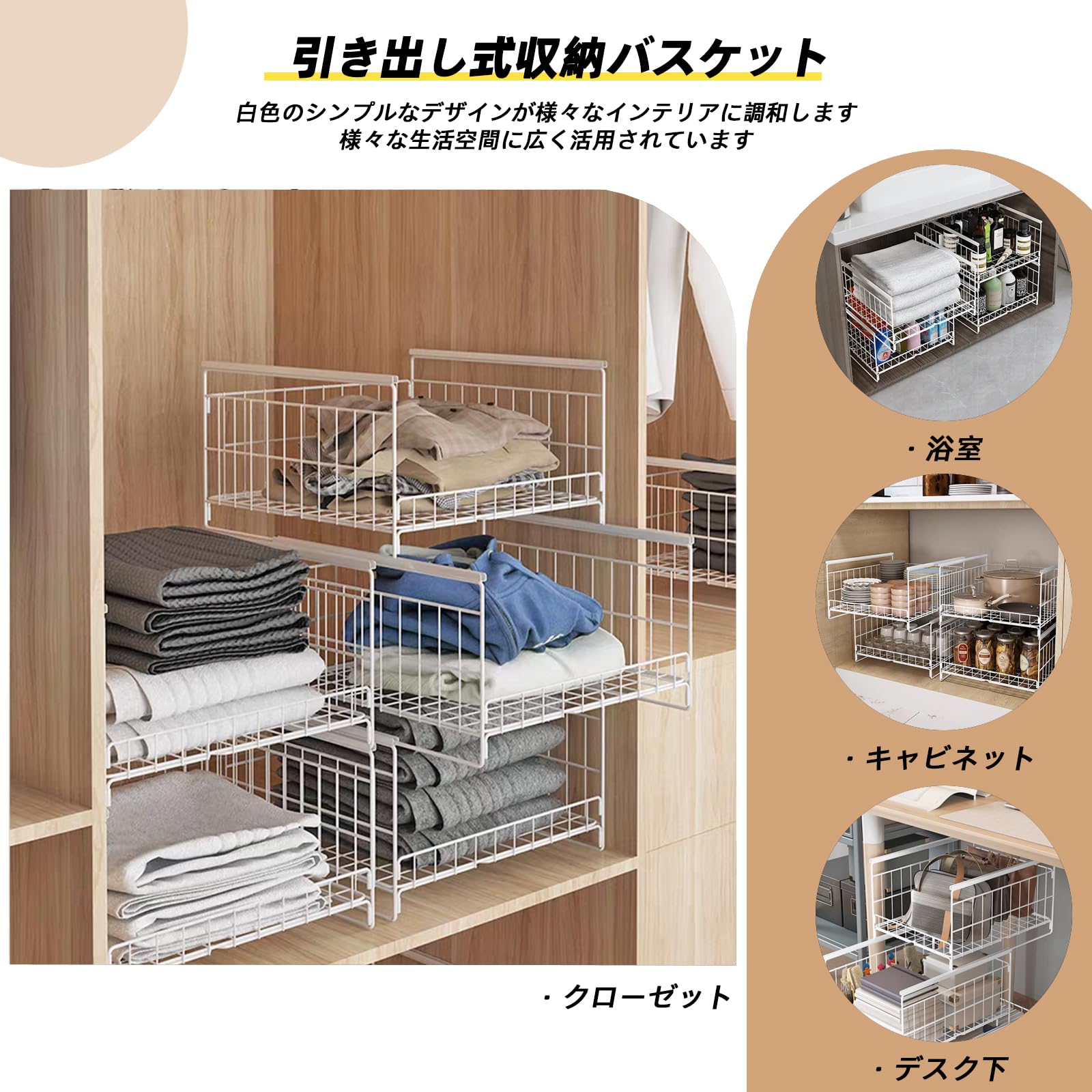 yazi 3個セット 収納ボックス 木製取っ手付き プラスチック おしゃれ ポリプロピレン 収納ケース ホワイト 小物入れ 整理バスケット 文房具・衣類収納 キッチンシンク下収納かご SML・3サイズ 完成品 (木製取っ手3個セット)