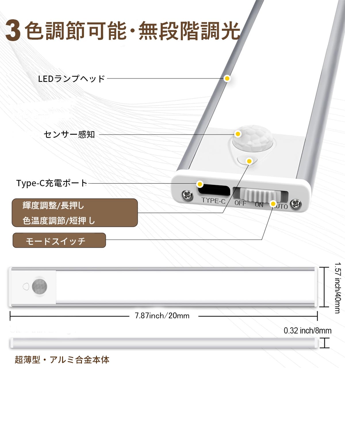 人感センサーライト 室内 じんかんせんさー 充電式 マグネット LEDバーライト 読書灯 棚下 Type-C 充電式 無段階調光 キッチン用 屋内 寝室 廊下 階段 玄関 階段 3000K/4500K/6000K 電球色 昼白色 昼光色調整 20cm 2本