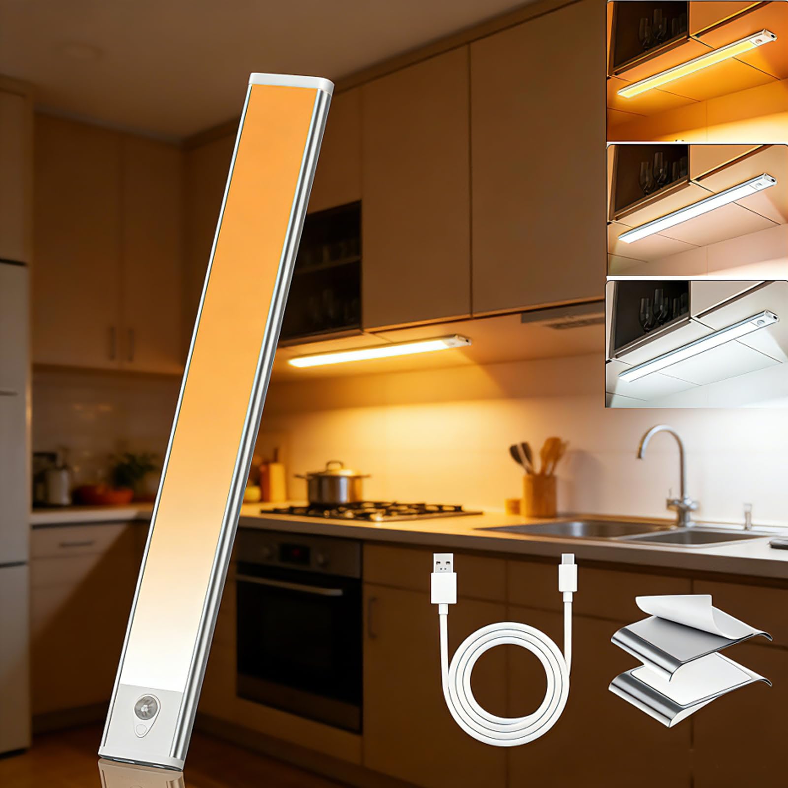 Vividorad 人感センサーライト 20CM LED バーライト 【配線工事不要・3色調光可能】手元灯 足元灯 フットライト 室内 TypeC充電式 超薄型 大容量 省エネ 高感度 広範囲 全天候感知 マグネット付き 玄関/棚/物置/寝室/廊下/キャビネット/部屋 照明用