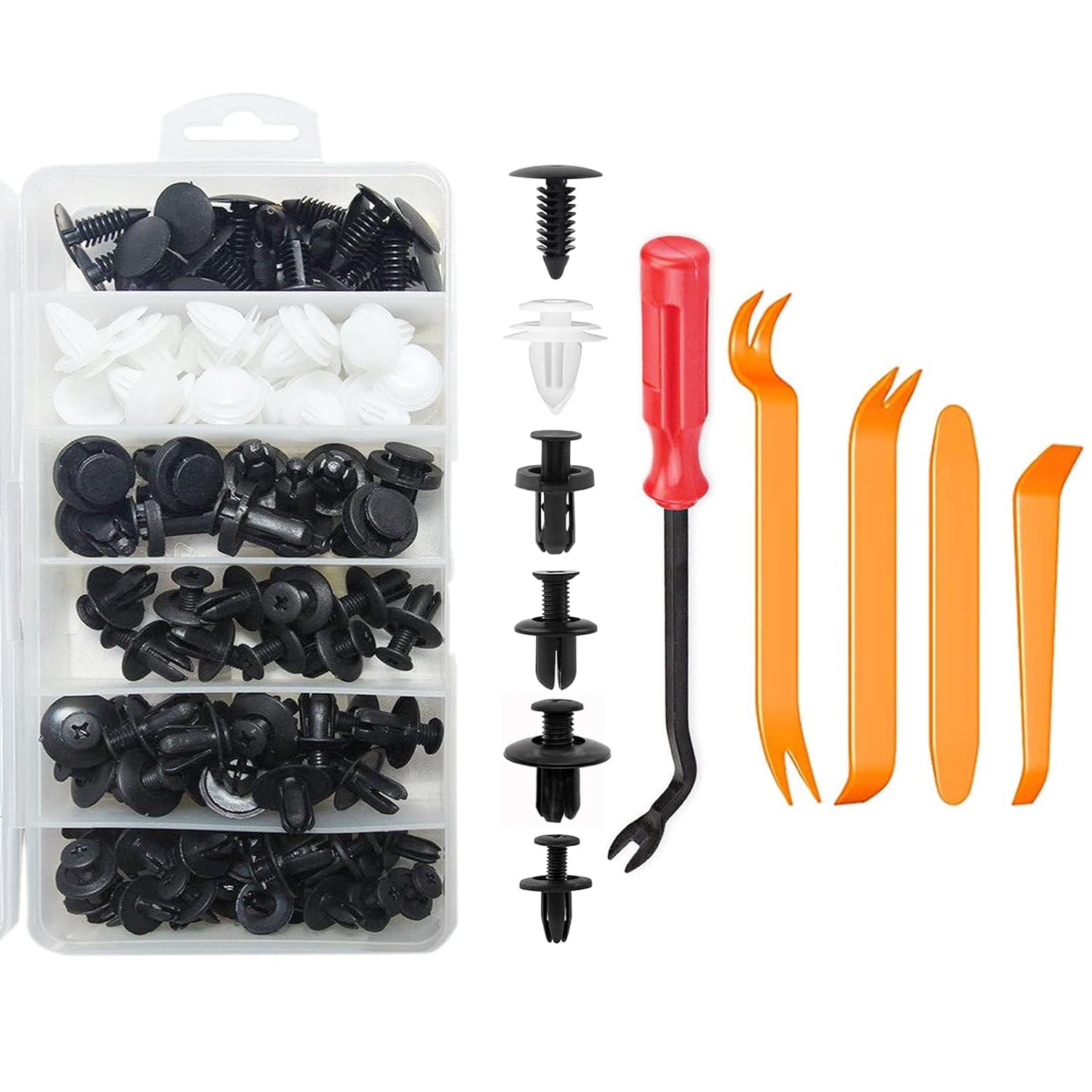 Aikurashi リベット 自動車 フェンダー バンパークリップ プッシュリベット 100個 10種類 ユニバーサル固定用 ナイロン製 押し込み式 車 クリップトリムクリップ リベットセットパネルはがし脱着工具 ホンダ汎用 混合ファスナー 収納ケース付き E6