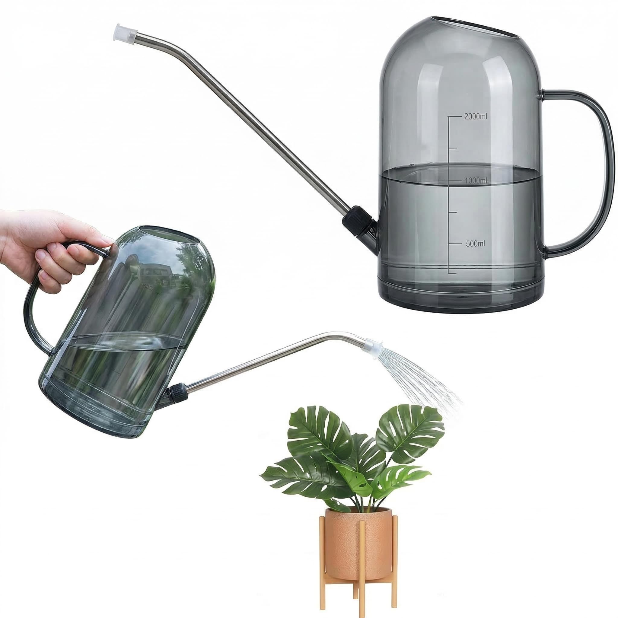 JetWave じょうろ 水差し 園芸 プラスチック製 透明ボディ 目盛り付き 1L容量 金属製23cm長い噴口 観葉植物やガーデニングに最適 園芸用品 (2L-グレー)