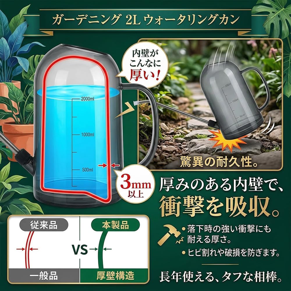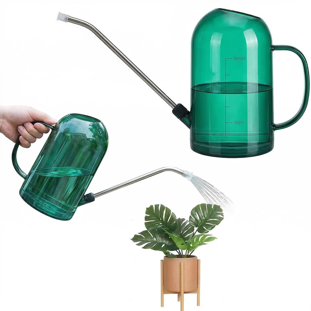 JetWave じょうろ 水差し 園芸 プラスチック製 透明ボディ 目盛り付き 1L容量 金属製23cm長い噴口 観葉植物やガーデニングに最適 園芸用品 (2L-グリーン)